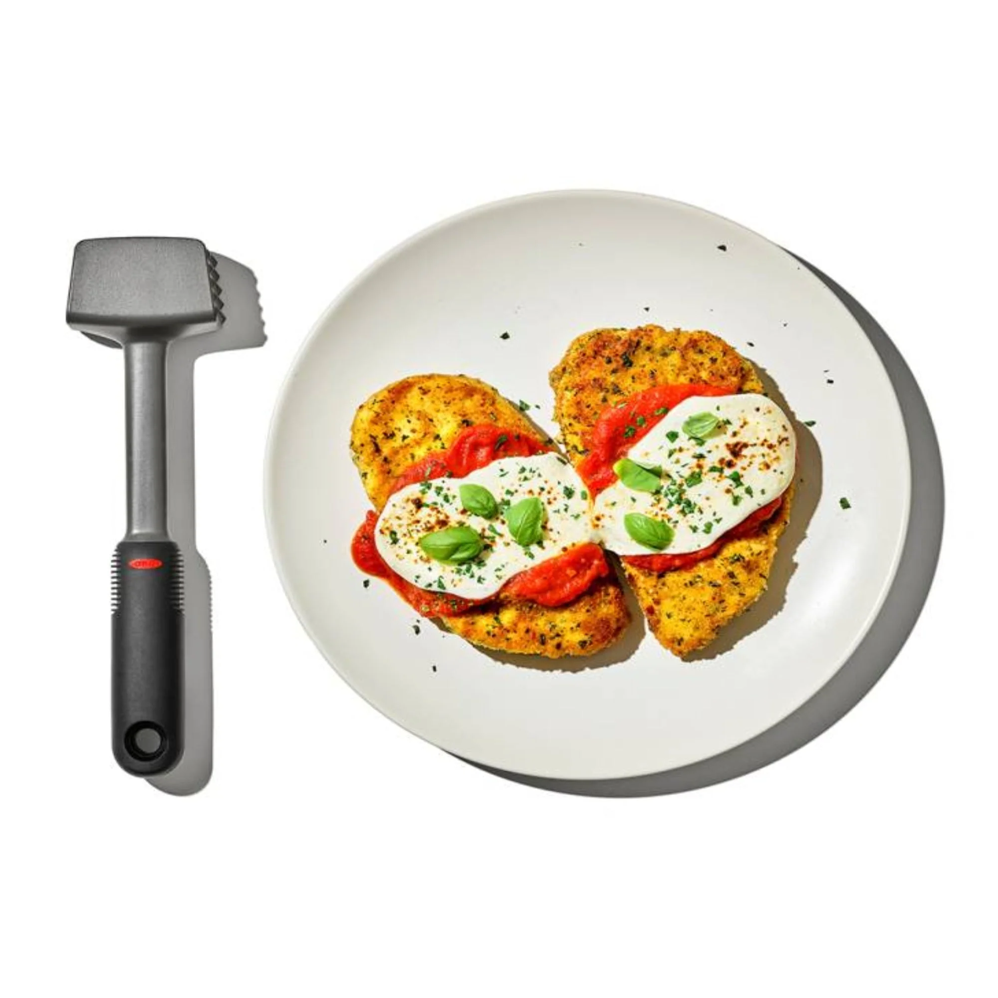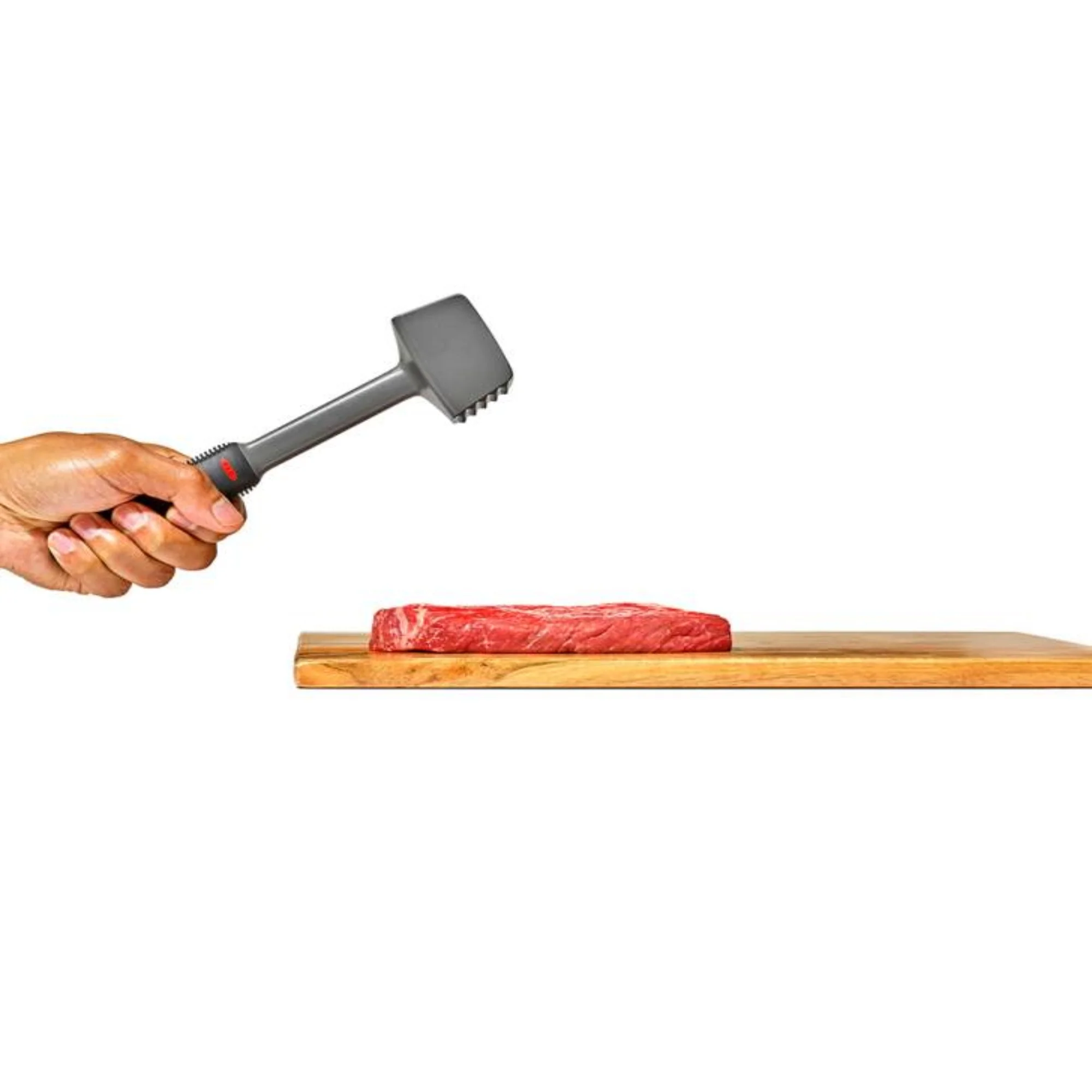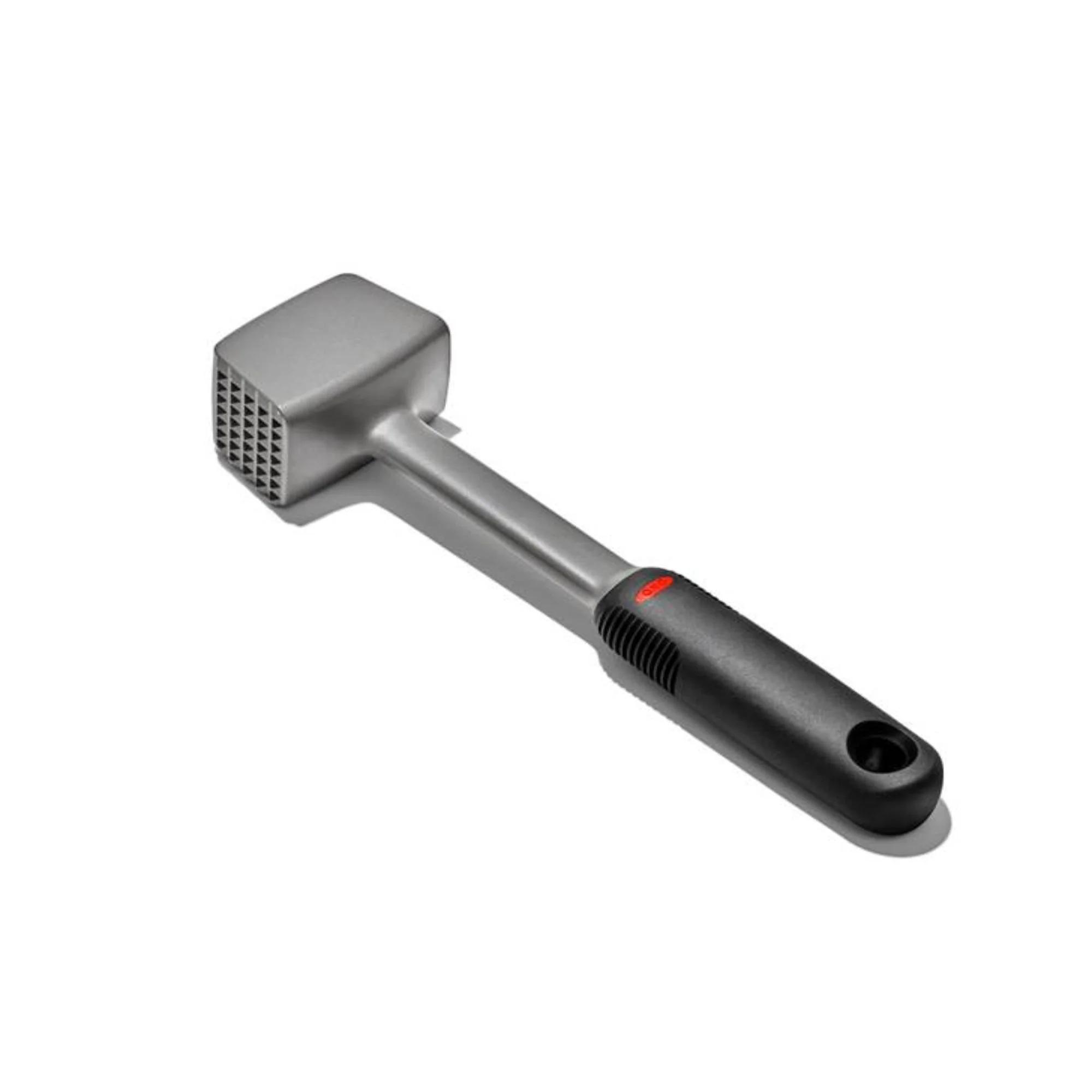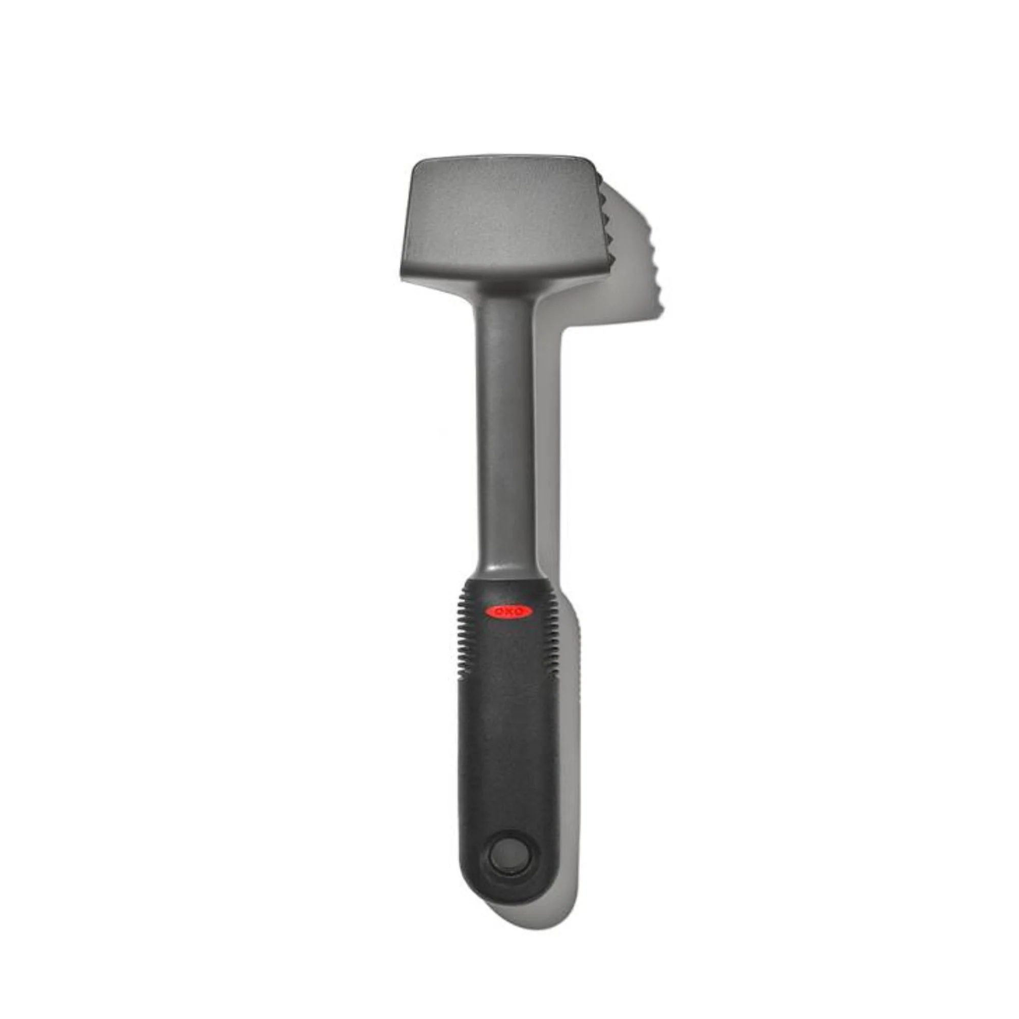 El ablandador de carne OXO es una herramienta de doble propósito que te permite aplanar y ablandar la carne con facilidad. El lado plano es perfecto para machacar carnes y esto ayuda para una cocción uniforme y consistente. El lado texturizado es ideal para ablandar cortes de carnes más duros. Su sólida construcción de aluminio es resistente y duradera, el mango es cómodo y amortigua el impacto al golpear, también suave y antideslizante, incluso con las manos mojadas.