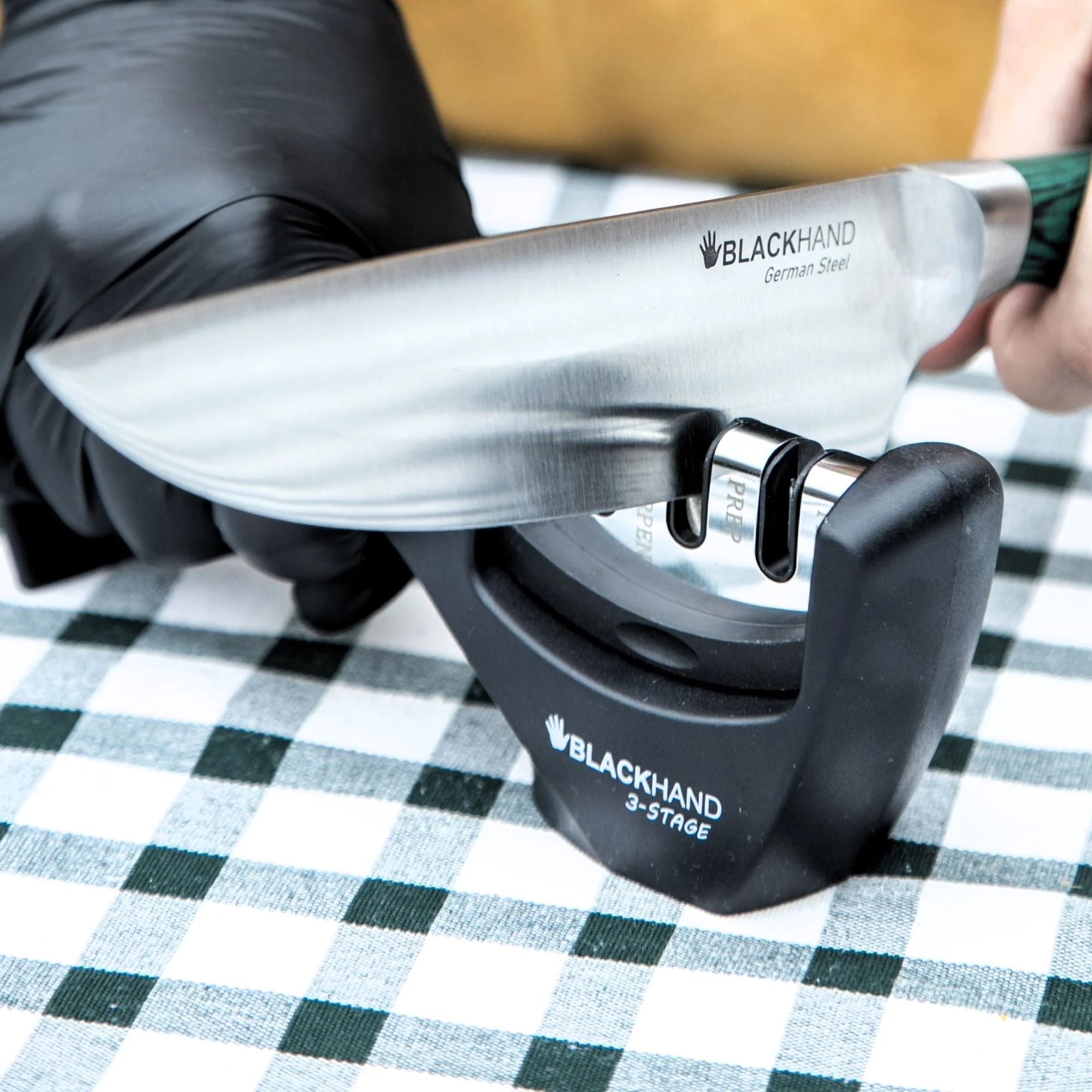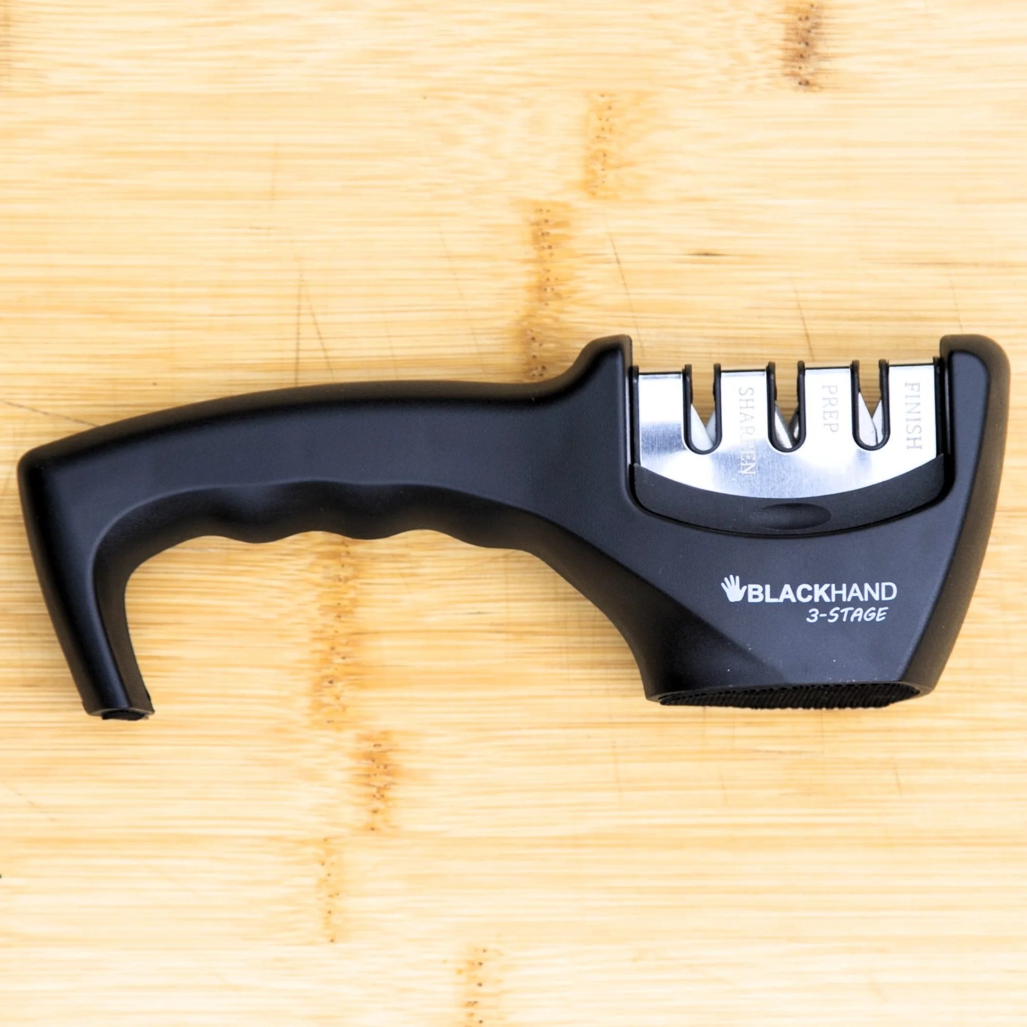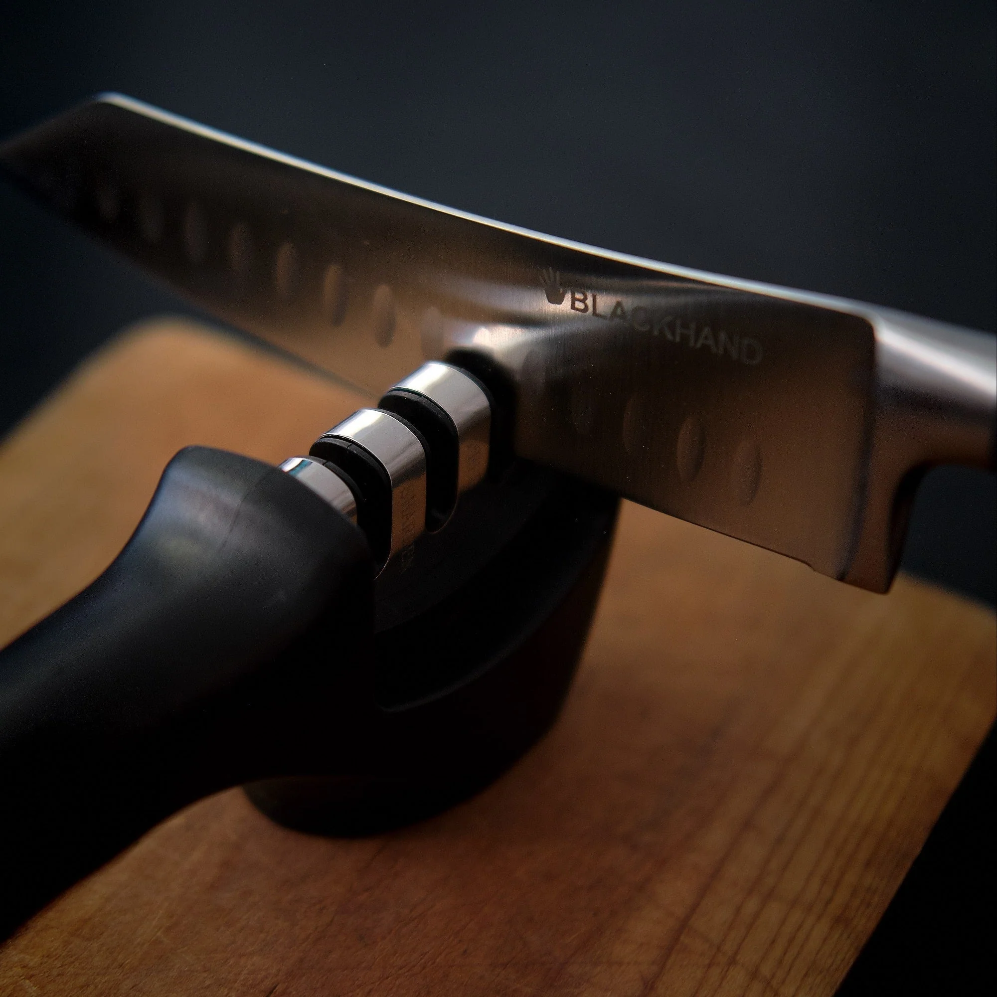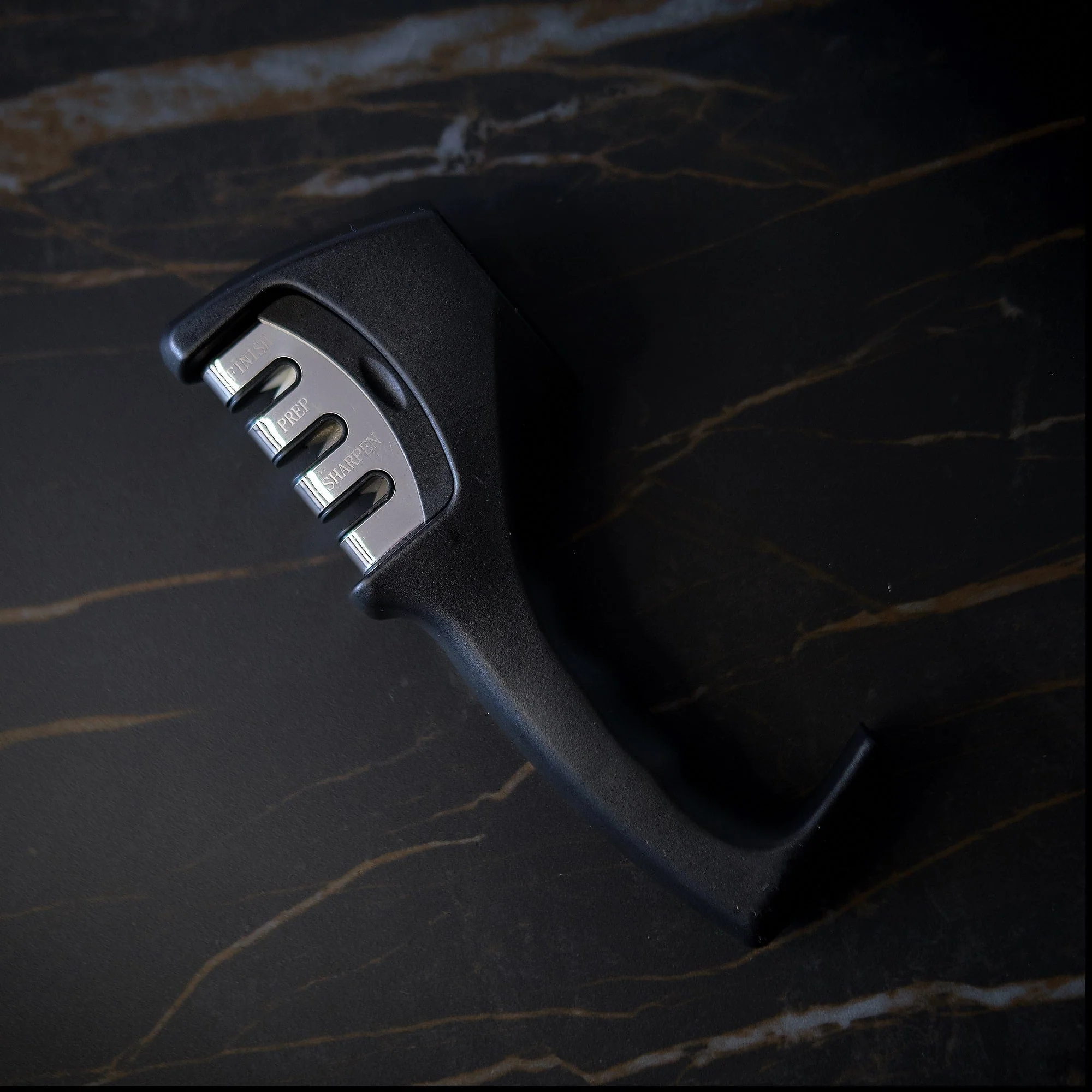 Para un mantenimiento óptimo y sencillo de tus cuchillos. Fabricado con aleación de acero y tungsteno. Este potente accesorio convierte el tradicional afilado por lado y lado en uno sencillo, rápido y simultáneo. En 3 etapas de 5 pasadas cada una repone el filo del cuchillo. Hazle mantenimiento a tu cuchillo de manera simple y rápida. El diseño y ángulo perfecto permiten un mejor y más duradero filo para tus cuchillos. Simple y fácil de usar, sin necesidad de agua o electricidad, se convierte en un producto indispensable en la cocina moderna. Instrucciones: Posiciona el afilador en una base firme. Con la mano izquierda toma el afilador desde el mango y con la mano derecha toma el cuchillo y posiciónalo verticalmente en la primera ranura (SHARPEN). Con fuerza controlada tira hacia atrás (nunca empujes hacia adelante) unas 5 veces que debiera ser suficiente para lograr el filo deseado. Posteriormente hacer la misma acción en la ranura del medio (PREP) para obtener el filo óptimo. Finalizar en la tercera ranura (FINISH).