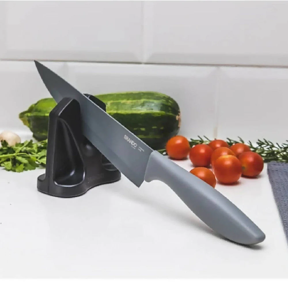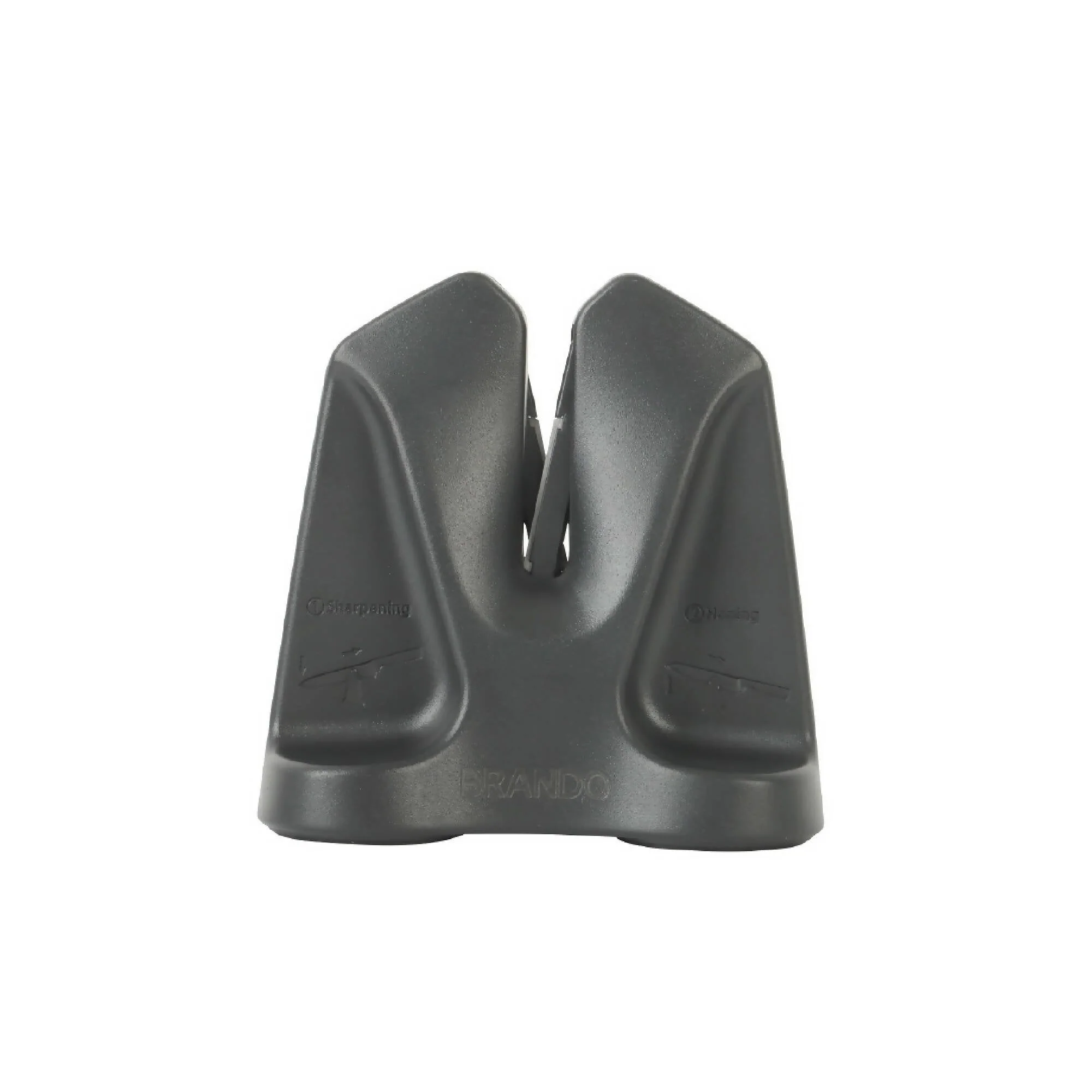 Afilador Ergonómico Brando para todo tipo de cuchillos. Cuenta con un diseño compacto perfecto para almacenamiento y uso al aire libre. Ángulos de afilar ajustables (15°-45°) con resortes incorporados, almohadillas de silicona antideslizantes en la parte inferior y tiene ajuste automático.