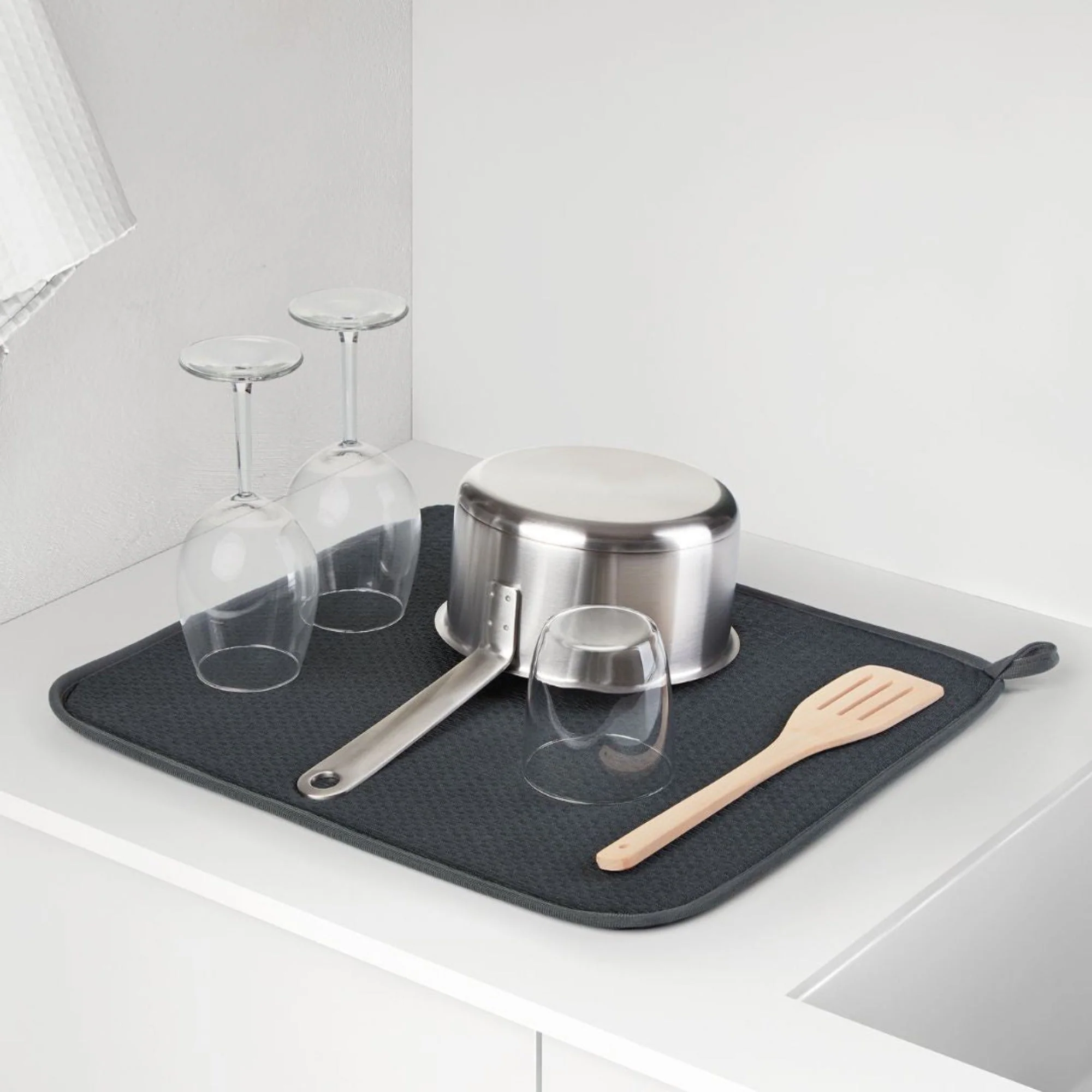 Se seca rápidamente, lo que la hace perfecta para evitar la acumulación de humedad. Ideal para escurrir en la encimera ollas, sartenes, platos, cristalería, todo lo que quieras lavar podras dejarlo secar en el super mat de Rayen. Acolchada: protege la vajilla y la encimera, evitando cualquier arañazo y a la vez manteniendo tu encimera completamente seca. Material flexible que permite plegar la alfombrilla y guardarla fácilmente. Incluye tira para colgar.