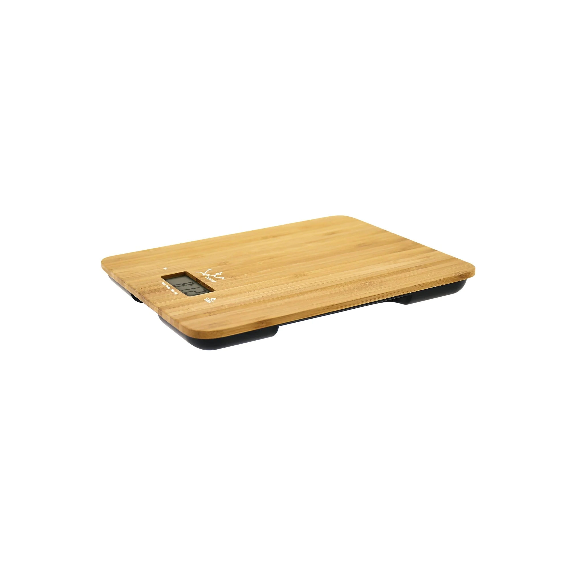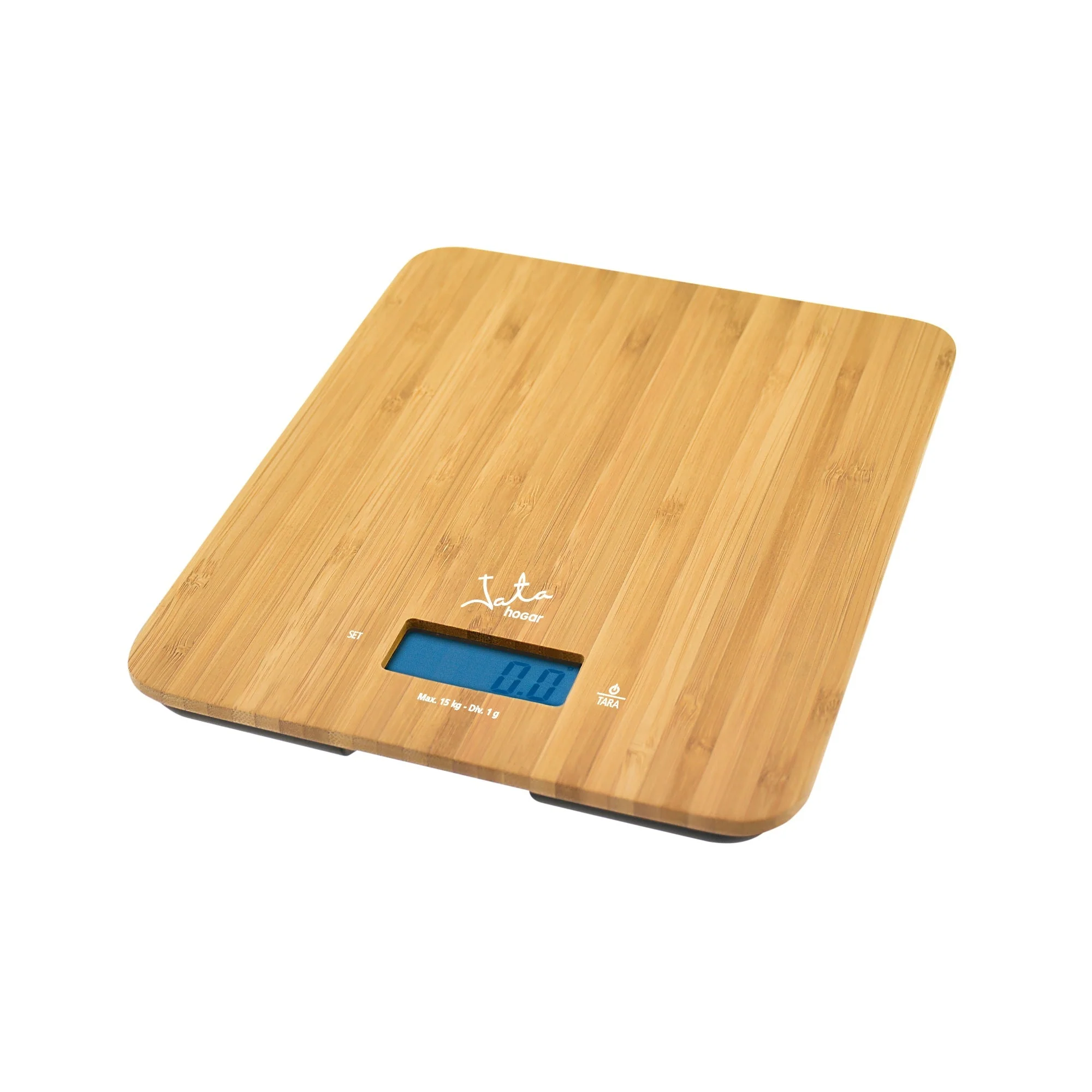 Linda balanza fabricada en bambú sustentable. Capacidad 15 kg. Graduación 1 g. Superficie en bambú prensado de producción sostenible de 5 mm. Alta precisión electrónica. Visor “lcd” autoluminiscente. Reloj integrado. Función de tara. Función temporizador. Función de conversión g / kg / oz / lb / fl.oz. Indicador de batería baja. Indicador de sobrepeso. Funciona con 2 pilas “aaa” de 1,5 v (no incluidas).