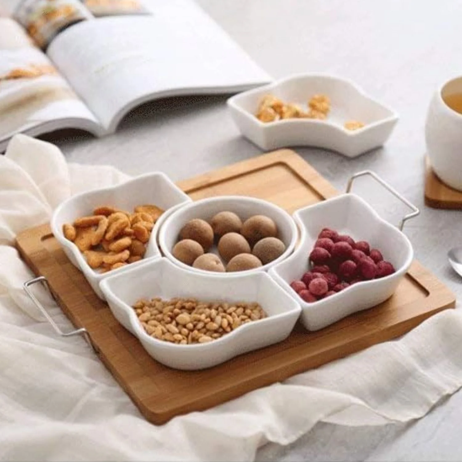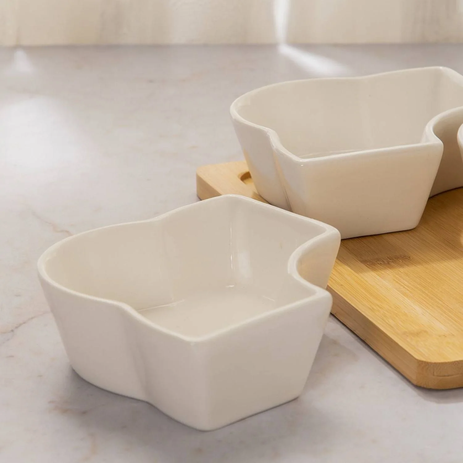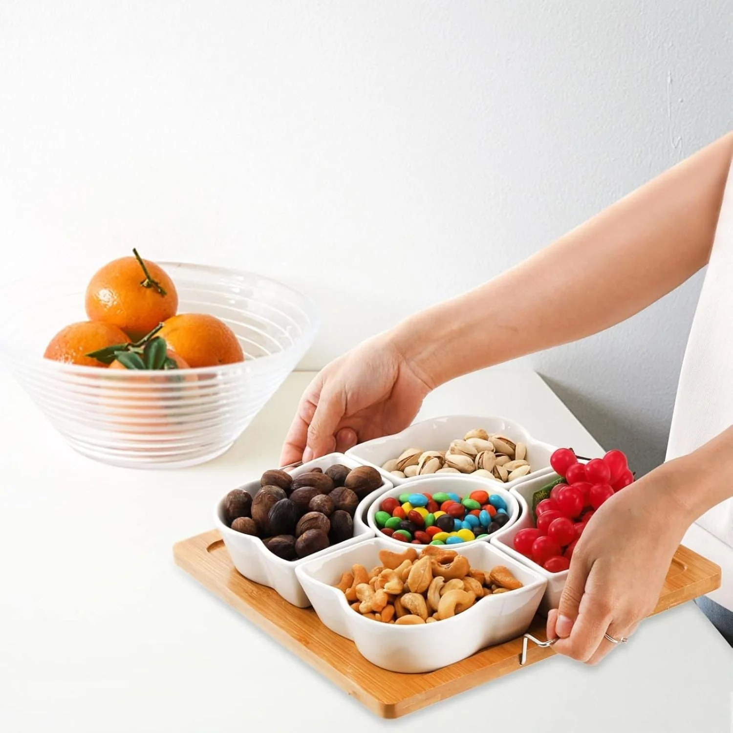 Acompaña tus reuniones y eventos especiales elevando tus aperitivos con esta Bandeja 5 pocillos rectángular con base de Madera. Sorprende a tus invitados con elegancia y funcionalidad. Sus 5 pocillos individuales amplían la gama de muestra y organiza los picadillos entre salsas y bocados. Su diseño mix entre cerámica y madera la vuelven una pieza sofisticada que aporta armonía a los espacios. A su vez los materiales resistentes aseguran durabilidad y la facultan para el uso cotidiano. Tanto bandeja como pocillos pueden desmontarse para uso individual. Cuenta con asas de agarre. Úsala en ocasiones especiales o para presentación de postres, frutos secos y otros. Capacidad de cada pocillo: 150 ml