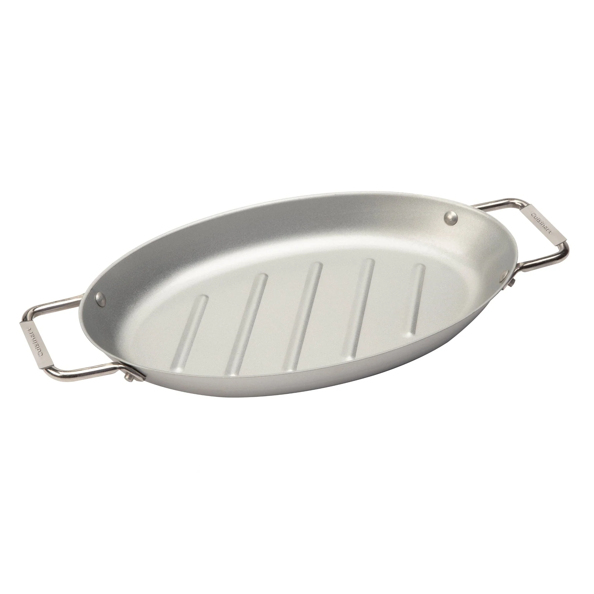 El sartén ovalado antiadherente Cuisinart de 13\» x 8\» ayuda a cualquier entusiasta de la parrilla a cocinar una variedad de alimentos delicados en la parrilla sin permitir que se caigan a través de la rejilla. Este sartén es ideal para pescados, mariscos y verduras. El material antiadherente cuenta con varillas de parrilla que elevan los alimentos y recogen los goteos de cocción y el exceso de aceite. Las asas elevadas de acero inoxidable en la parte superior evitan que tus manos entren en contacto con la superficie caliente. Antiadherente por dentro y por fuera, ofrece una gran liberación de alimentos con una limpieza rápida; la parrilla ovalada estilo sartén para asar es segura hasta los 200 °C.