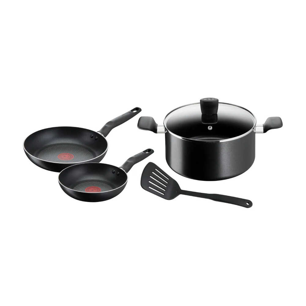 Descubre el Set de Batería de 5 Pzs Super Cook de Tefal, diseñado para una cocina eficiente y duradera. La línea Super Cook destaca por su base difusora que asegura una distribución uniforme del calor y un recubrimiento antiadherente de titanio resistente a rayaduras. Equipado con la tecnología Thermo-Signal, un indicador de temperatura que te señala el momento perfecto para cocinar, garantizando que tus alimentos conserven sus nutrientes. El set incluye sartenes de 20 y 24 cm, una olla de 24 cm con tapa, y una espátula, todo con mangos ergonómicos y tapa de vidrio para una cocción rápida y cómoda. Compatible con todas las cocinas, excepto inducción, y libre de PFOA, cadmio y plomo para una cocción segura y saludable.