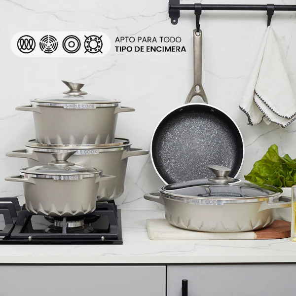 La Batería de Cocina Mont Blanc 9 pzs Simple Cook de aluminio forjado es ligera, resistente y fácil de manipular. Su diseño moderno, con líneas geométricas en la base, le da un aspecto premium y minimalista, mientras que el acabado metálico mate con detalles en acero inoxidable aporta un look sofisticado. Soporta altas temperaturas y ofrece gran conductividad térmica, asegurando una cocción eficiente. Su interior cuenta con revestimiento antiadherente Pfluon, libre de PFOA y GenX, para una cocina más saludable.