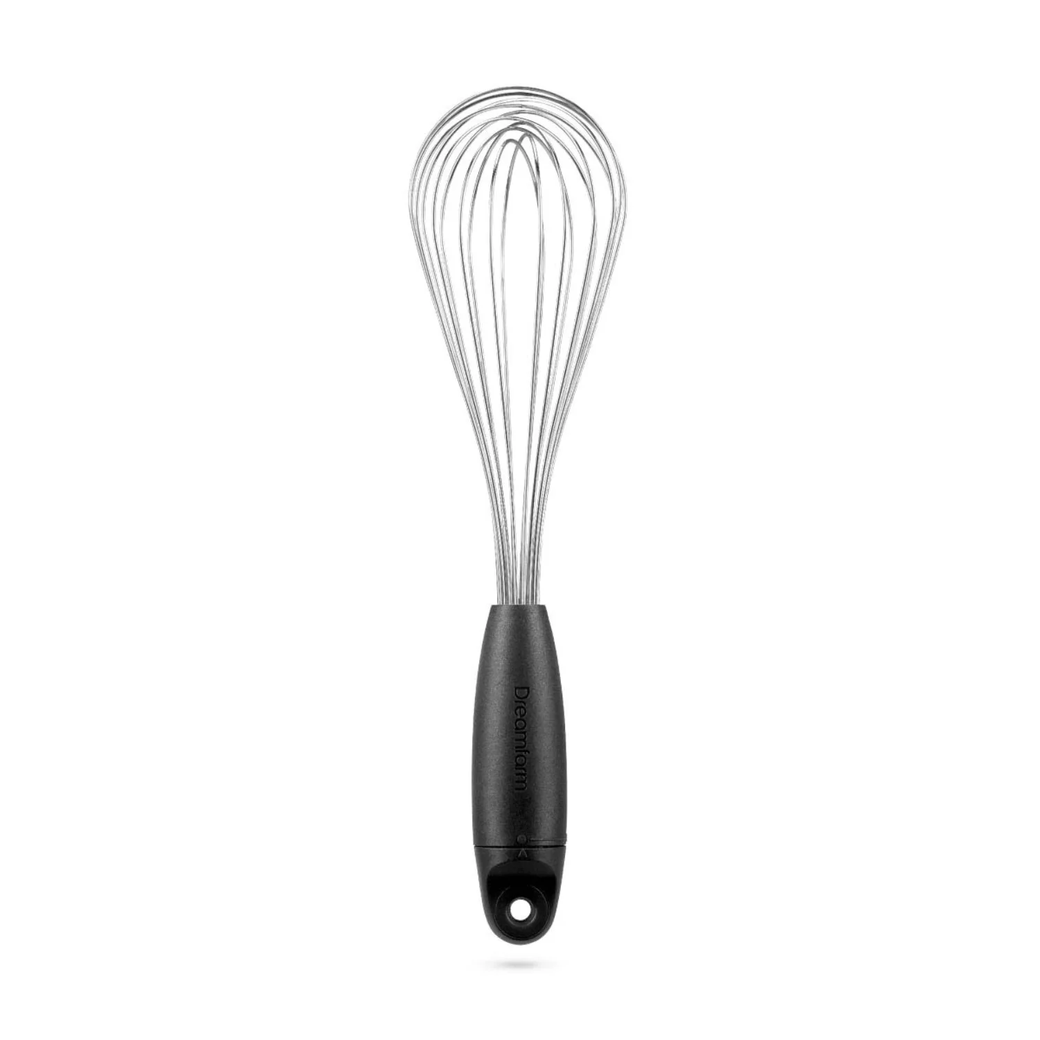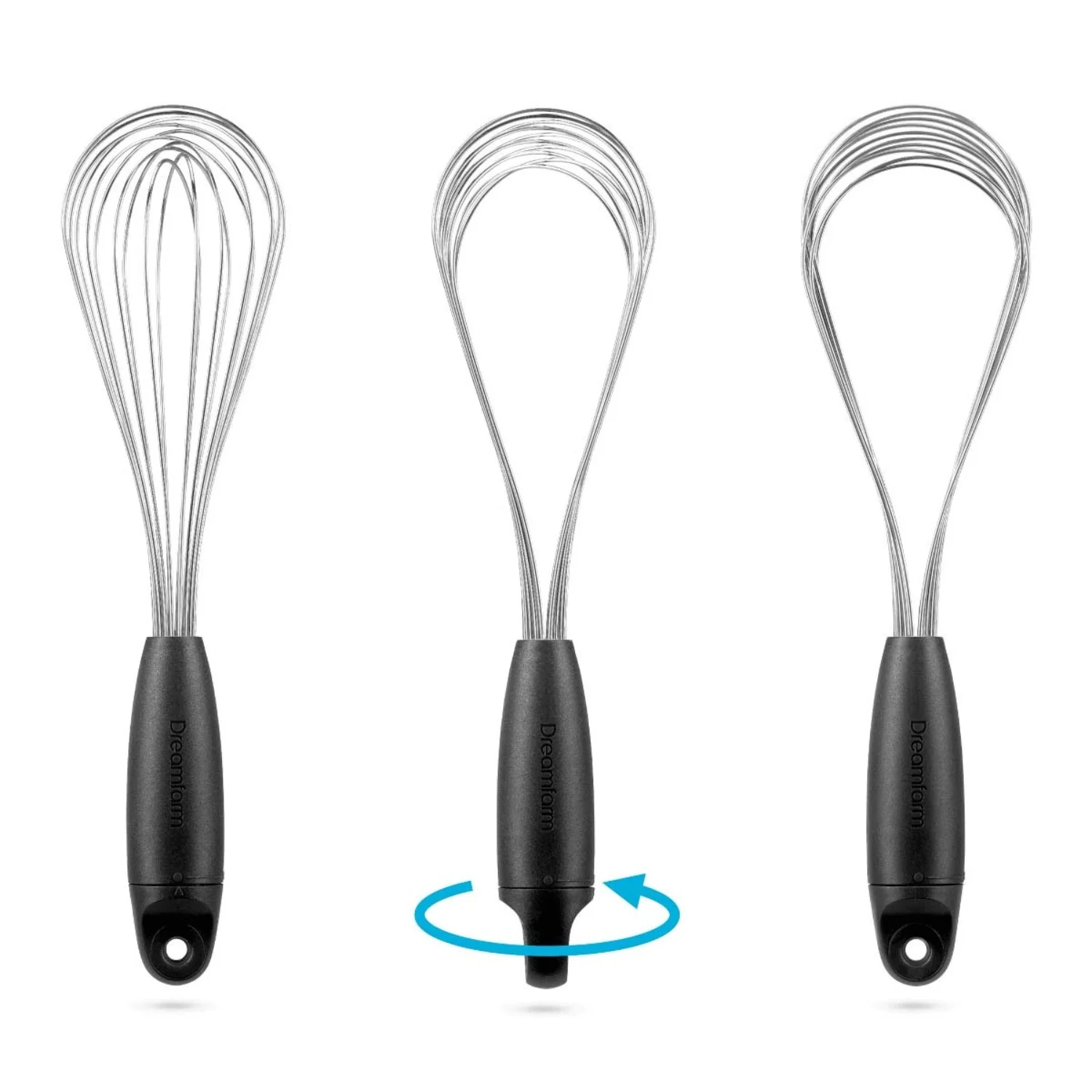 Mini Flisk gira para crear 3 batidores de 1: un batidor de globo para batir, un batidor de salsa para líquidos poco profundos y un batidor plano para revolver huevos. Los 10 cables de Flisk están hechos de acero con resorte de alta vibración para una máxima eficiencia de aireación y están sellados higiénicamente dentro de su mango ergonómico.