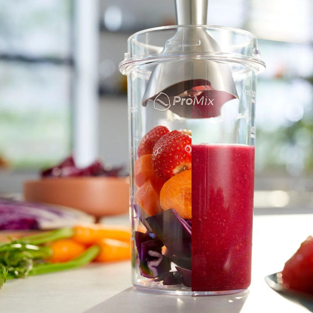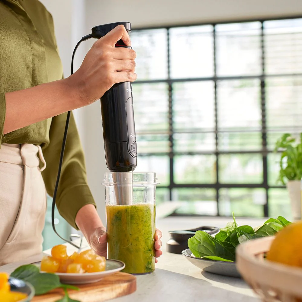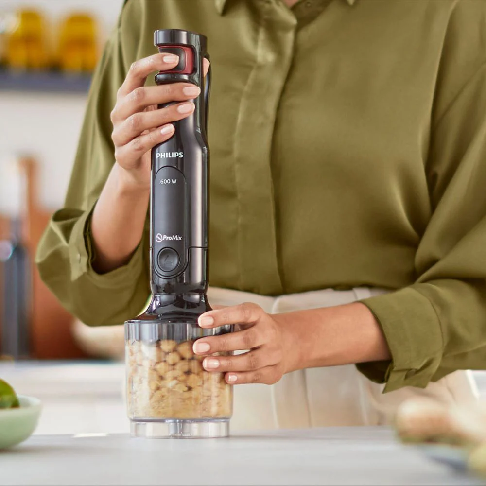 Nuestro protector especial de la hoja detendrá salpicaduras grandes y pequeñas. Su forma ondulada unida a la parte inferior del brazo de la batidora garantiza el mínimo desorden mínimo y que sea más fácil de limpiar más tarde.Philips se asoció con la Universidad de Stuttgart para desarrollar ProMix, que ofrece una mezcla más rápida y uniforme. Su exclusiva tecnología de avanzada cuenta con una forma triangular que permite un flujo óptimo de los alimentos y un rendimiento máximo con el fin de ofrecerle siempre los mejores resultados.