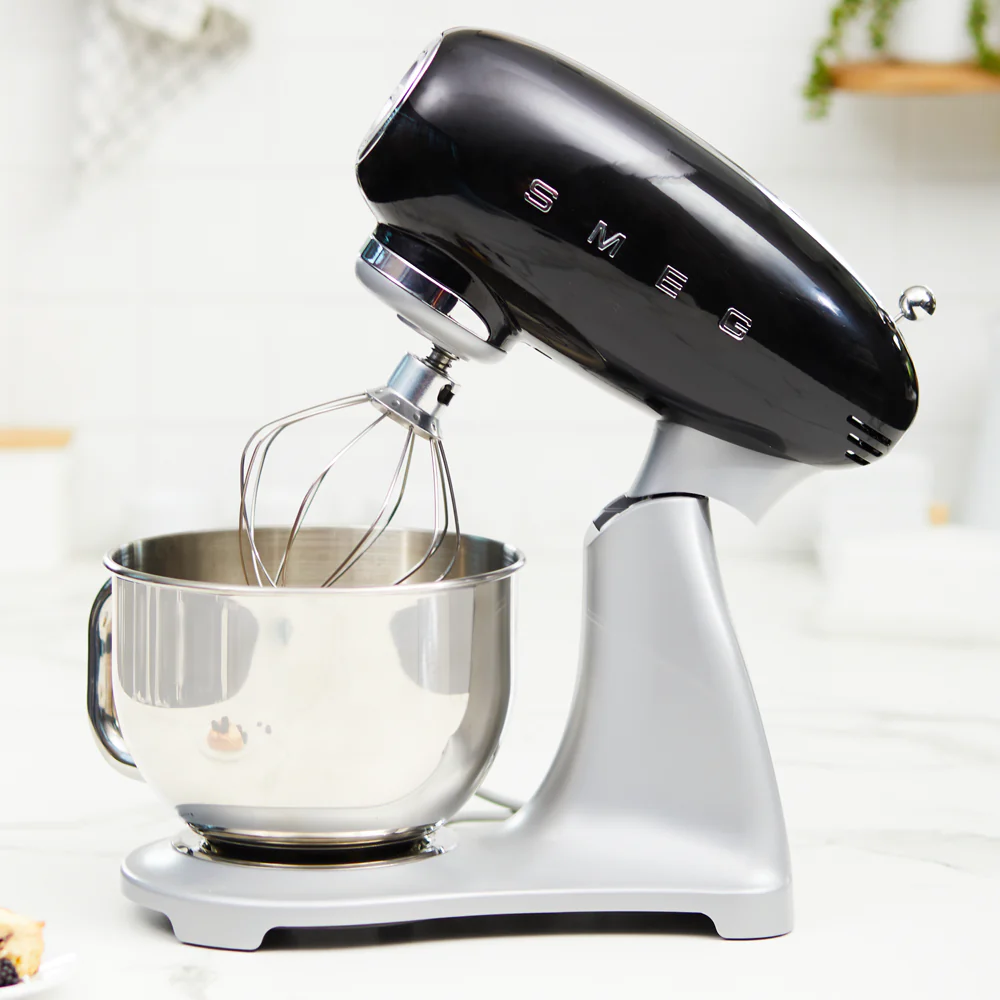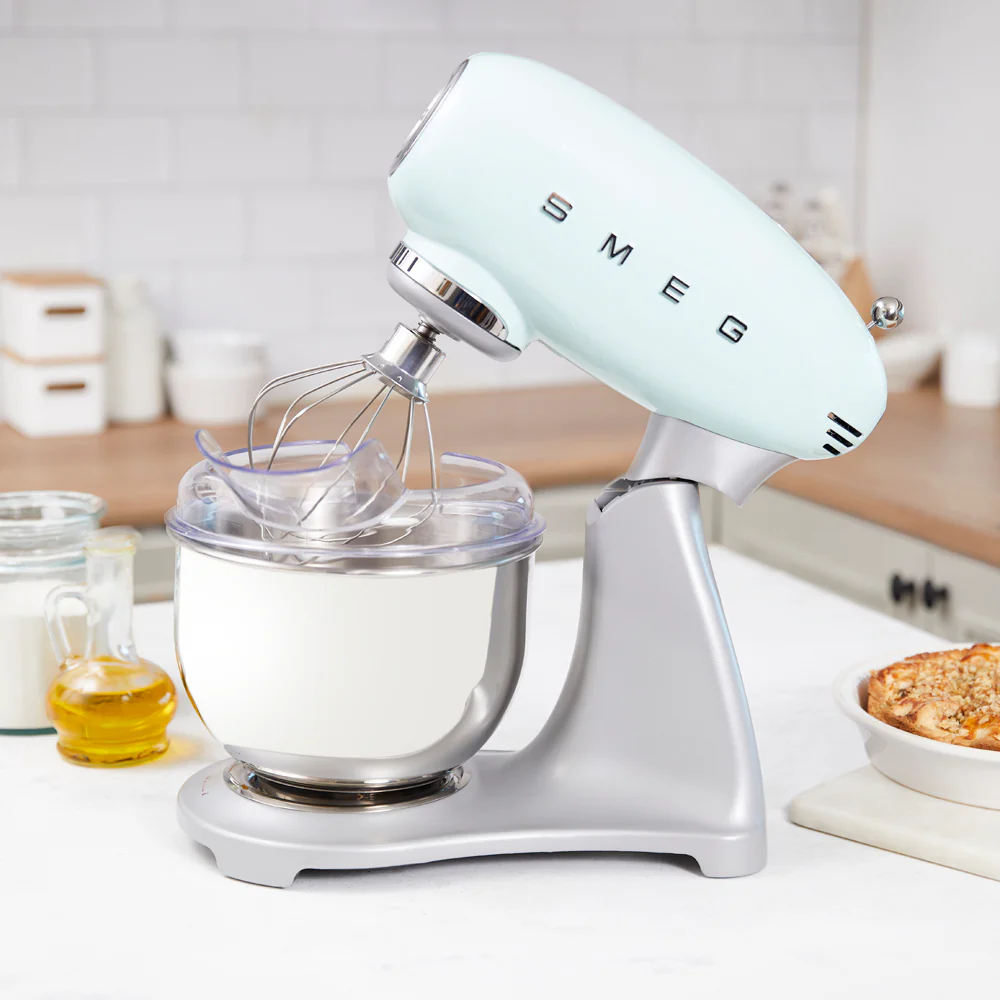 Con su estilo retro característico esta batidora de pedestal Smeg cuenta con 800 W de potencia que puede ser ajustado en sus 10 velocidades, cada una con arranque suave. Cuenta con movimiento planetario, base antideslizante y sistema bloqueo seguridad cuando el cuerpo esta levantado.