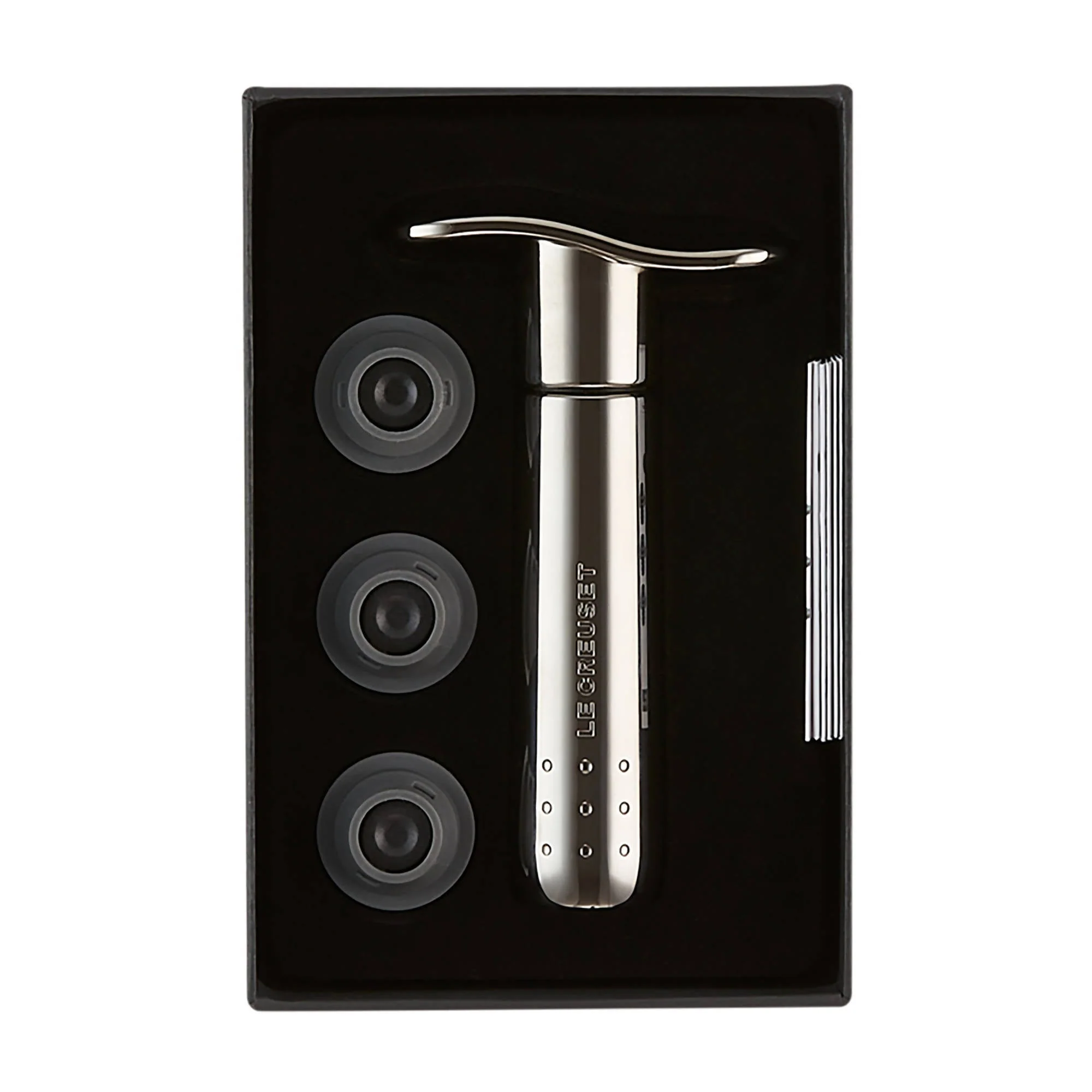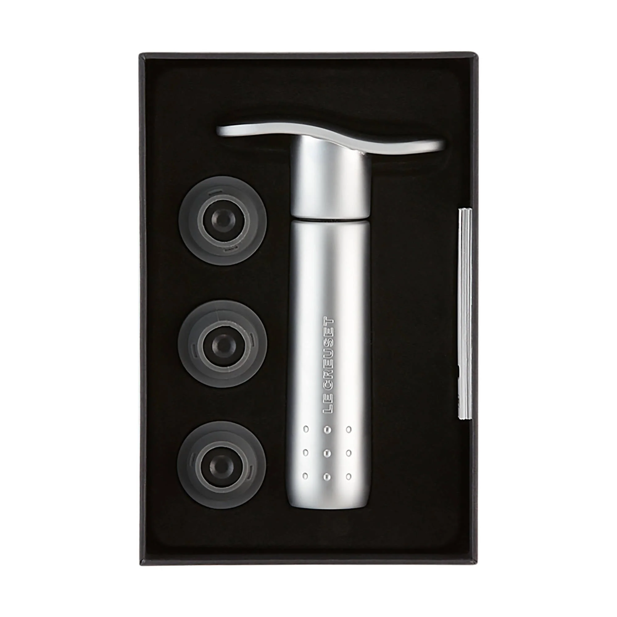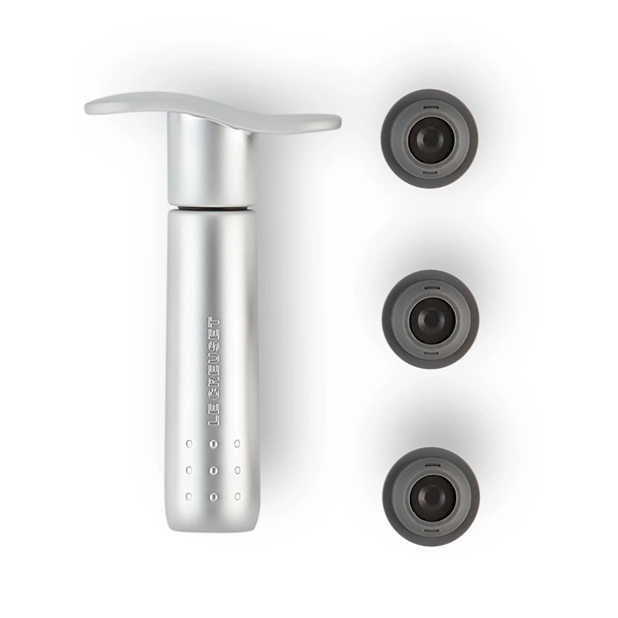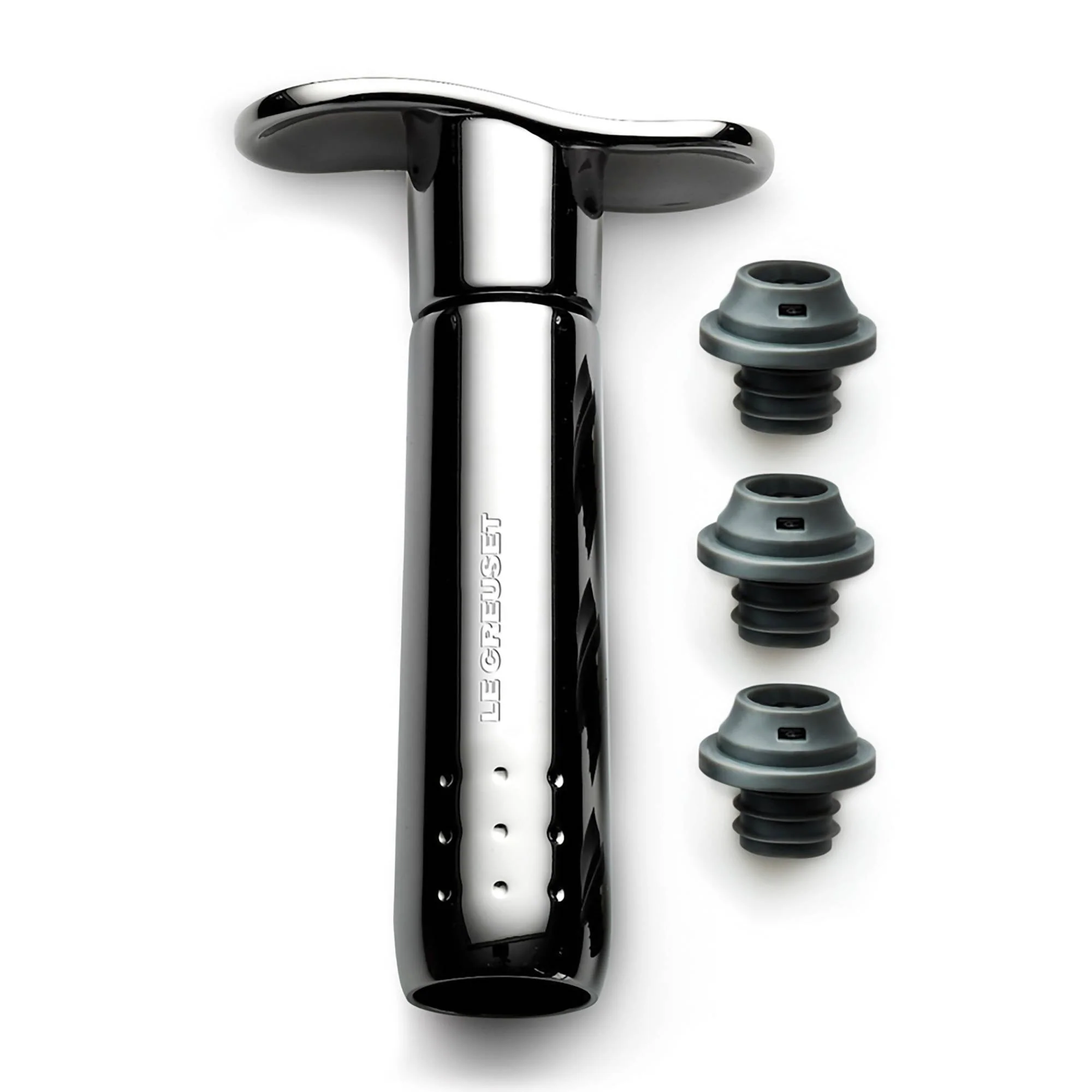 Una vez que el vino se ha abierto, es importante preservarlo adecuadamente para disfrutarlo en otro momento. La bomba de vacío de Le Creuset, en elegante diseño niquelado, conserva el vino eliminando el aire del interior de la botella abierta y cerrándola herméticamente con el tapón. Simplemente hay que colocar el tapón en la botella y bombear hasta notar la resistencia. El vino estará sellado y listo para su almacenamiento.