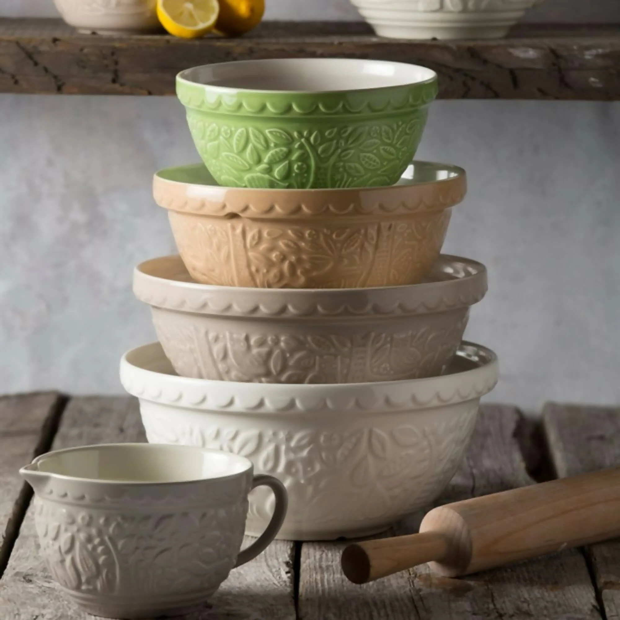 El Bowl Mason Cash de 24 cms está disponible en dos colores: Café Latte y Naranjo Ocre. Es perfecto para servir ensaladas, postres o para mezclas de pudín y masa para galletas. Parte de la Línea Mason Cash In the Forest, este bowl está grabado con escenas de bosques inspiradas en cuentos populares de mediados del siglo XIX.