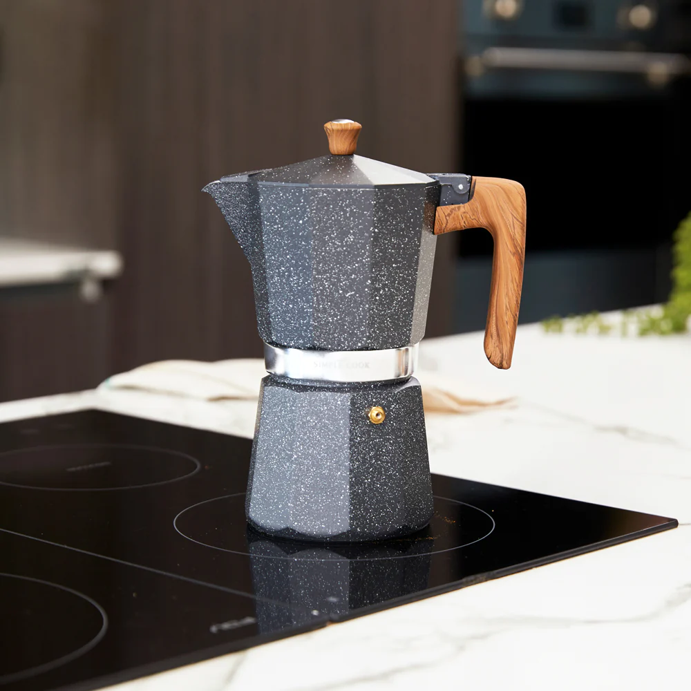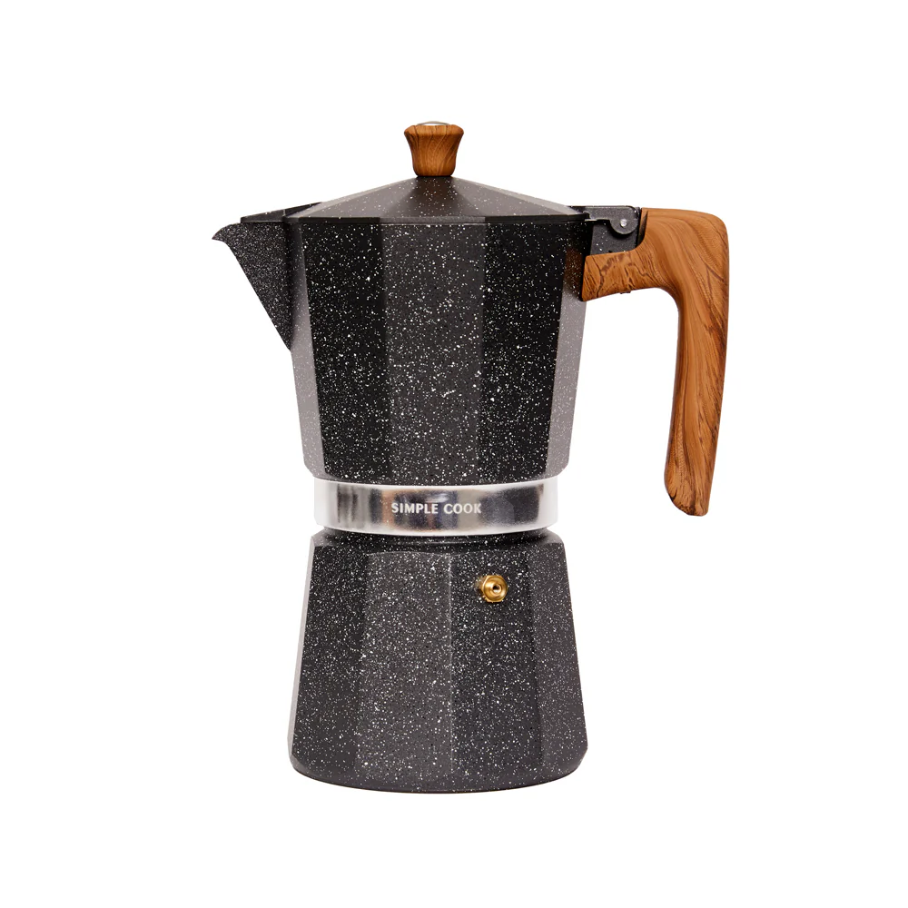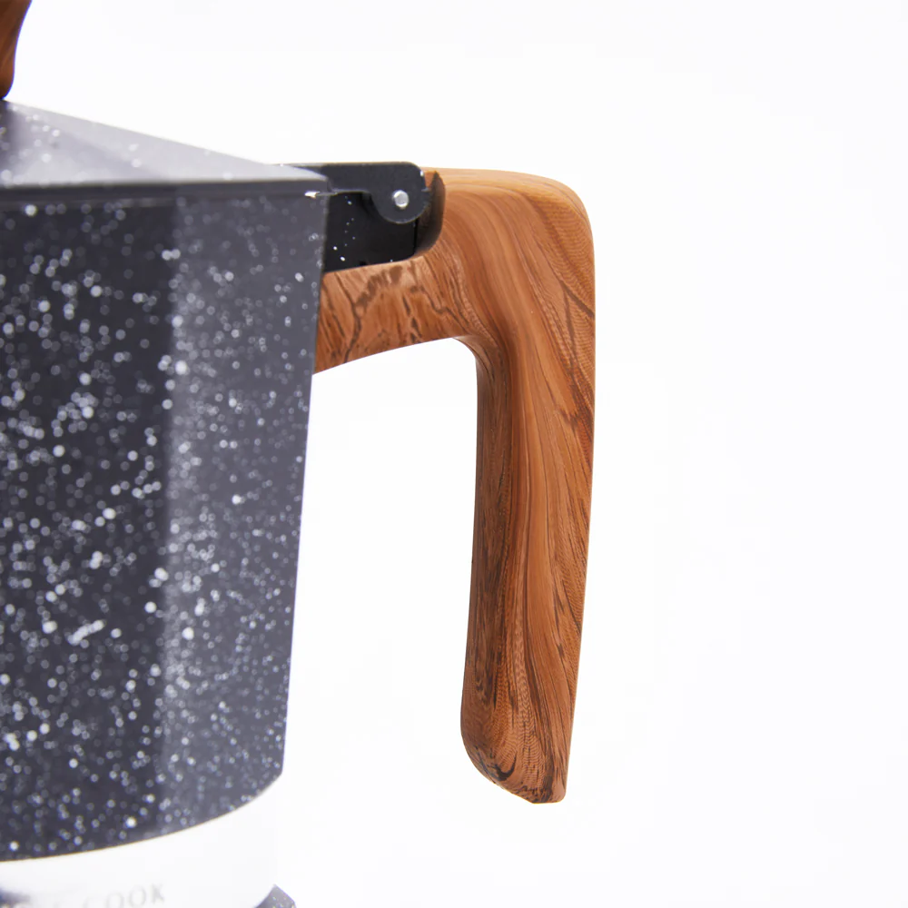 La cafetera italiana Siena de Simple Cook se distingue por sus detalles cuidadosamente elegidos, como su asa y perilla de madera, que no solo aportan un toque natural y cálido, sino que también garantizan un manejo cómodo y seguro. Su cuerpo de aluminio lacado no solo resalta la durabilidad del producto, sino que también añade un elegante acabado. La terminación en imitación de mármol en color blanco completa el diseño con un toque de sofisticación, brindando a la cafetera Siena una apariencia única y moderna.