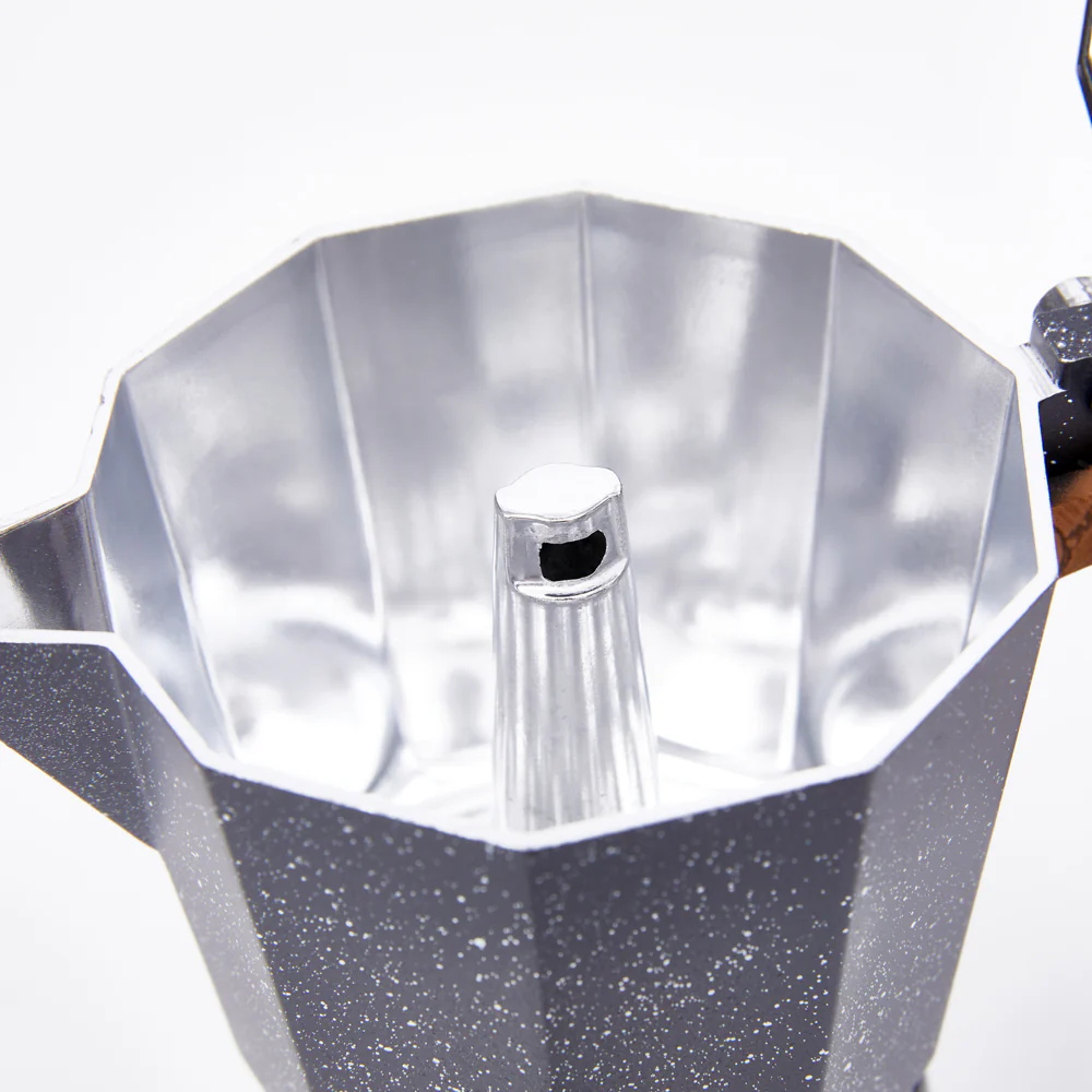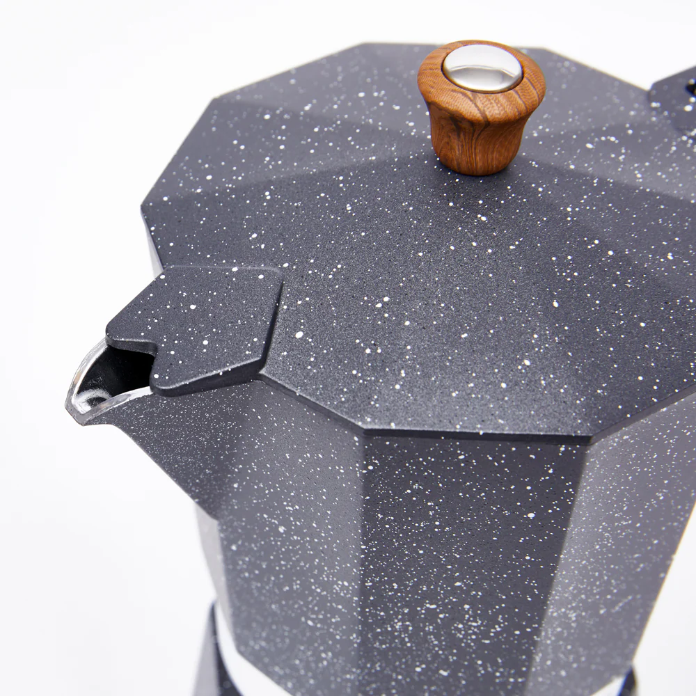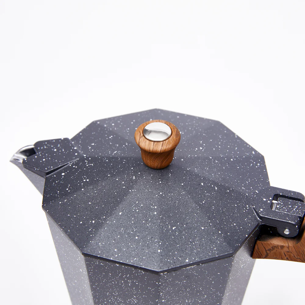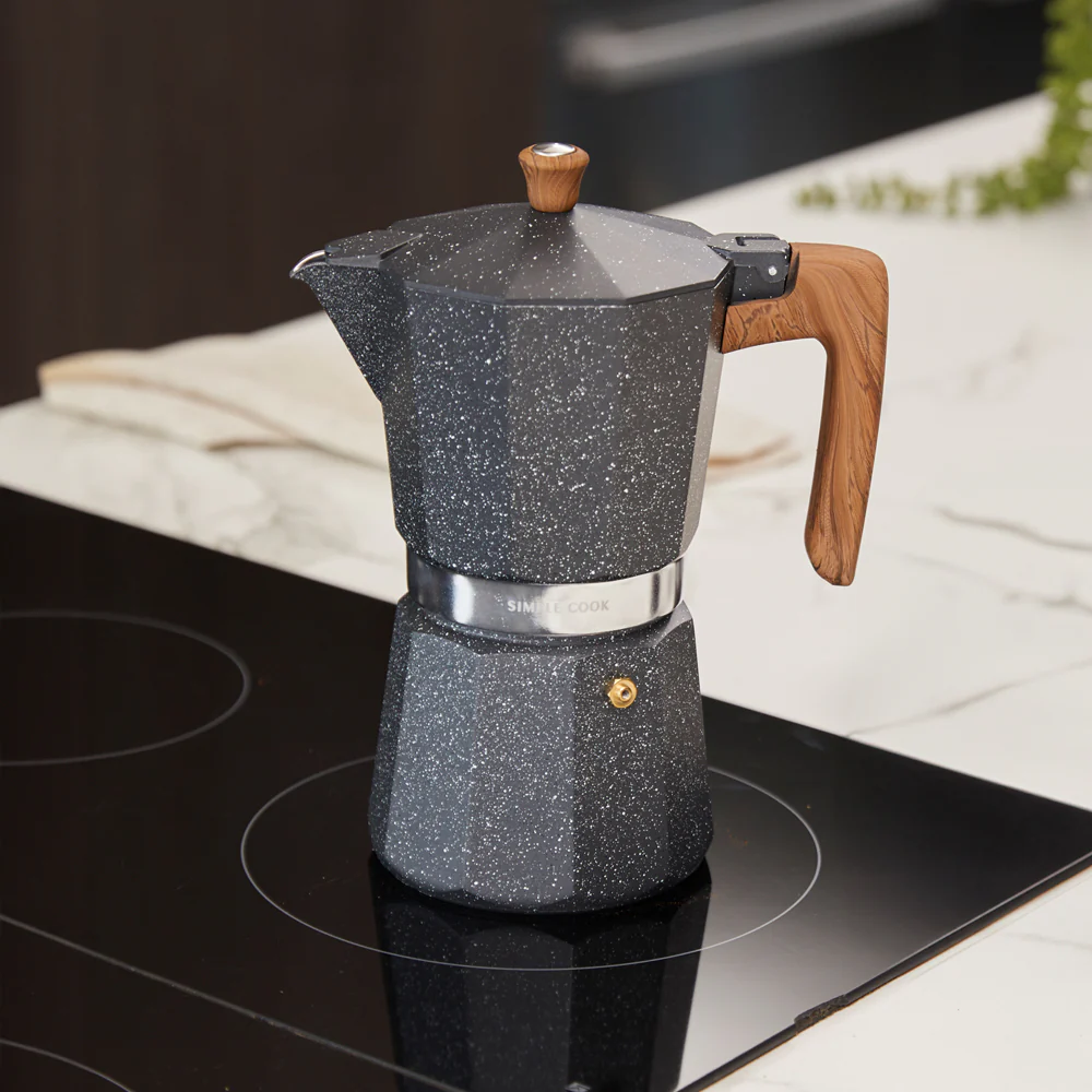 La cafetera italiana Siena de Simple Cook se distingue por sus detalles cuidadosamente elegidos, como su asa y perilla de madera, que no solo aportan un toque natural y cálido, sino que también garantizan un manejo cómodo y seguro. Su cuerpo de aluminio lacado no solo resalta la durabilidad del producto, sino que también añade un elegante acabado. La terminación en imitación de mármol en color blanco completa el diseño con un toque de sofisticación, brindando a la cafetera Siena una apariencia única y moderna.