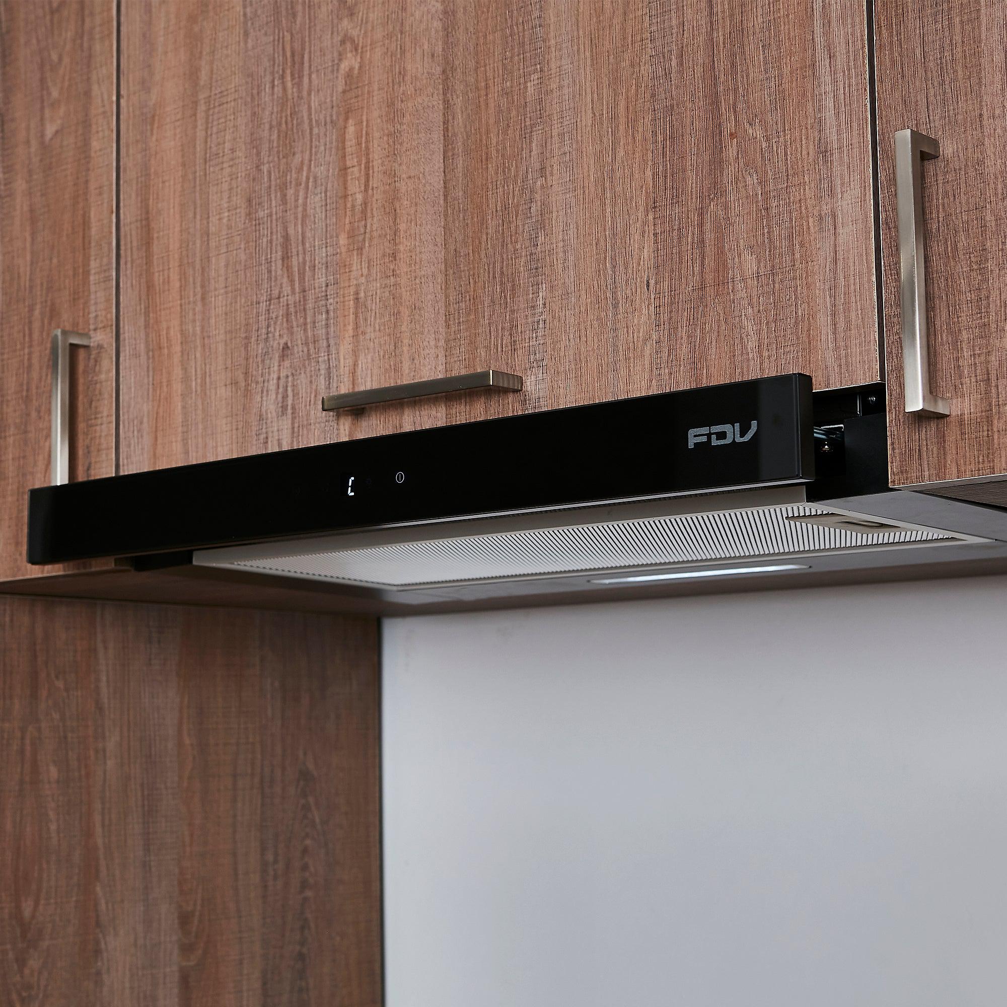 La Campana FDV Twin Black Touch 60 cm – Bajo Mueble combina elegancia y eficiencia. Su diseño en negro, acero inoxidable y cristal templado se adapta a cocinas modernas, aportando estilo sin ocupar espacio.