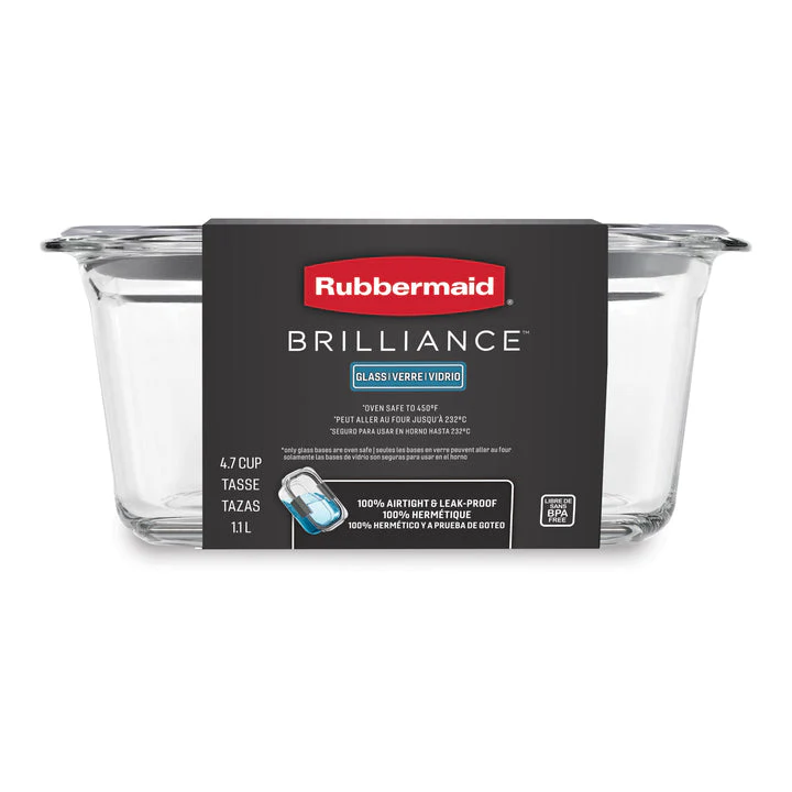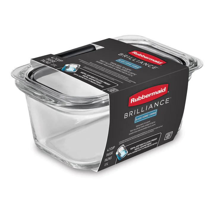 El Contenedor Hermético De Vidrio de 1.1 Lts Rubbermaid Brilliance de vidrio está elaborado de forma inteligente y con un hermoso diseño. Estos recipientes de vidrio tienen tapas de plástico transparente con un sello 100% hermético a prueba de fugas y pestillos seguros para facilitar el recalentamiento y el almacenamiento. Las rejillas de ventilación integradas debajo de las aletas permiten que escape el vapor para que pueda cocinar en el microondas los alimentos sin salpicaduras y sin quitar la tapa. Las tapas y bases transparentes facilitan ver lo que hay almacenado en el interior. Incluye 1 Contenedor de 1.1 Lts.