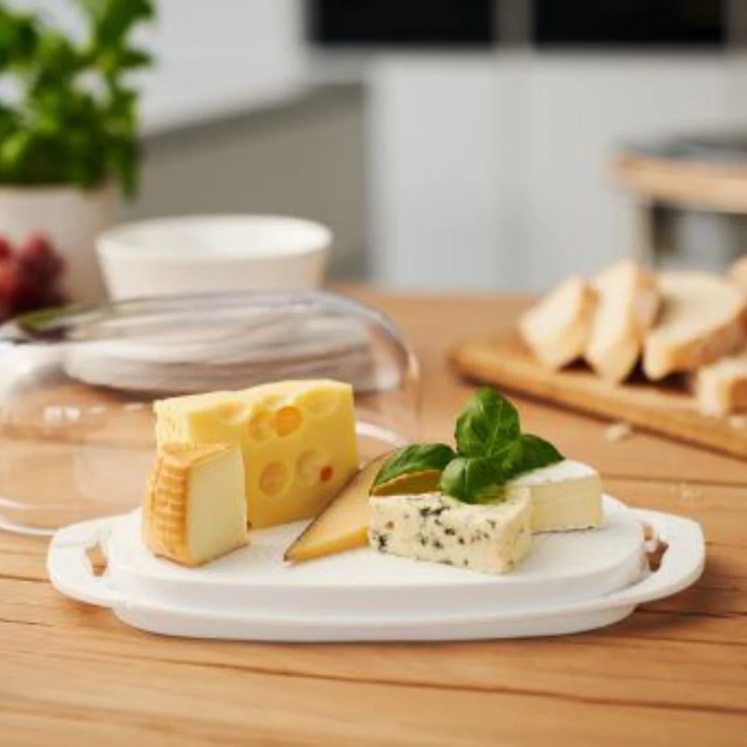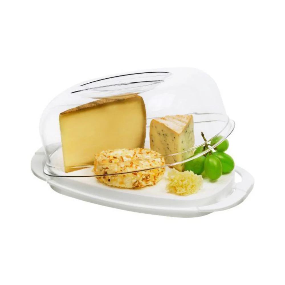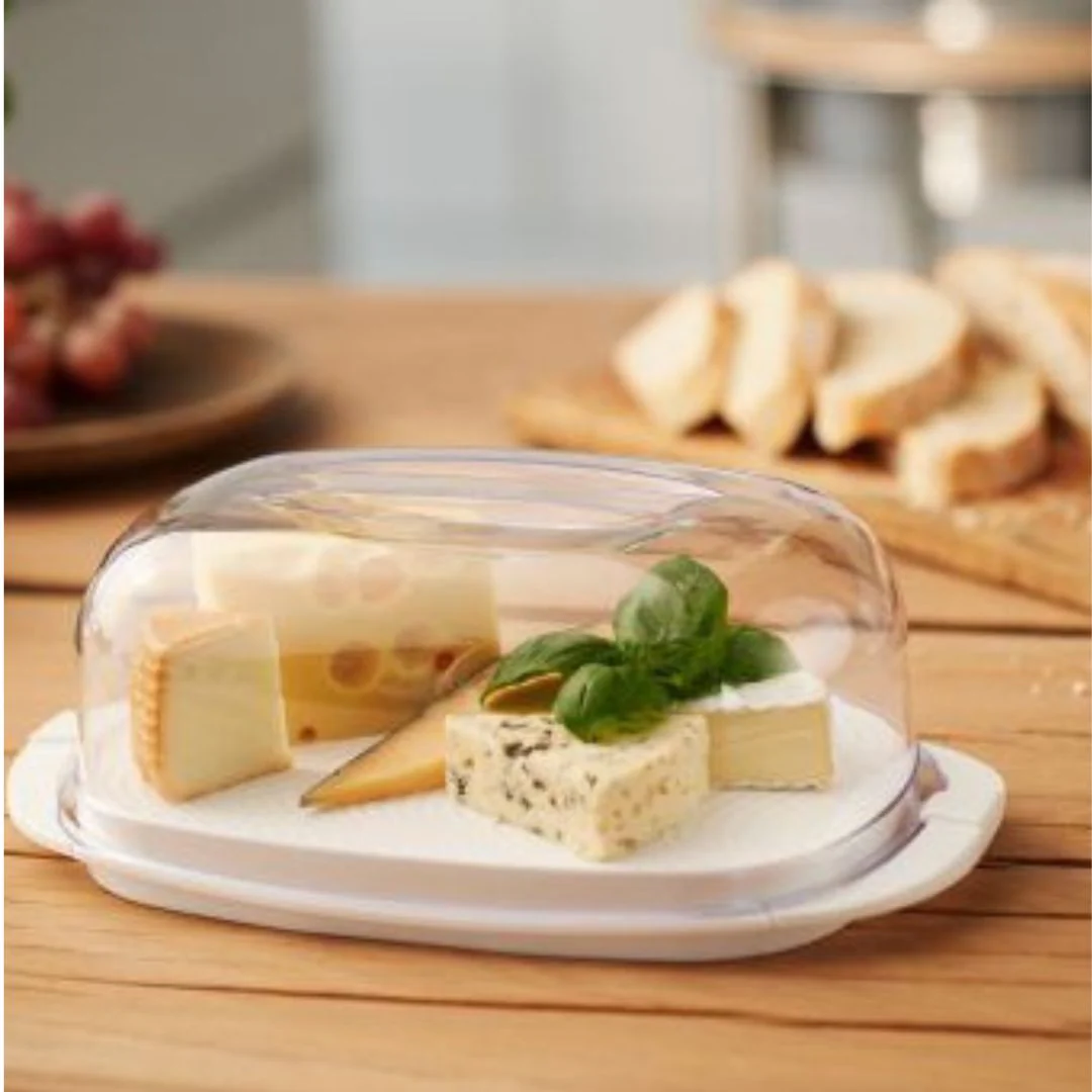 La cubierta transparente le permite ver el contenido de la caja de almacenamiento con las dimensiones 290 x 170 x 105 mm (L x W x H) en cualquier momento. La cúpula de queso FRESCO tiene un mecanismo de bloqueo seguro: la tapa se desbloquea presionándola suavemente hacia abajo y se puede abrir fácilmente. La base ligeramente elevada de la caja de queso no tiene bordes molestos para facilitar el corte. El plástico apto para alimentos de producción sostenible garantiza durabilidad y longevidad.