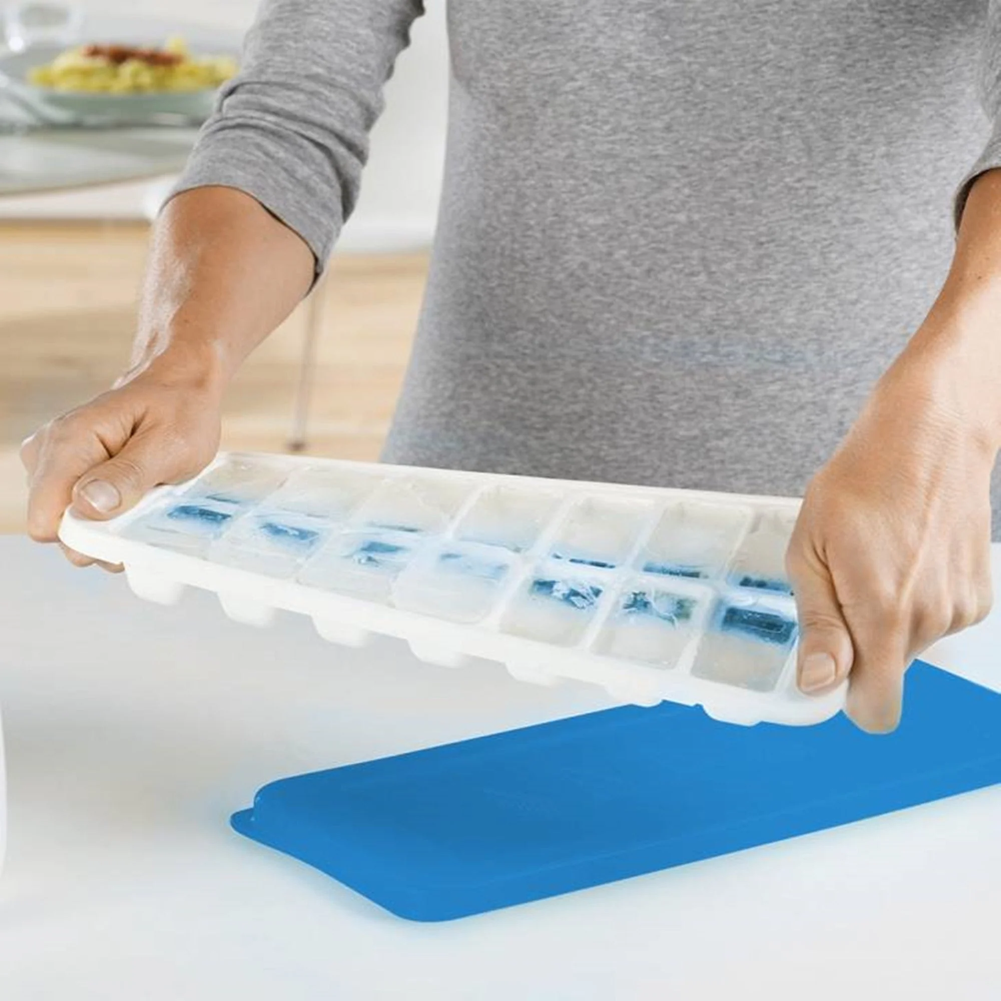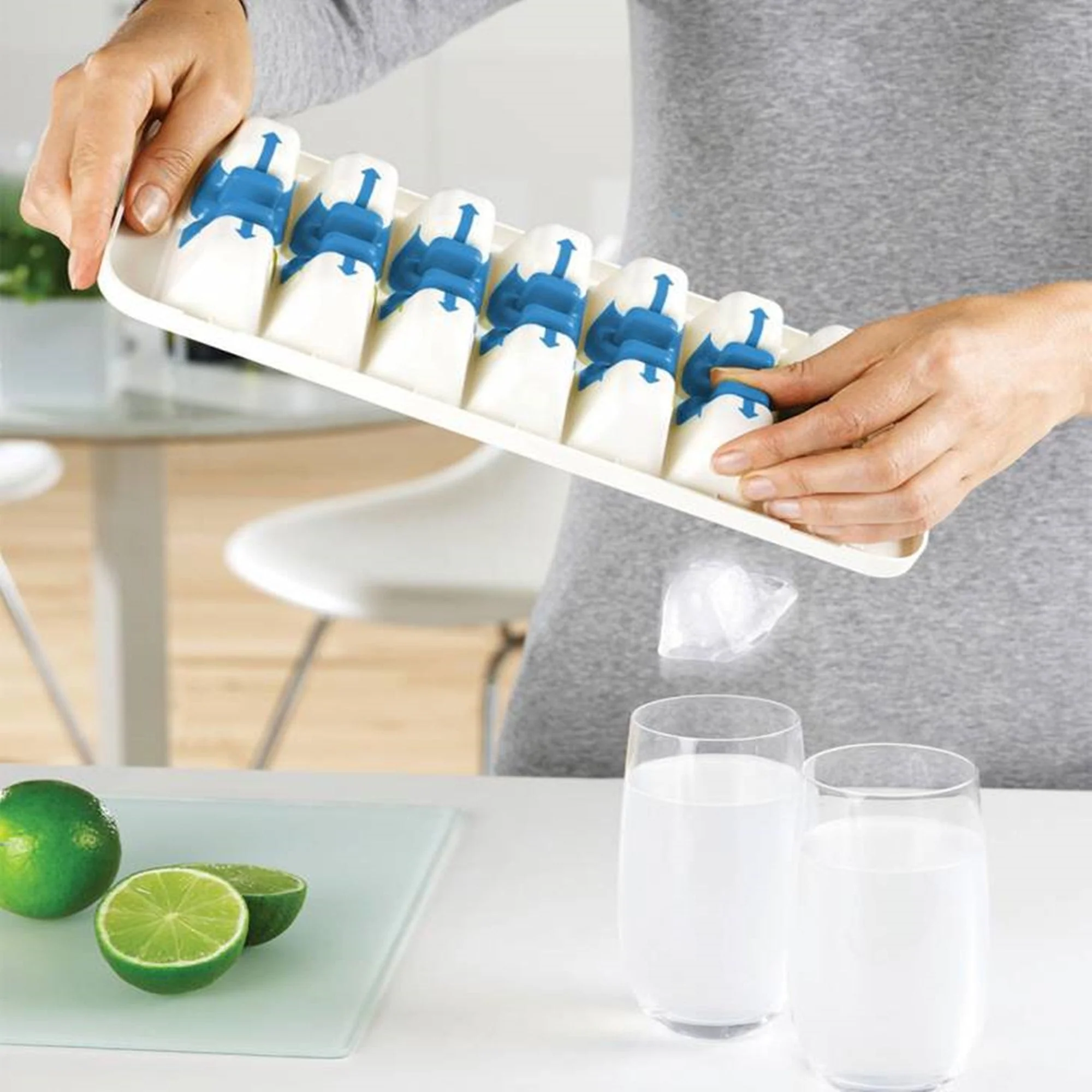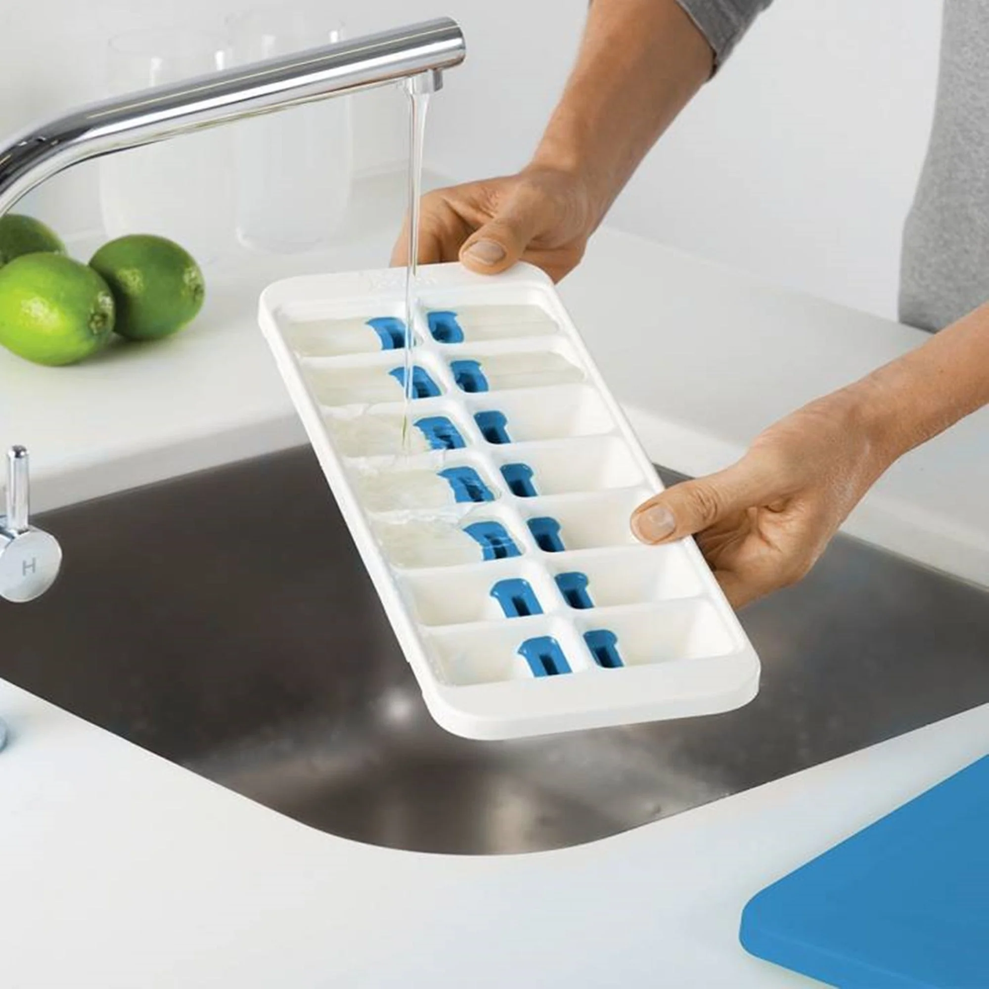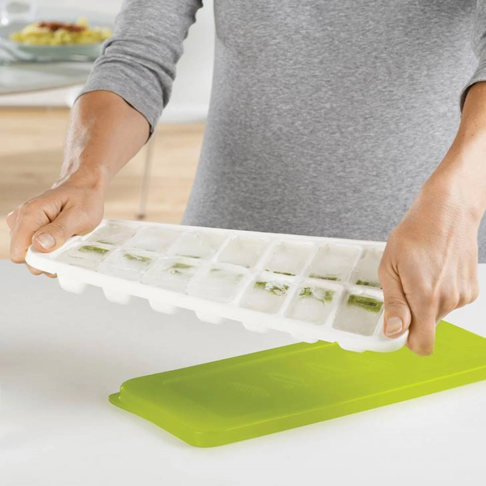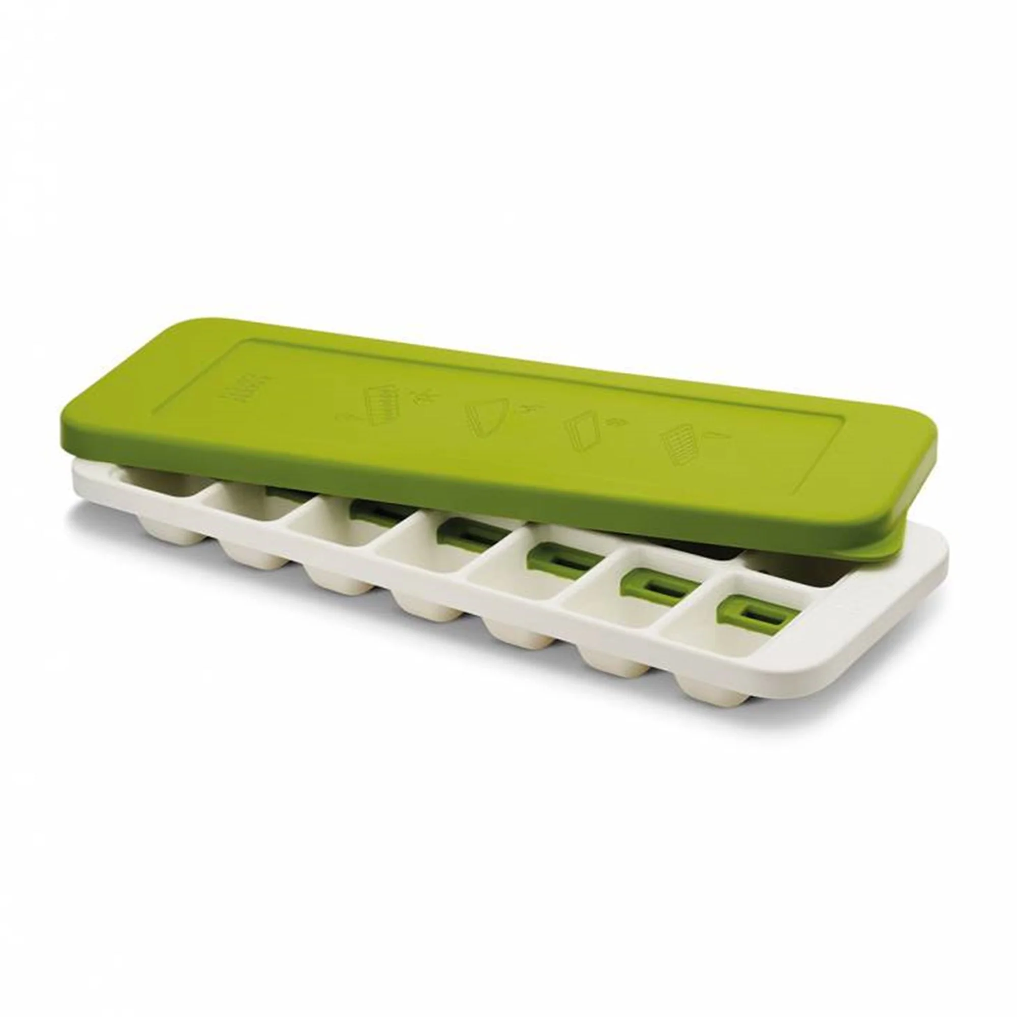 a Cubetera de Hielo Quicksnap Verde Joseph Joseph tiene un sistema especial que te permite liberar cada hielo por separado, sin necesidad de sacarlos todos a la vez. Simplemente llena la cubetera con agua, tápala y métela al freezer. Cuando los hielos estén listos, saca la tapa, tuerce la cubeta para soltar los hielos y luego presiona la palanca en la parte posterior para soltar cada hielo por separado. Su tapa evita salpicaduras y además permite apilar las cubeteras una sobre otra.