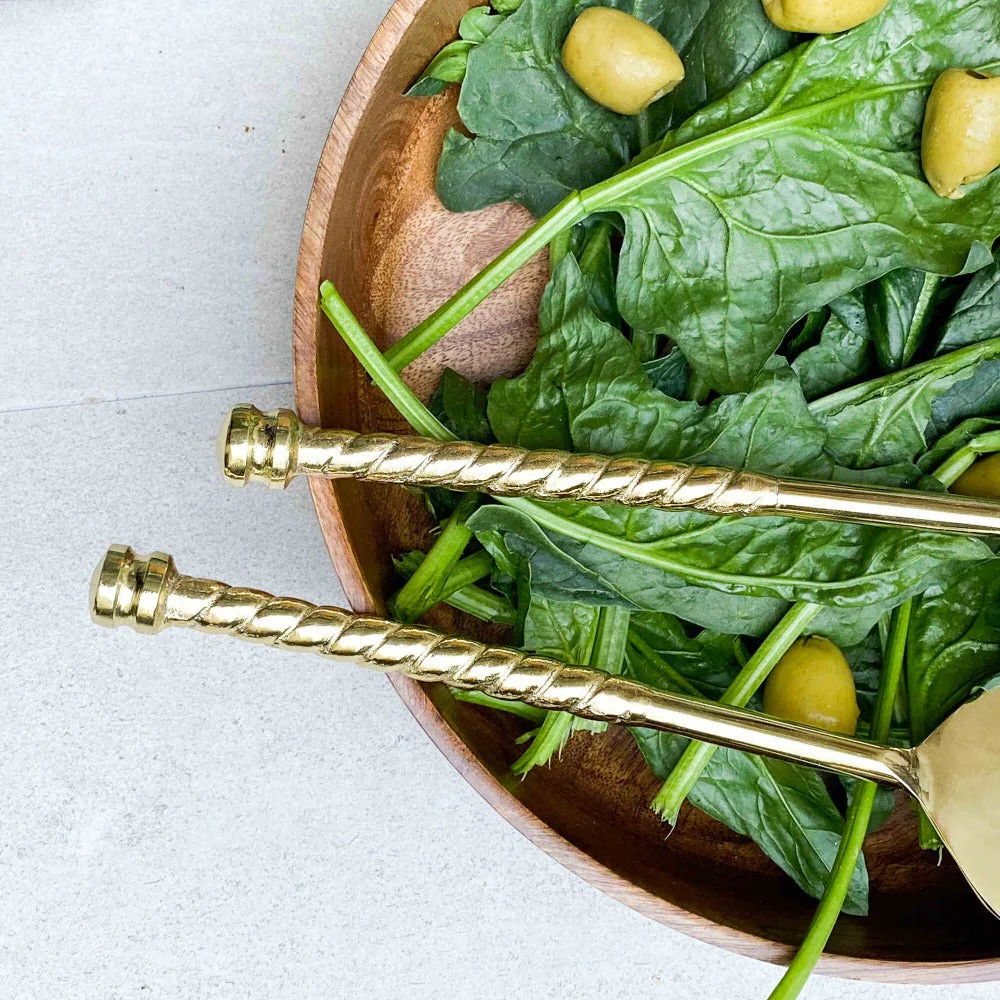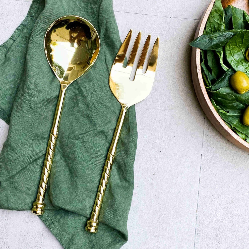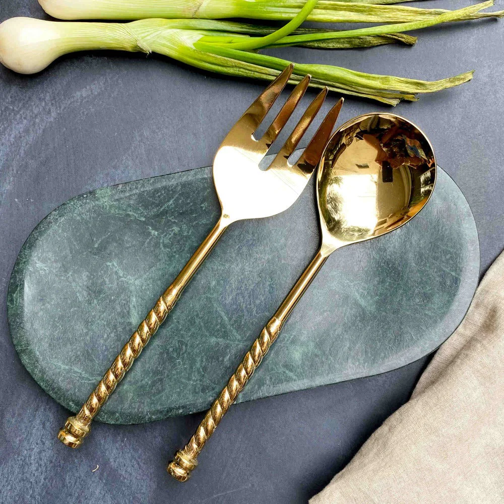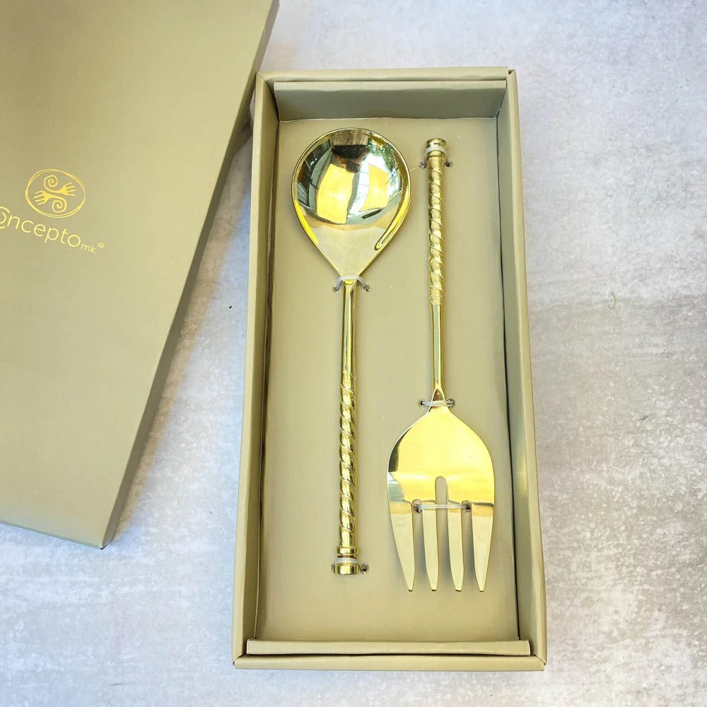Elegante y exclusivo set de 2 piezas metálicas de cucharas de la marca Concepto MK con terminación dorada para lucirte en la mesa con tus ensaladas o para un lindo regalo. Viene en una linda cajita de presentación. NOTA: limpiar con paño suave, lavado a mano sin productos abrasivos.