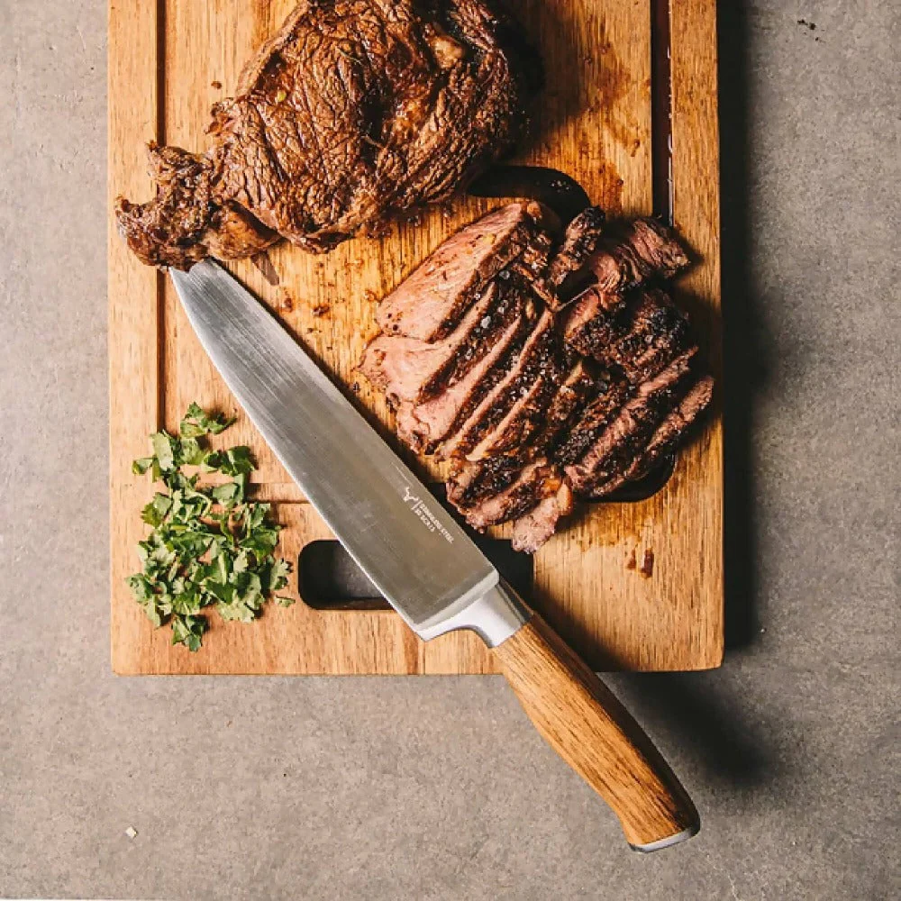 Equipa tu cocina y comparte en tus asados, con la variedad de productos. Cuchillo PRM con Mango de madera acacia y hoja de Acero inoxidable.
