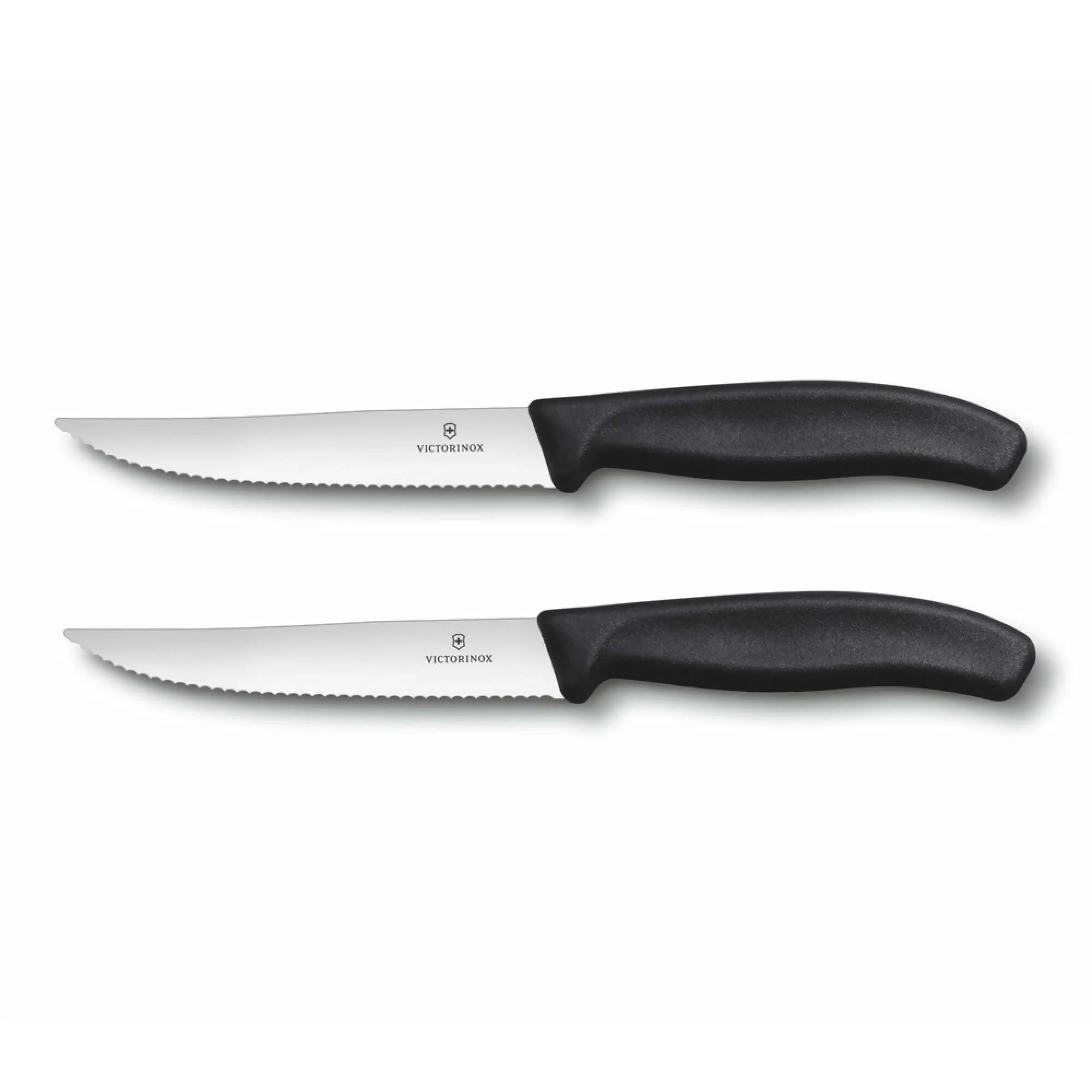 Cuchillos para carne ergonómicos con filo dentado. Los cuchillos para carne Victorinox no sólo facilitarán la tarea de cortar carne, sino que también enriquecerán sus veladas con amigos. Gracias a sus mangos ergonómicos que se funden con su mano y las hojas súper afiladas que cortan sin esfuerzo, usted puede concentrarse en el menú y en la ocasión.