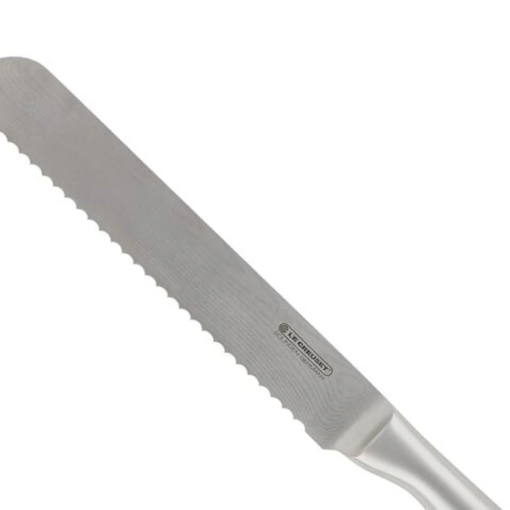 Cuchillo Pan Acero 20 Cm con Mango de Acero Inoxidable de Le Creuset. Hogazas. baguettes, bizcochos e, incluso, carnes envueltas en crujiente hojaldre. Rebana todo fácilmente con ayuda de este cuchillo. Fabricado con maestría, presenta una hoja de acero de Damasco con un filo dentado superafilado. El mango de acero inoxidable le confiere un aspecto elegante. Los mejores de su categoría: nuestros productos se fabrican con los mejores materiales en instalaciones de todo el mundo para garantizar la calidad que esperas de Le Creuset.