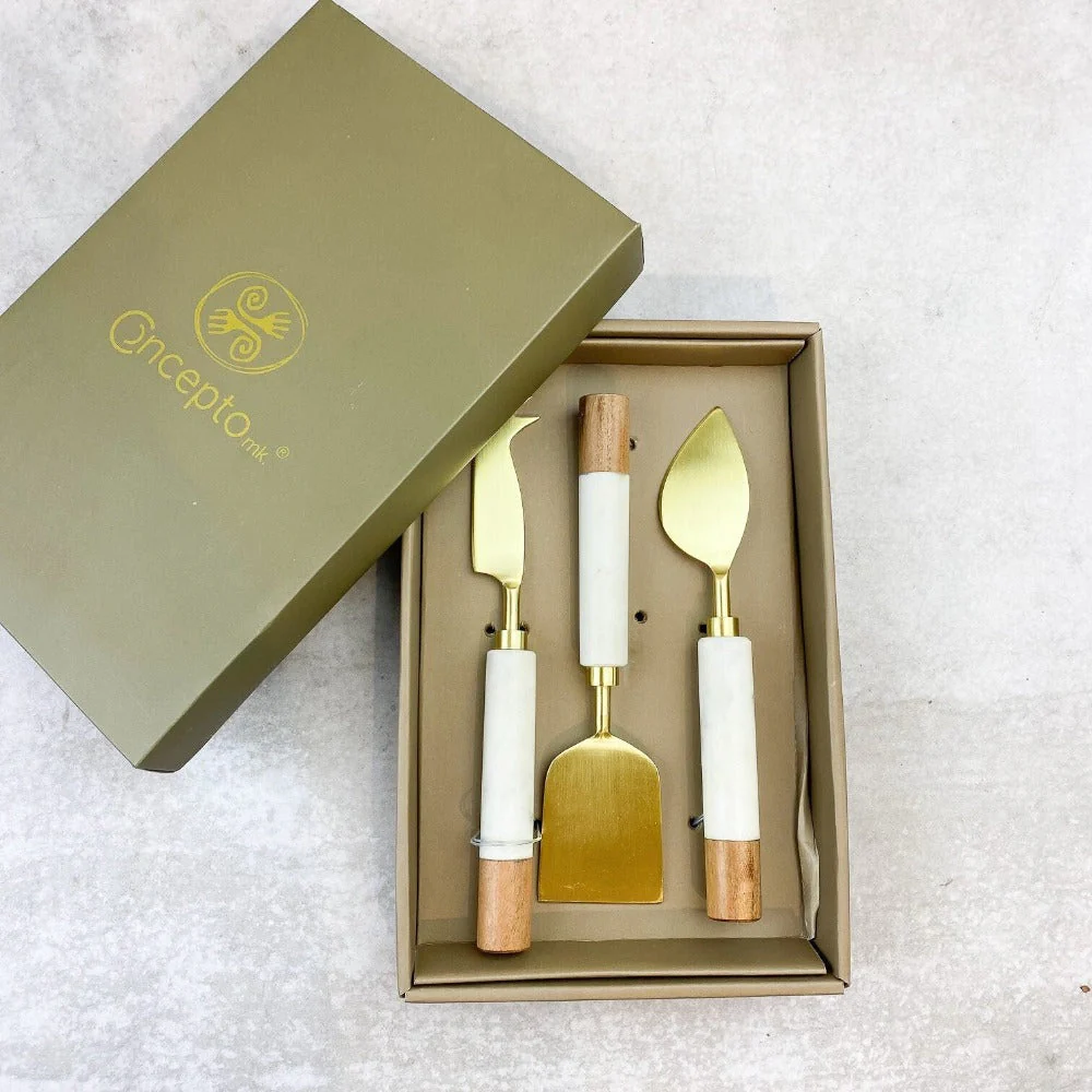 Lúcete con nuestro elegante set de 3 cuchillos para diferentes tipos de quesos, mango de mármol y madera acabado. Disfruta y comparte momentos especiales con la familia y amigos, o simplemente sorprende con el regalo perfecto. Presentados con cuidado en una linda caja de Concepto MK.
