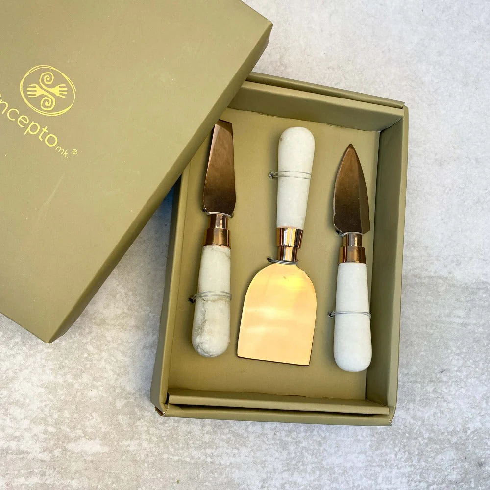 Elegante set de 3 cuchillos de Concepto MK para diferentes tipos de quesos en acabado de cobre y mango de mármol, para disfrutar y compartir tu picoteo o aperitivo con familia y amigos, o simplemente el regalo perfecto. Linda presentación en caja. NOTA: lavado a mano sin productos abrasivos.