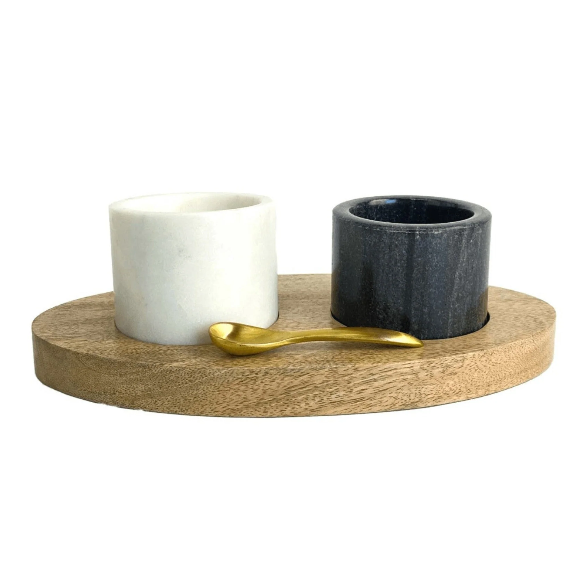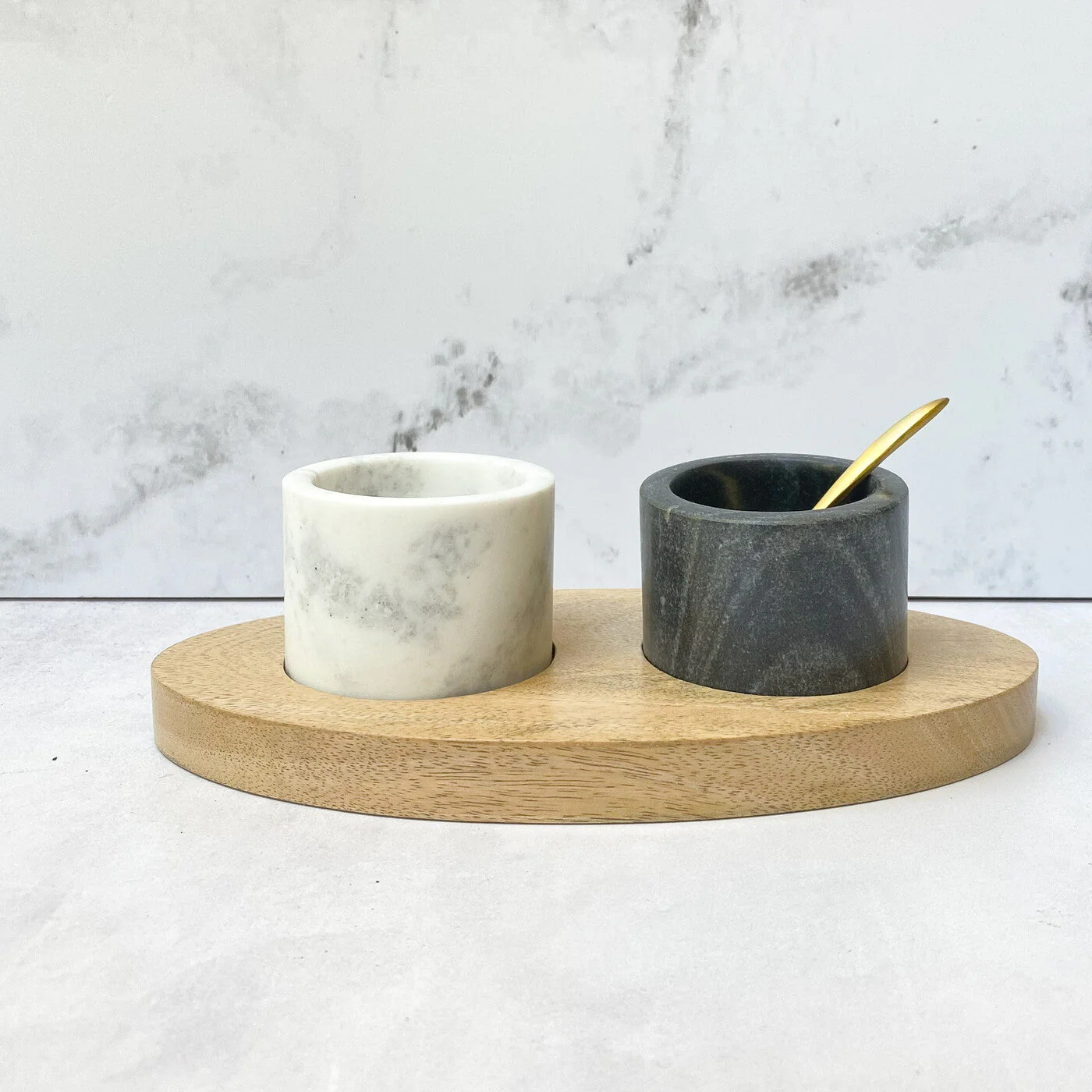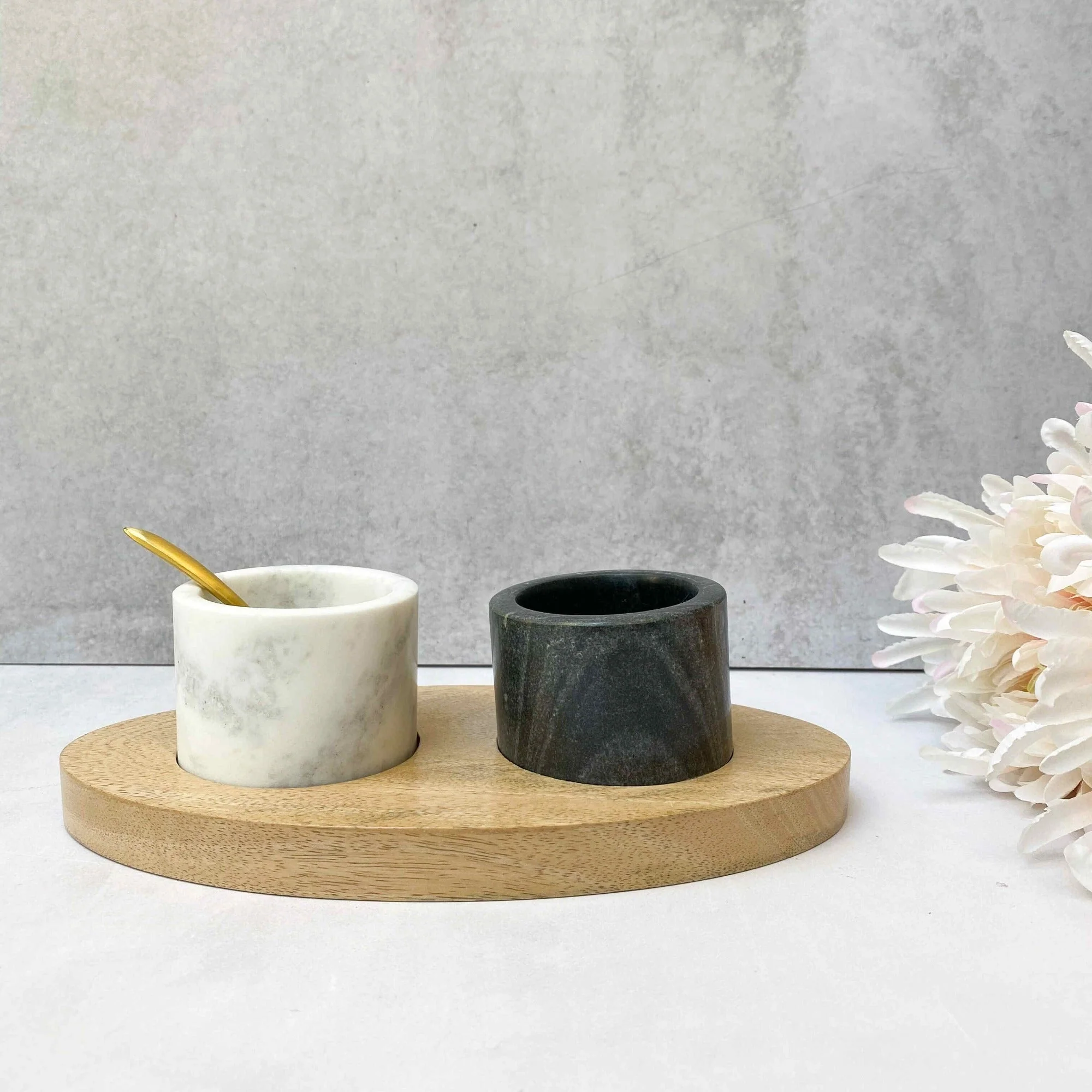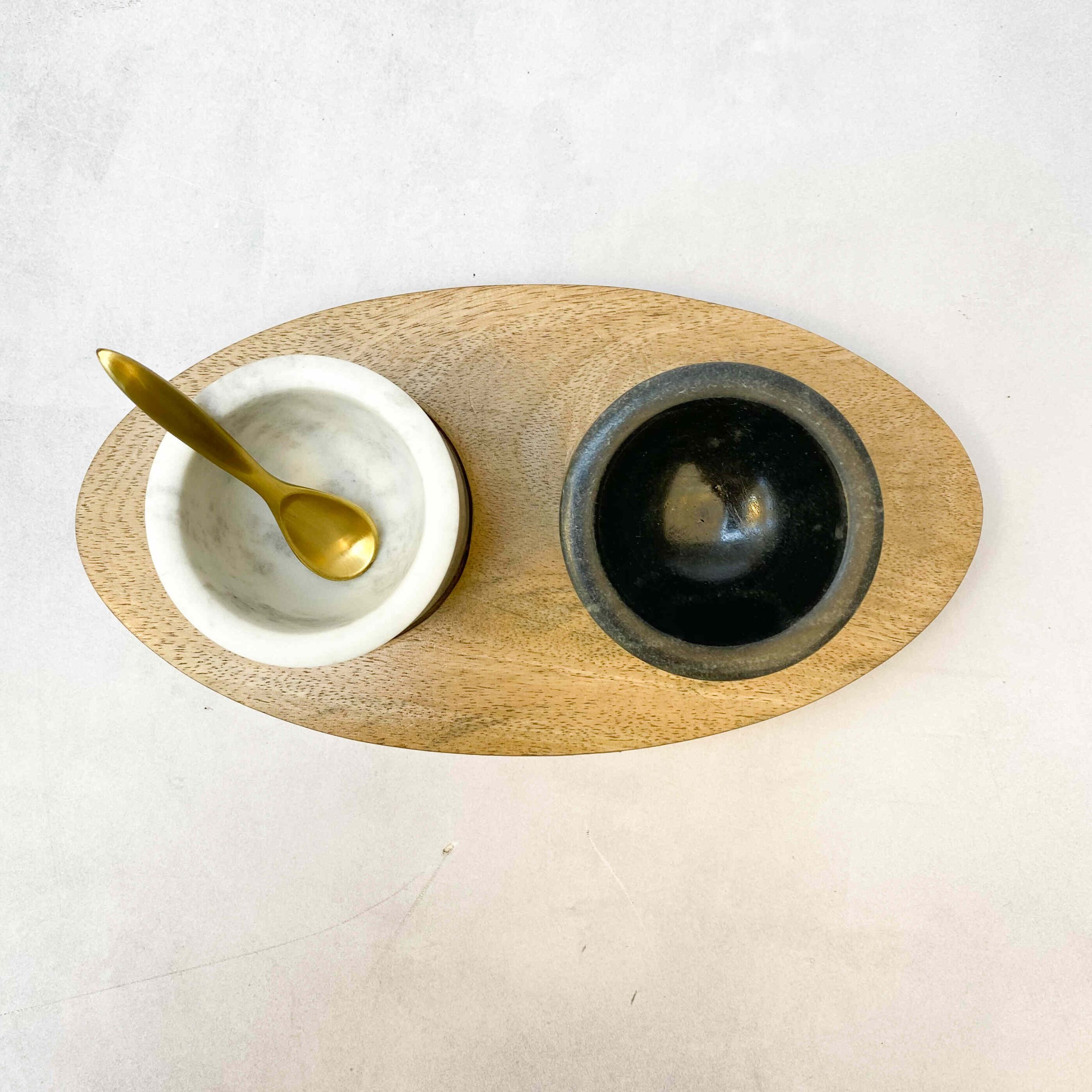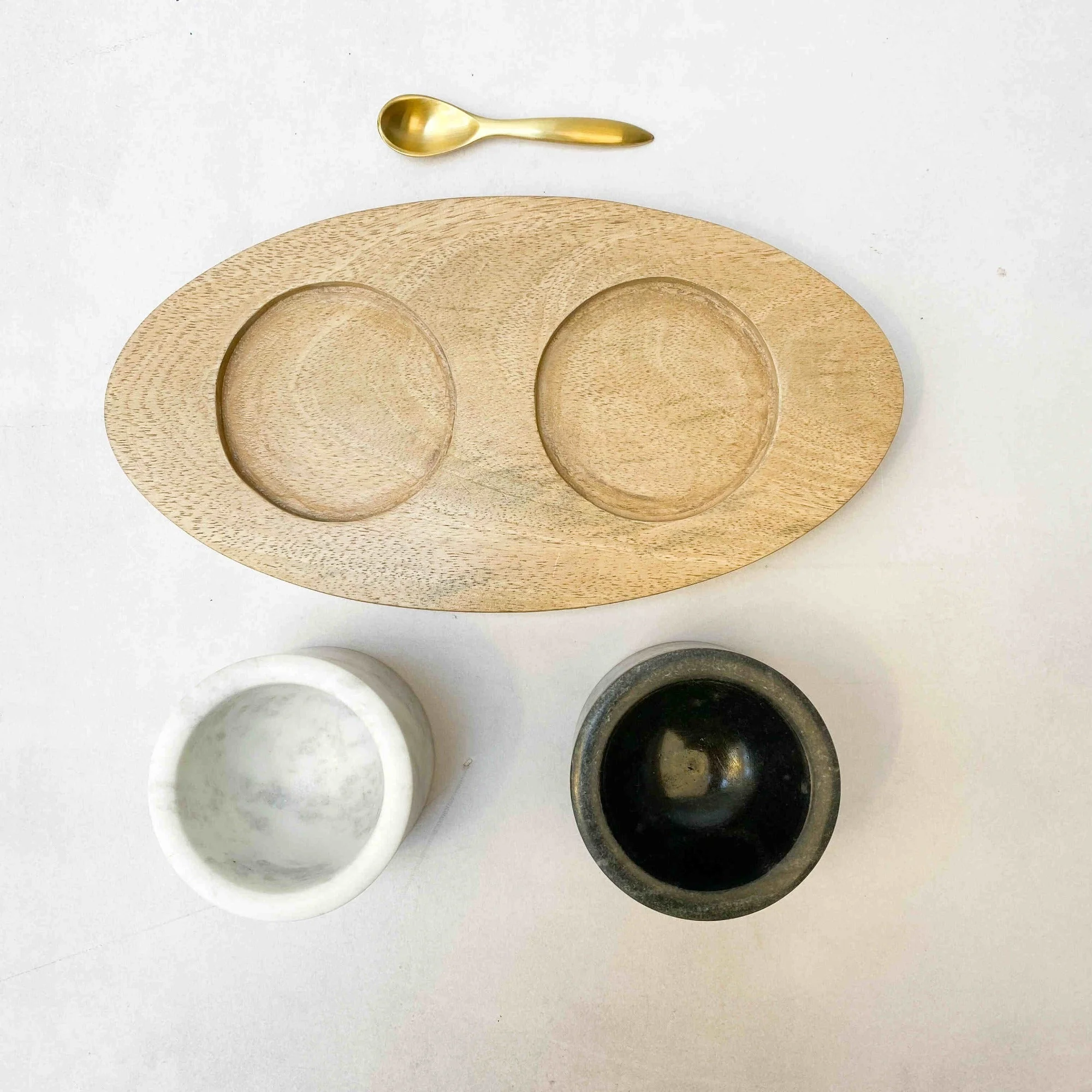 Bandeja de madera de mango con dos cuencos de mármol, uno blanco y otro negro. Perfecto para disfrutar los más ricos aperitivos, para galletitas, frutos secos o ricas pastas de acompañamiento. Incluye 2 cuencos de mármol, una cucharita dorada y una bandejita de madera. Debido a que el mármol es un producto natural se producirán diferencias de vetado y coloración. Evite usar con aceites calientes. Como sustancia porosa se manchara si es que se deja que los derrames se asienten.