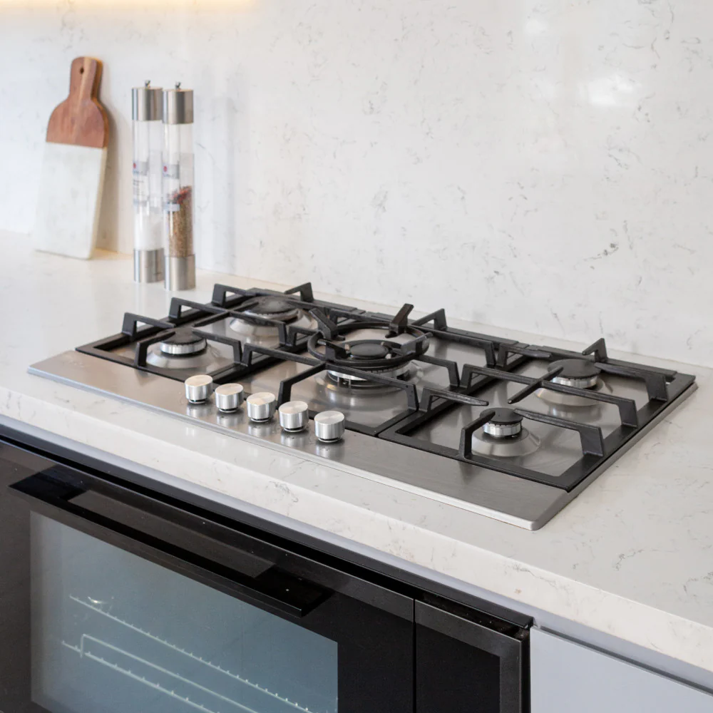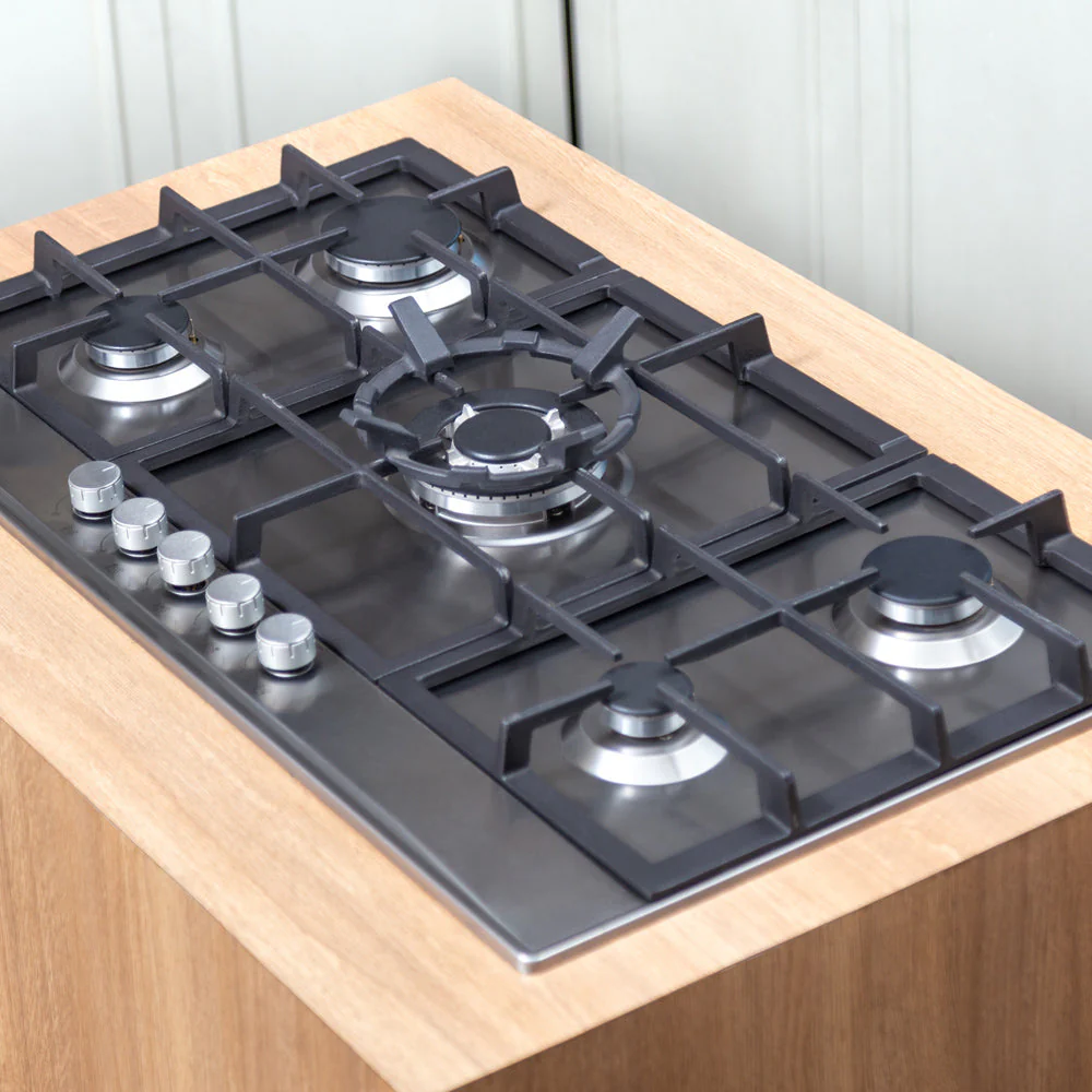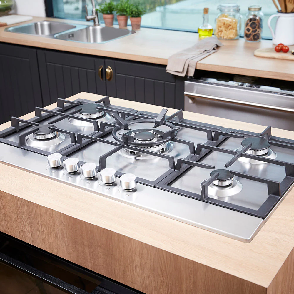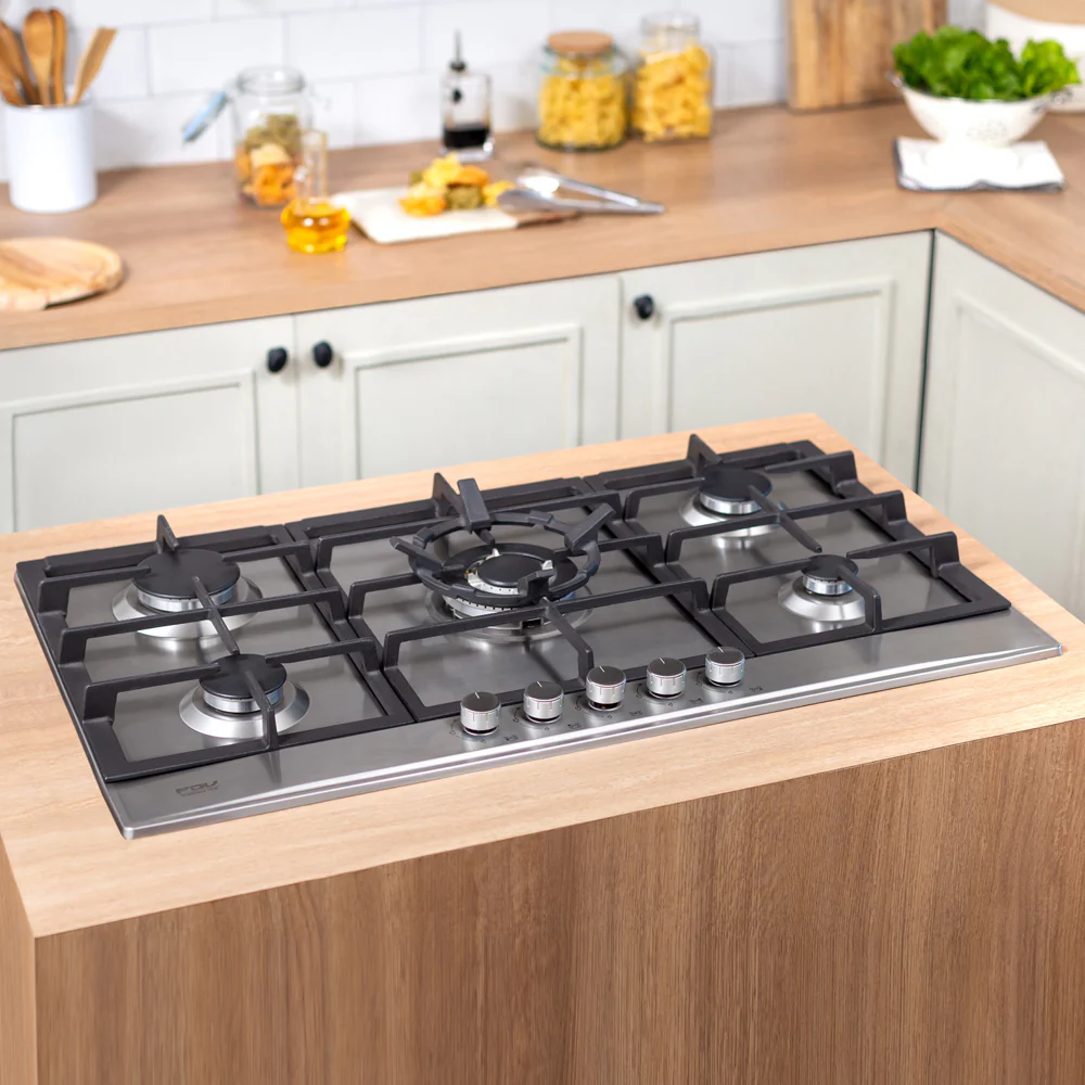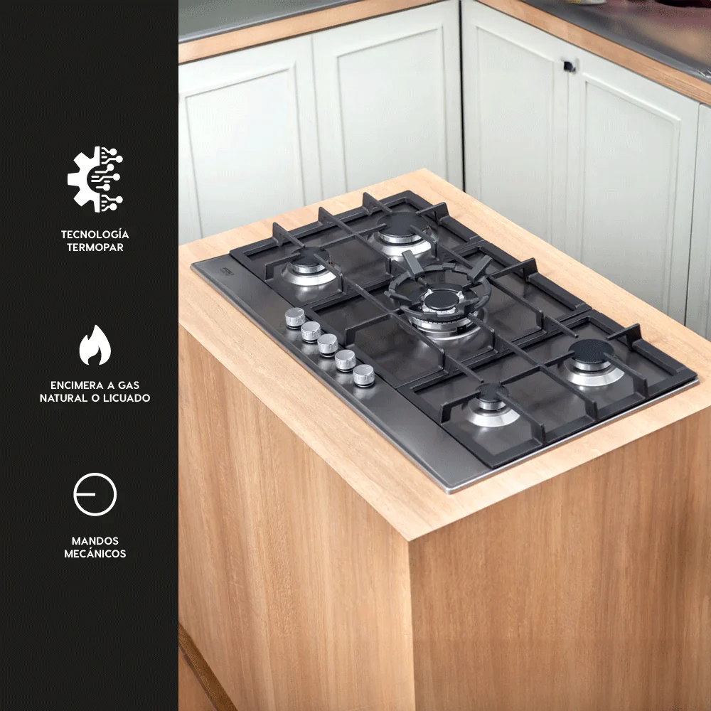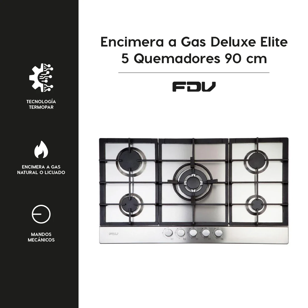 La Encimera Design 5 Quemadores 90 de FDV es una opción elegante y funcional para cualquier cocina moderna. Con una superficie de cocción a gas, esta encimera cuenta con cinco quemadores, incluyendo un quemador central de triple corona, ideal para cocinar a alta potencia y distribuir el calor de manera uniforme. Las parrillas de hierro fundido aseguran durabilidad y una excelente retención de calor. Las medidas de la encimera son 104 mm de altura, 860 mm de ancho y 500 mm de profundidad, lo que la hace adecuada para cocinas amplias que requieren una zona de cocción eficiente y versátil.
