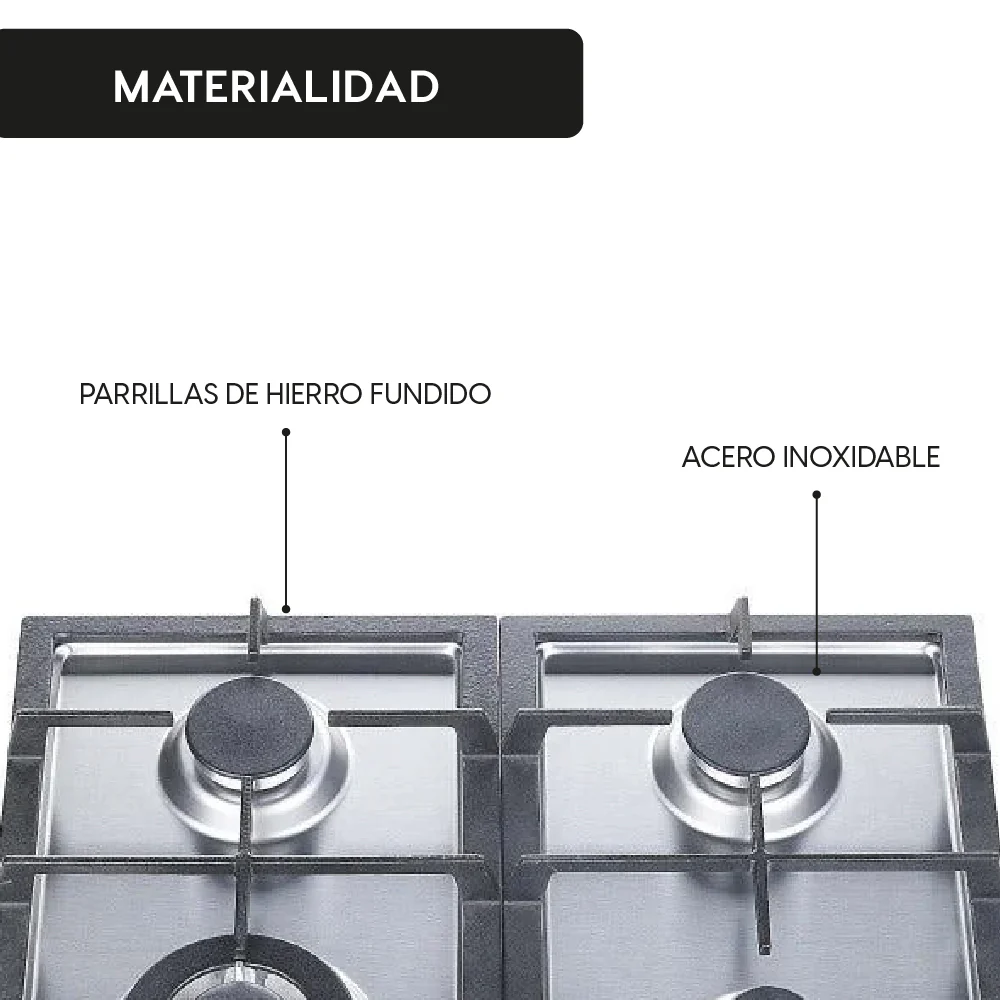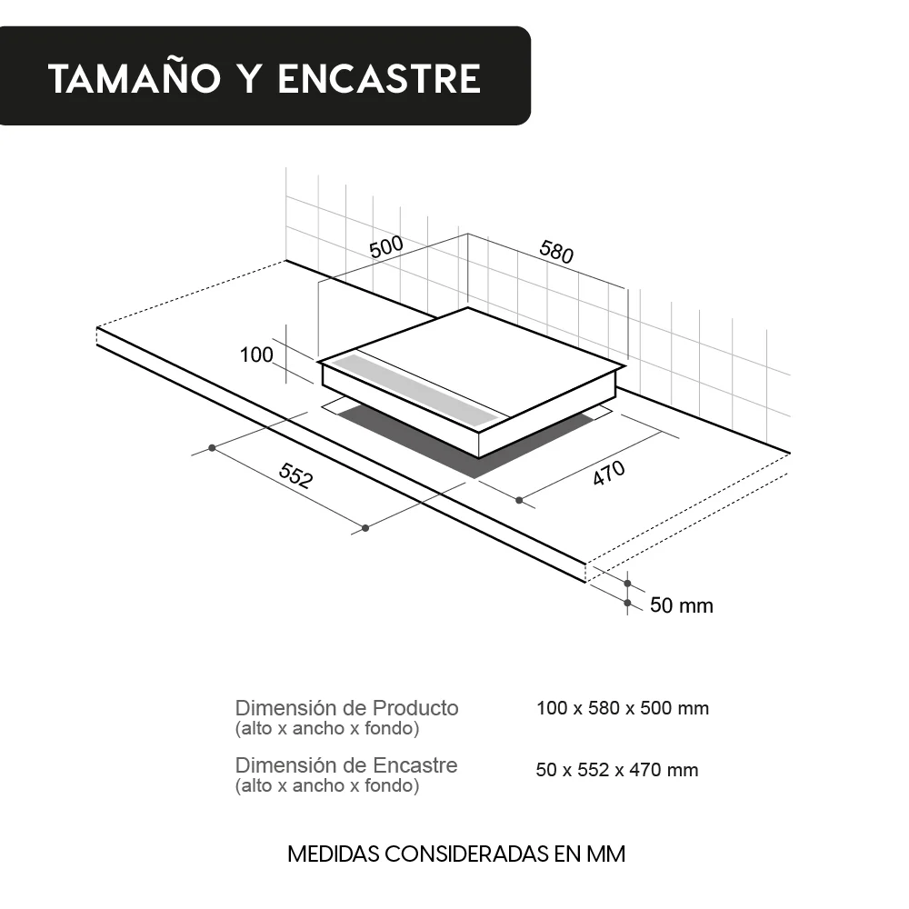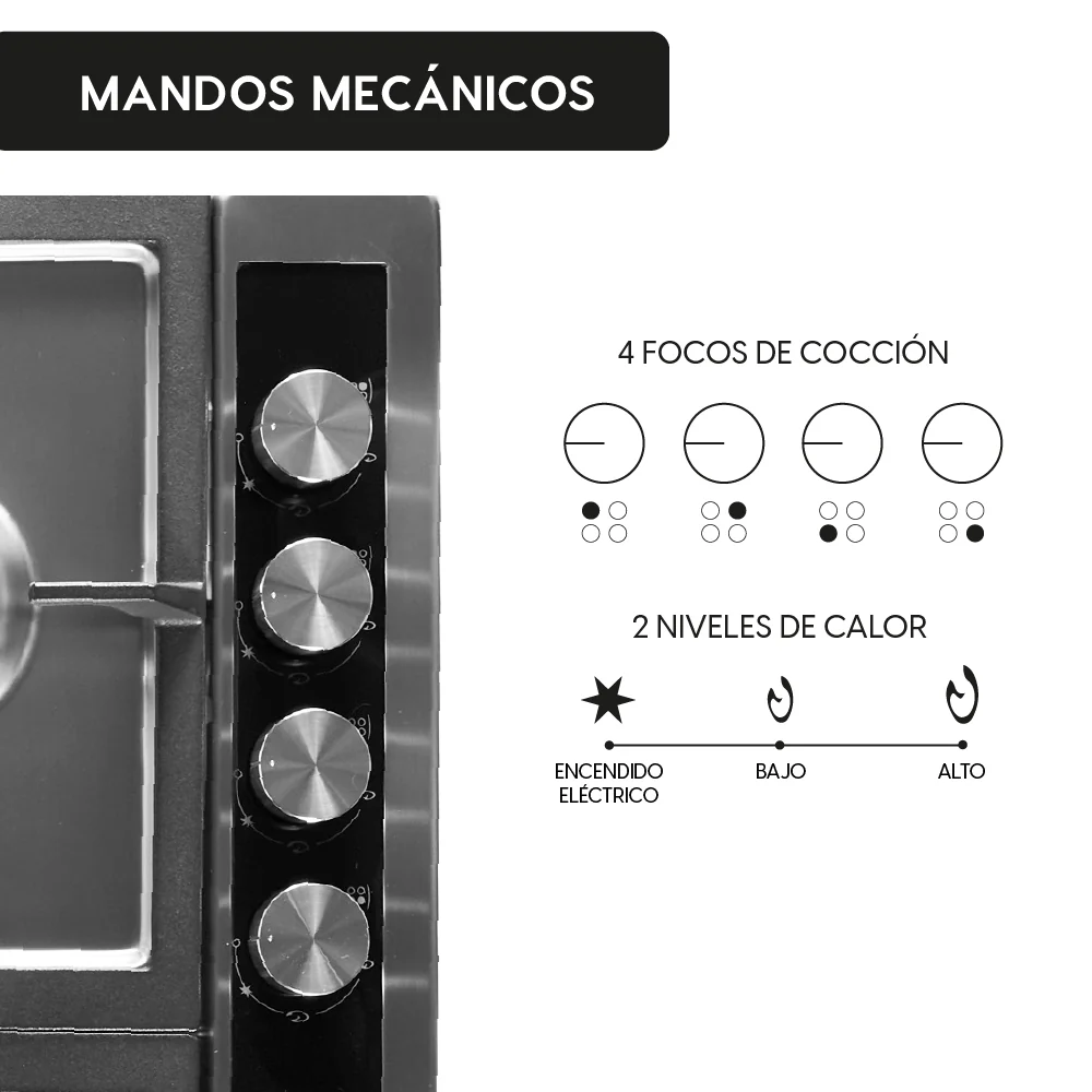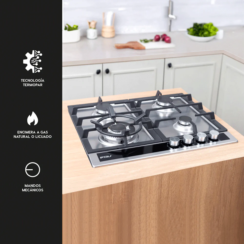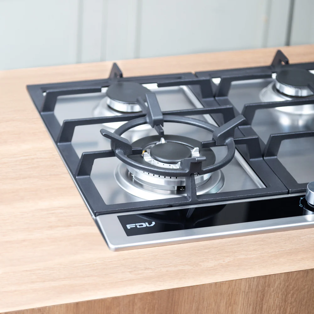 La Encimera Prestige 4 Quemadores de FDV, con parrillas de hierro fundido y quemador de triple corona, es ideal para cocinas que buscan estilo y funcionalidad. Su potente distribución de calor es perfecta para platos que requieren altas temperaturas. Incluye un porta wok para una cocción rápida y uniforme de recetas asiáticas. Las medidas son 100 mm de altura, 580 mm de ancho y 500 mm de profundidad, adecuada para espacios compactos.