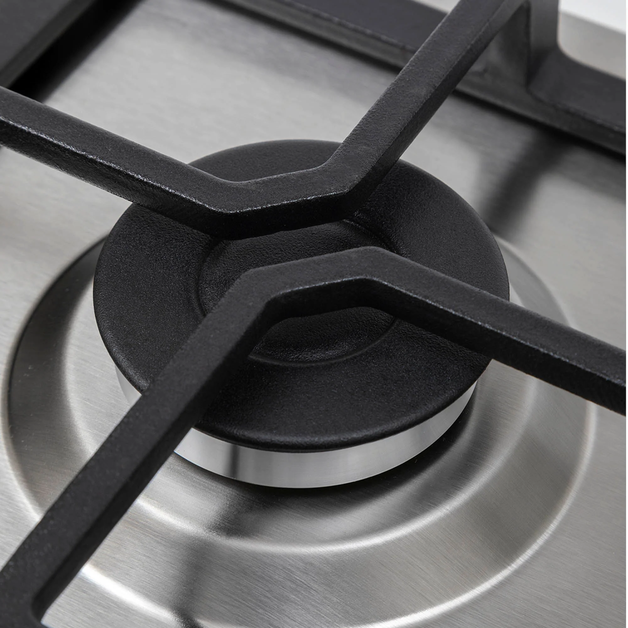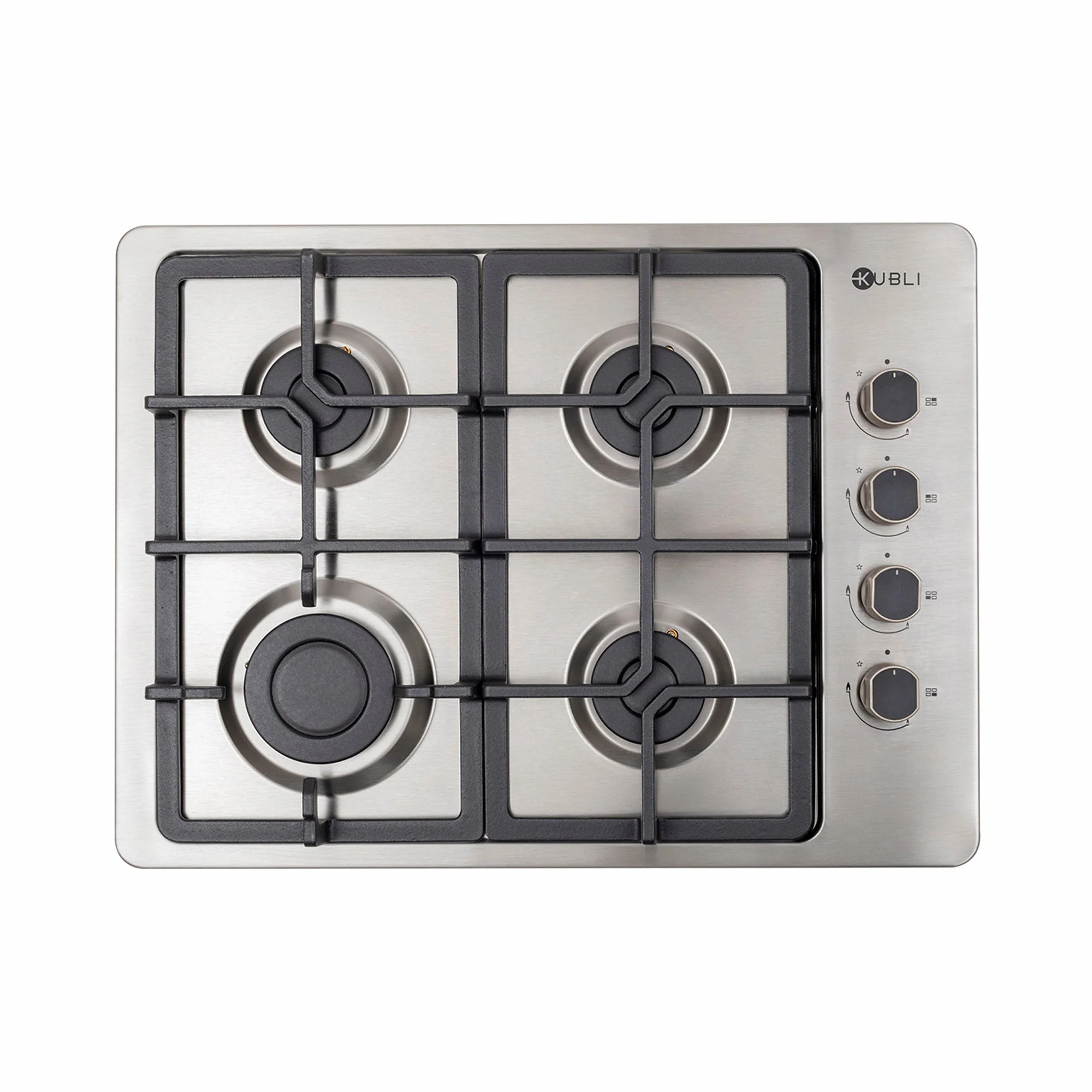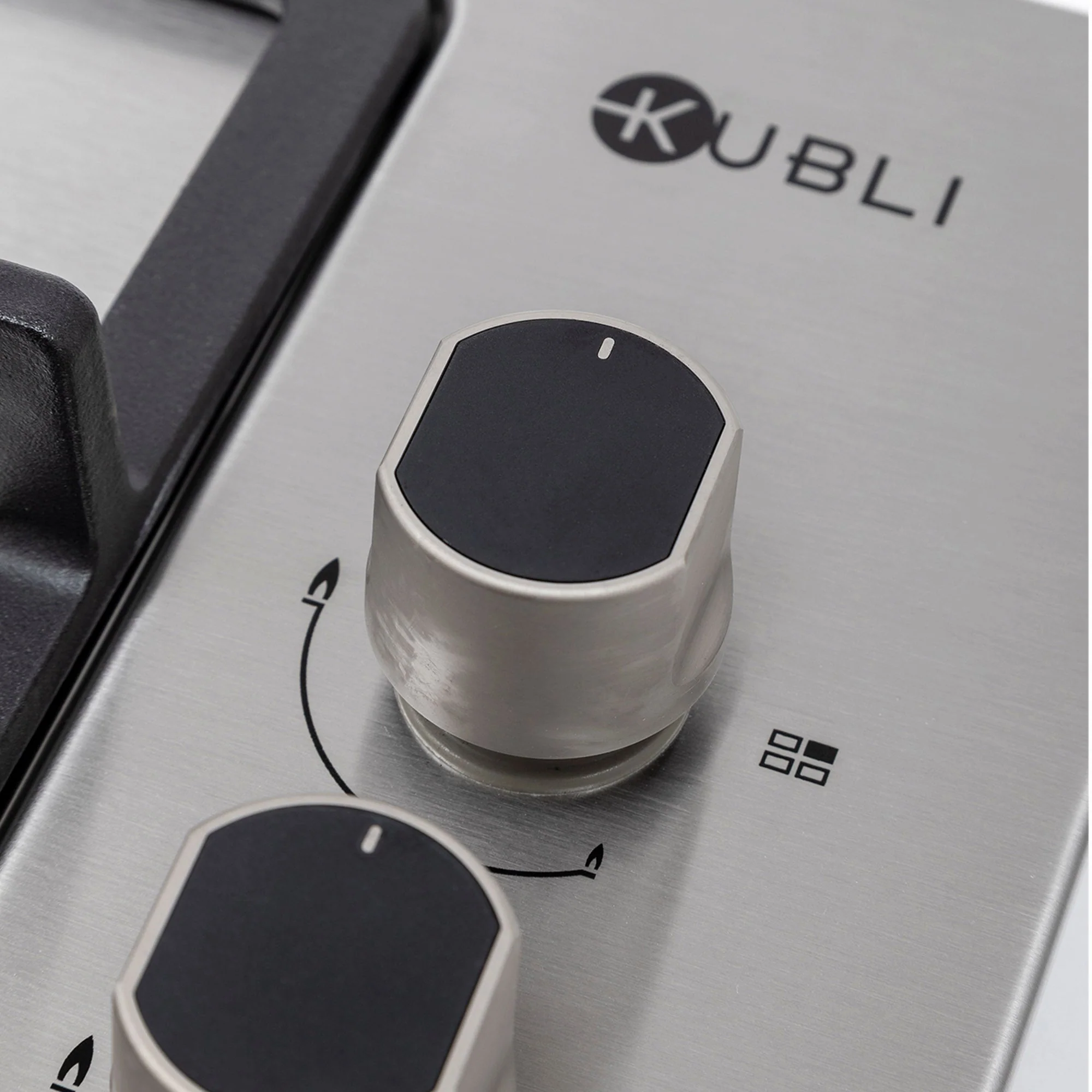 La Encimera Kubli Teo de 4 quemadores, de 58 cm, ofrece potencia y seguridad. Su sistema FFD corta automáticamente el gas si la llama se apaga, garantizando protección. Con parrillas de hierro fundido y perillas de metal, combina durabilidad y estabilidad. Incluye un quemador triple corona para cocciones rápidas y un quemador semi-rápido para mayor versatilidad. Con medidas de 540×400 mm, es perfecta para optimizar el espacio en la cocina.