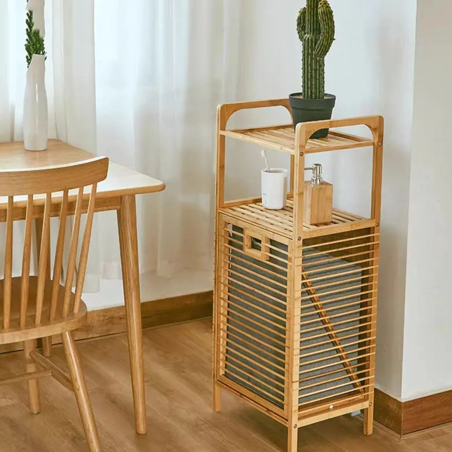 Organiza tu ropa al mismo tiempo que reduces espacios, con este moderno Estante de Bambú para Lavandería. Su estructura de madera hace que además de tener una apariencia moderna, también es ecológico; ya que esta hecho con madera de bambú, con un bolso es de genero, haciendo que sea ligero. Tiene una estructura firme, cuenta con dos repisas multi-función potenciando aún más su utilidad.