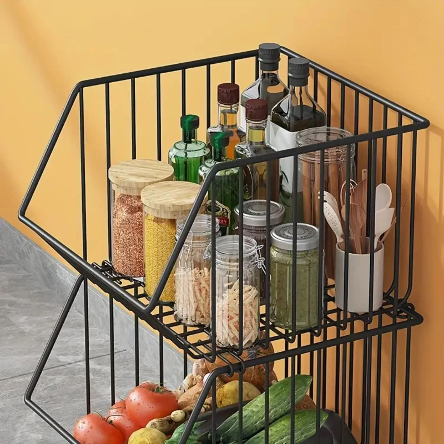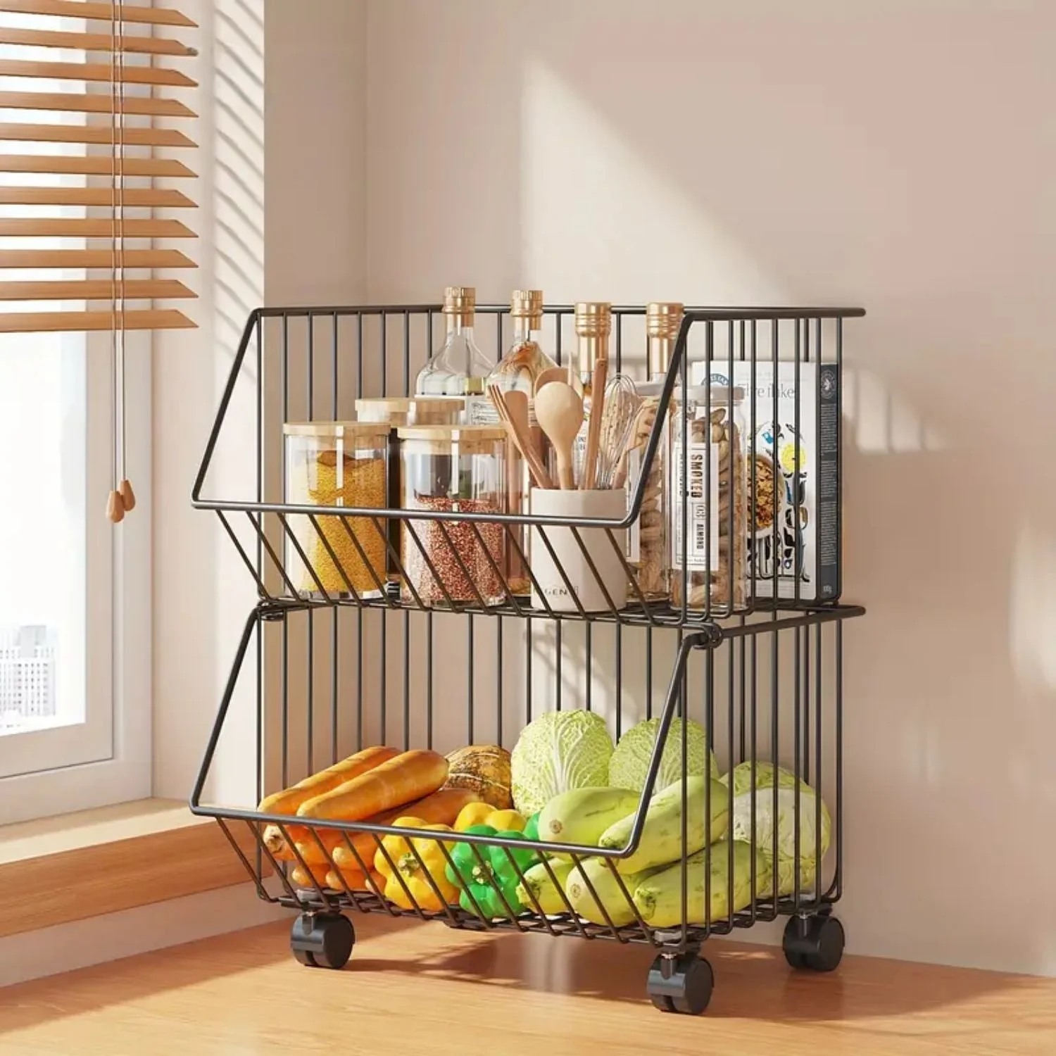 Dale un mejor orden a tu cocina con esta Cesta Organizadora de Metal Con Ruedas. Acomoda de manera funcional los productos del supermercado, las frutas, los vegetales, reduciendo espacios en tu cocina. Una característica notable son sus cestas, las cuales son desmontables y apilables; dando la oportunidad de seleccionar los niveles según la necesidad, así como elegir el lugar adecuado para su ubicación. Adicional a ello, la cesta principal cuenta con ruedas giratorias en 360°, las cuales son resistentes al peso y movimiento, agregando sistema de freno para su seguridad.