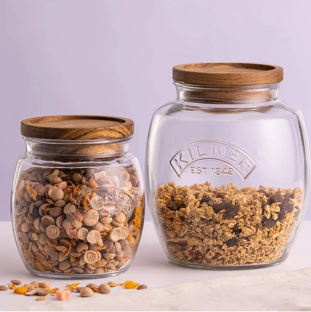 Los frascos universales Kilner® ahora presentan tapas superiores Push Top a presión de madera de acacia, cada una con un patrón de vetas y un color distintivos para darle un toque artesanal. Combinando elegancia con funcionalidad, estos frascos versátiles son a la vez elegantes y prácticos. Las tapas son herméticas, combinadas con sellos de silicona, garantizan un almacenamiento óptimo de diversos alimentos secos como cereales, pastas, legumbres, etc. perfecto para organizar su despensa. Más allá de la cocina, estos frascos añaden un toque decorativo a los ambientes de su hogar, manteniendo un espacio ordenado.