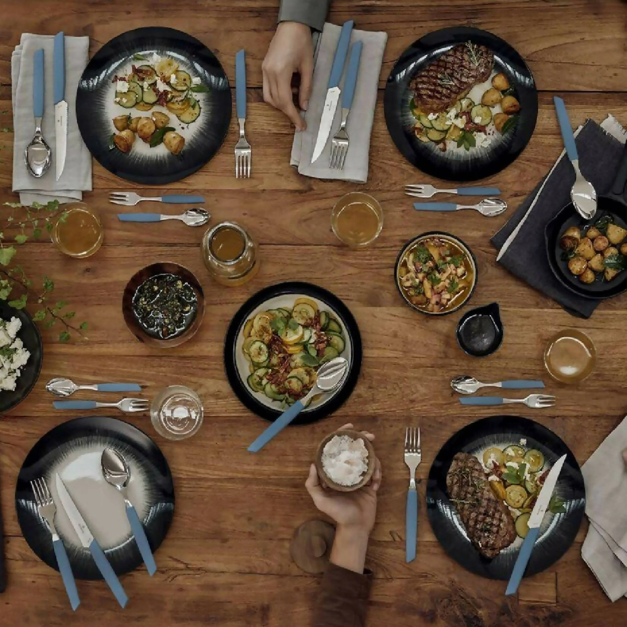 Obtenga un aspecto moderno y elegante con este juego de cubiertos a la moda. Con equilibrio perfecto y elegancia simple, cada pieza está fabricada de acero inoxidable ligero y duradero a la vez, con hojas súper afiladas y mangos sintéticos agradablemente cómodos. Con una variedad de modernos colores de mango, el juego de mesa Swiss Modern, 24 piezas, definitivamente aportará clase y practicidad a su mesa. Contiene: 6 tenedores de mesa Swiss Modern. 6 cuchillos para bistec Swiss Modern de filo dentado. 6 cucharas de mesa Swiss Modern. 6 cucharitas para café Swiss Modern.