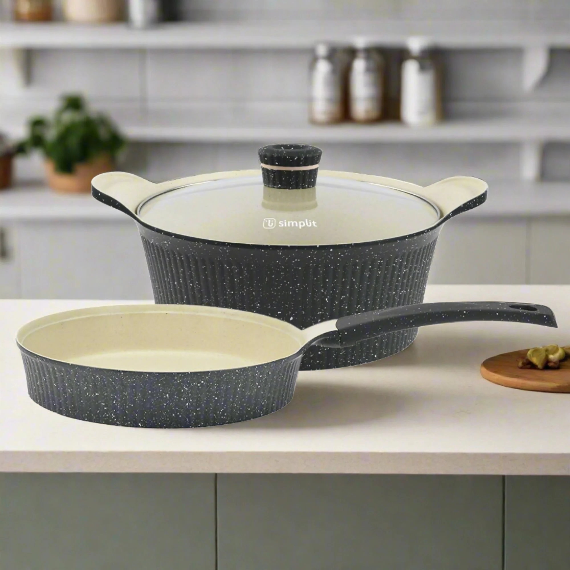 Descubre el Kit Olla 28 cm + Sartén 24 cm Antiadherente de la marca Simplit, perfecto para tu cocina. La Olla de 28 cm y el Sartén de 24 cm de la colección Cosmos presentan un diseño marmolado inspirado en la galaxia, con exterior verde petróleo e interior crema, proporcionando una sensación natural al cocinar. Ambos están hechos de aluminio fundido, garantizando excelente almacenamiento de calor y son aptos para todas las placas de cocina, incluidas las de inducción. ¡Renueva tu cocina con este elegante y funcional kit de Simplit y disfruta de cocinar con estilo y calidad!