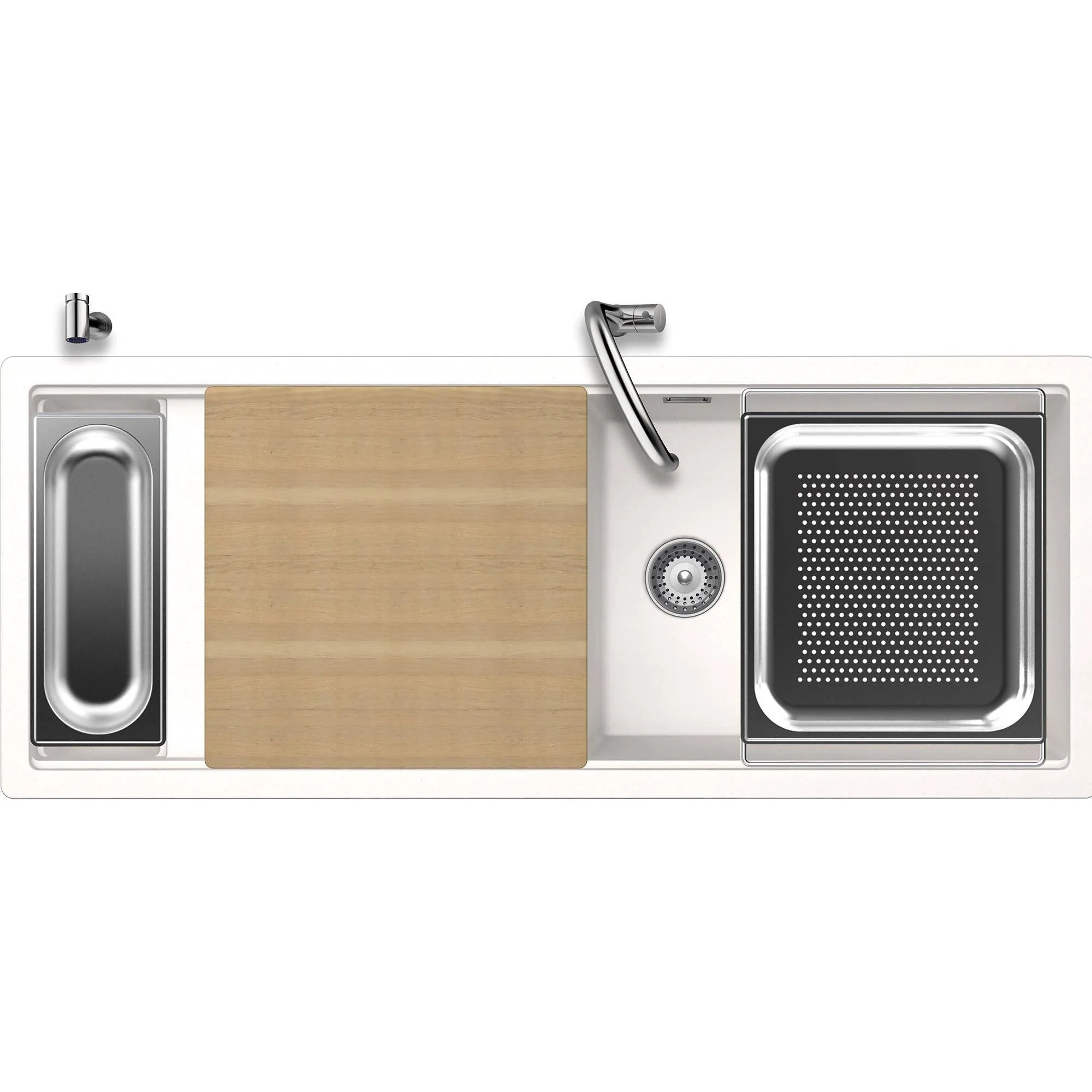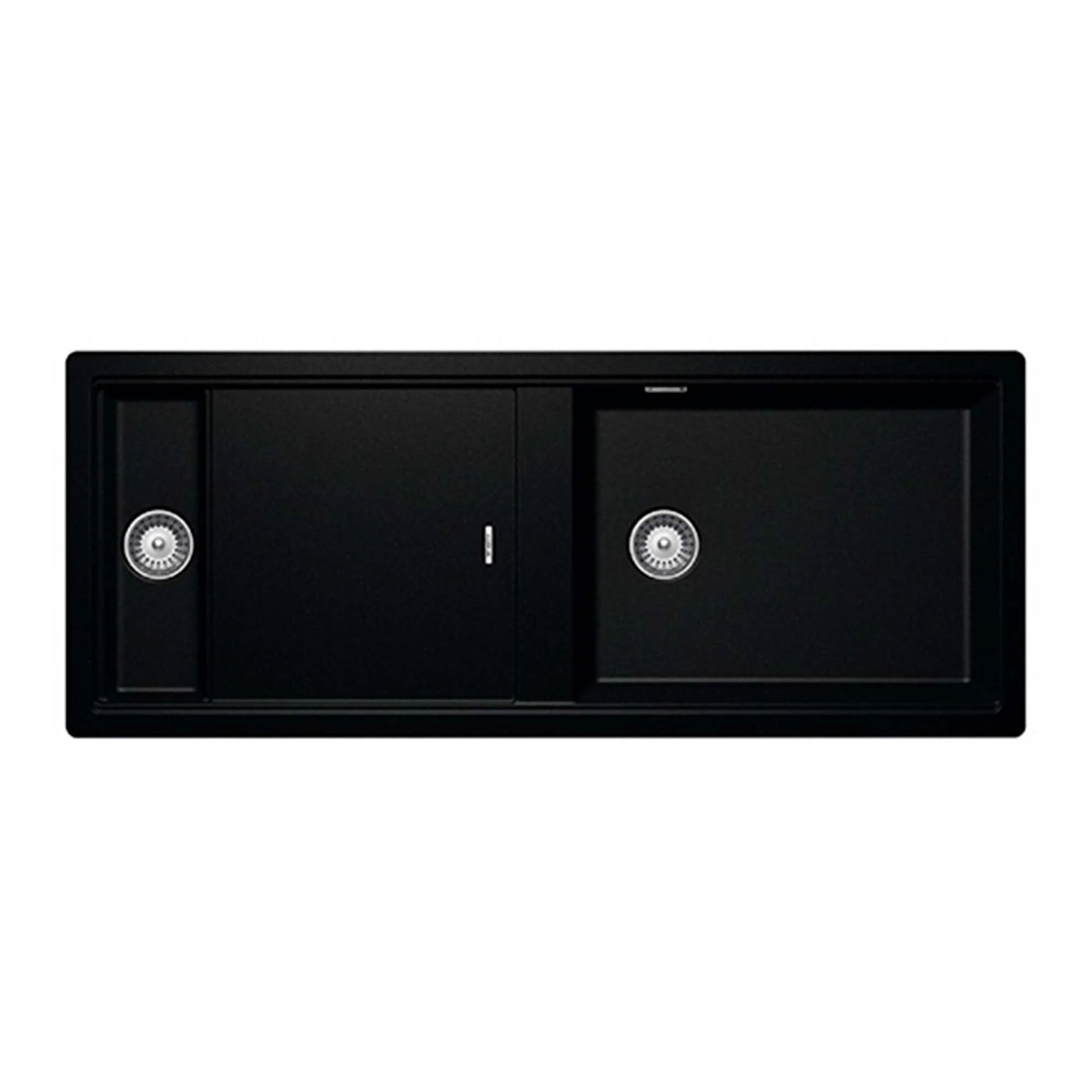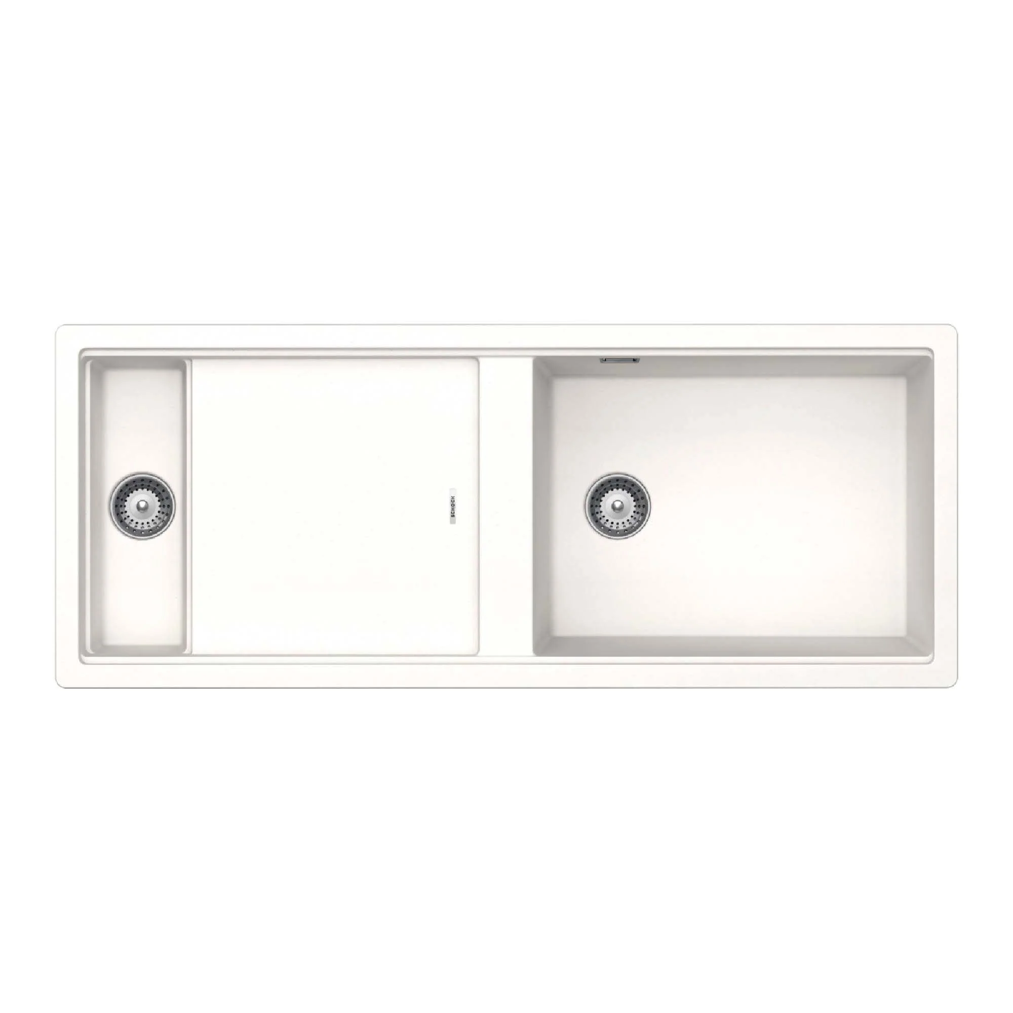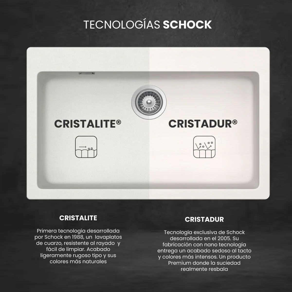Lavaplatos de 2 cubas con escurridor, su composición es de 80% de cuarzo, 20% resina acrílica entregando una superficie de alta resistencia a impactos, repelente a la suciedad, a prueba de calor y pro higénico (superficie antibacterial). La instalación puede ser sobre o bajo cubierta e incluye accesorios de acero inoxidable como canastillo, copa de drenaje, tapa de rebalse, tabla de madera, grilla de acero inoxidable, bowl grandey pequeño, no incluye sifón. Fabricado en Alemania.