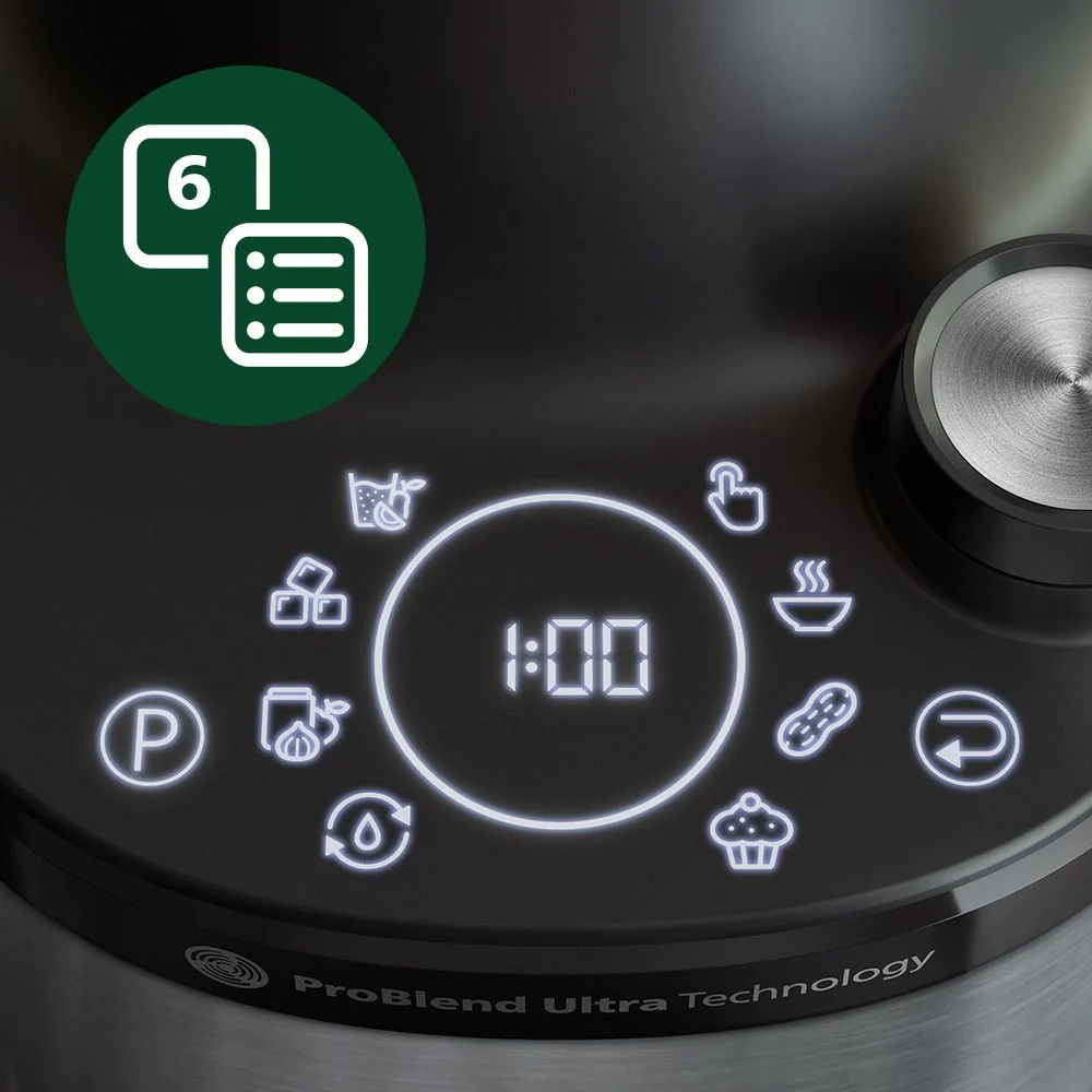 La tecnología ProBlend Ultra combina 3 características diseñadas a medida para trabajar en perfecta sincronía y ofrecer la mejor variedad de sabor y textura que tanto te gusta en todo momento. Los programas de selección rápida de la pantalla digital se definen con el ajuste de tiempo y velocidad para que crees tus recetas favoritas de forma sencilla. Entre ellos se incluyen: batido, mantequilla, postre, sopa y salsa, así como de funciones de picado de hielo y limpieza. La función de limpieza elimina incluso los residuos más difíciles, como las masas de tartas y las mantequillas.