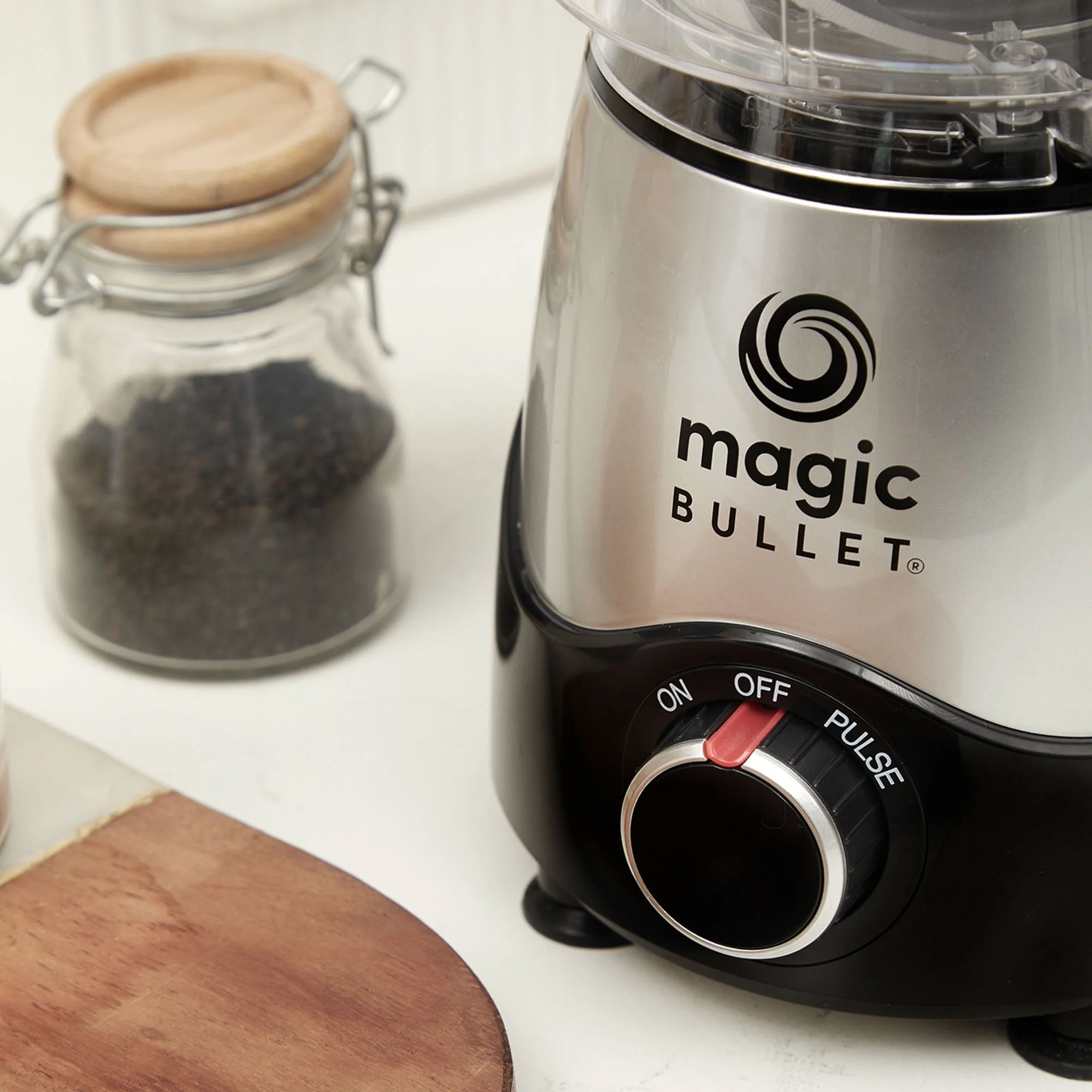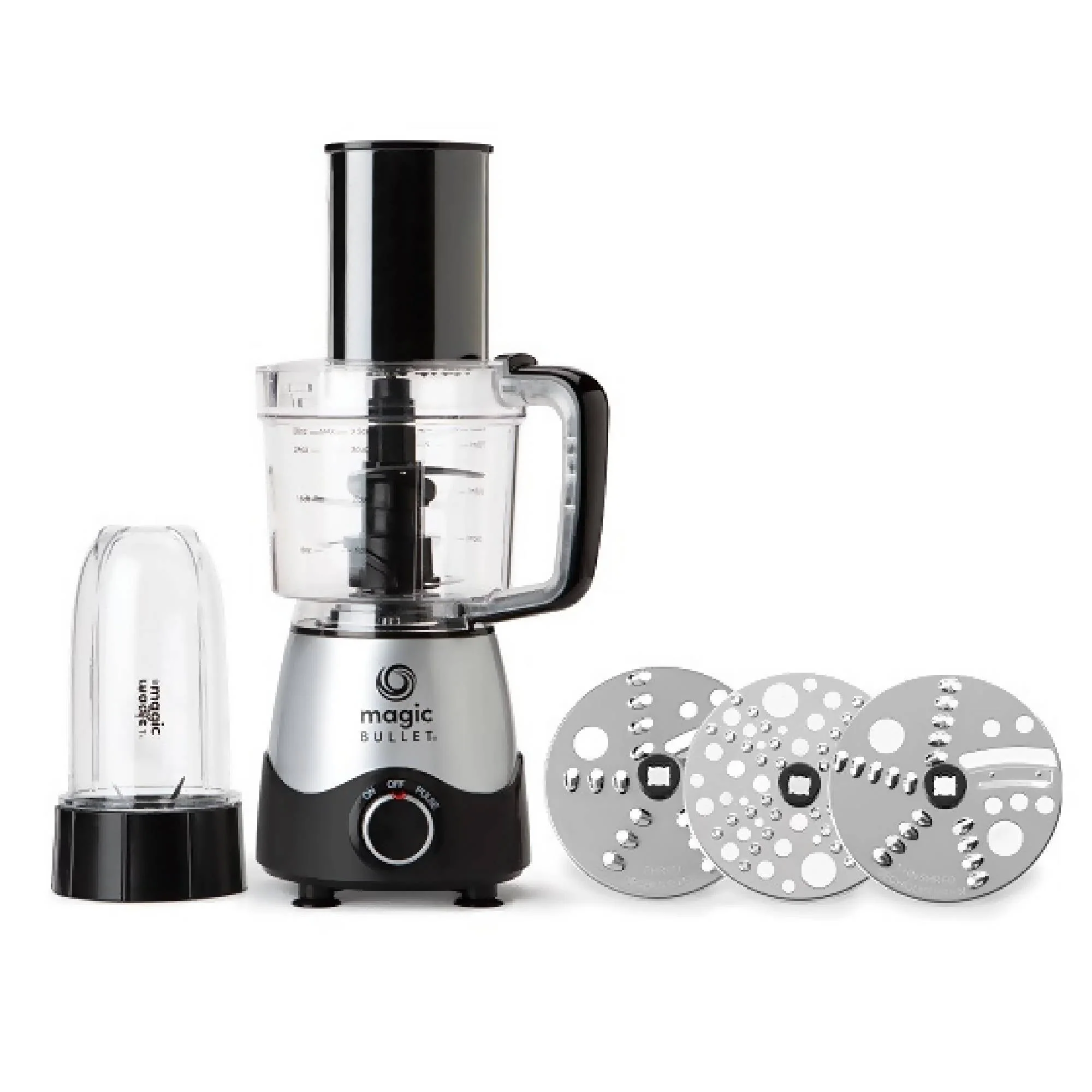 La Magic Bullet Kitchen Express es un dispositivo todo en uno que ahorra tiempo en la cocina. Con una potente base de motor de 250 W, permite picar, mezclar, rebanar, triturar y más. Incluye una guía de recetas para platos rápidos y deliciosos. Compacto y apto para encimera, sus componentes de acero inoxidable y plástico duradero y sin BPA son aptos para lavavajillas, facilitando la limpieza diaria. Incluye: (1) base de motor de 250 W, (1) cuenco de trabajo con canal de alimentación (1) empujador de alimentos, (1) hoja de corte apilada, (1) disco reversible de rebanada/trituración, (1) hoja cruzada, (2) tazas altas, (1) tapa para llevar, (1) guía de recetas