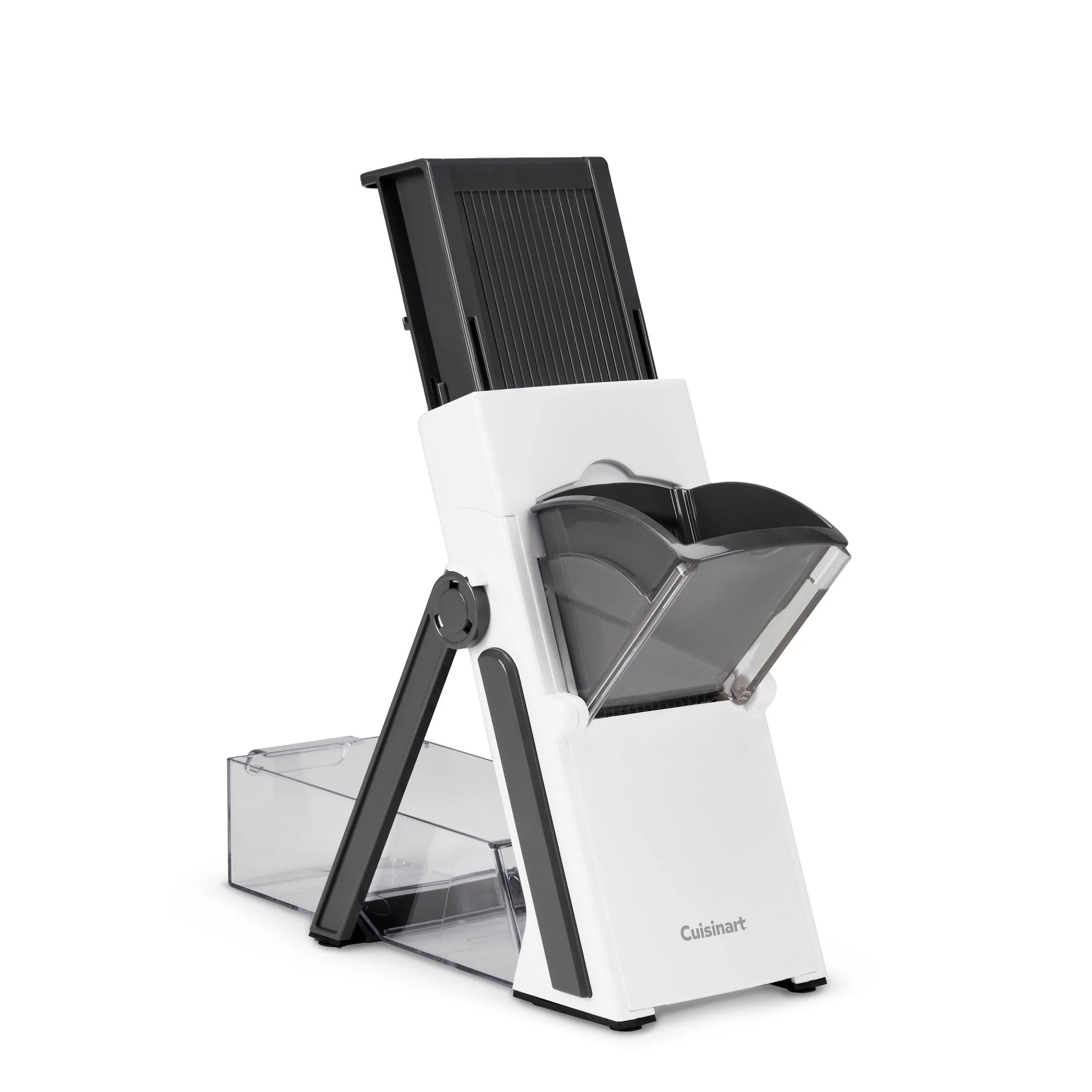 La mandolina vertical PrecisionSlice™ de Cuisinart combina seguridad y versatilidad con un diseño que mantiene las manos alejadas de las cuchillas. Utiliza tecnología exclusiva de cuchillas de procesador de alimentos, transformando frutas y verduras en rodajas uniformes y tiras de juliana finas y gruesas. Con controles deslizantes y una perilla de control, ofrece 42 opciones de grosor ajustable, de 1 a 8 mm. Su tubo de alimentación extra ancho se adapta a cortes grandes de alimentos, y el diseño inclinado alimentado por gravedad garantiza un corte suave y sin esfuerzo.