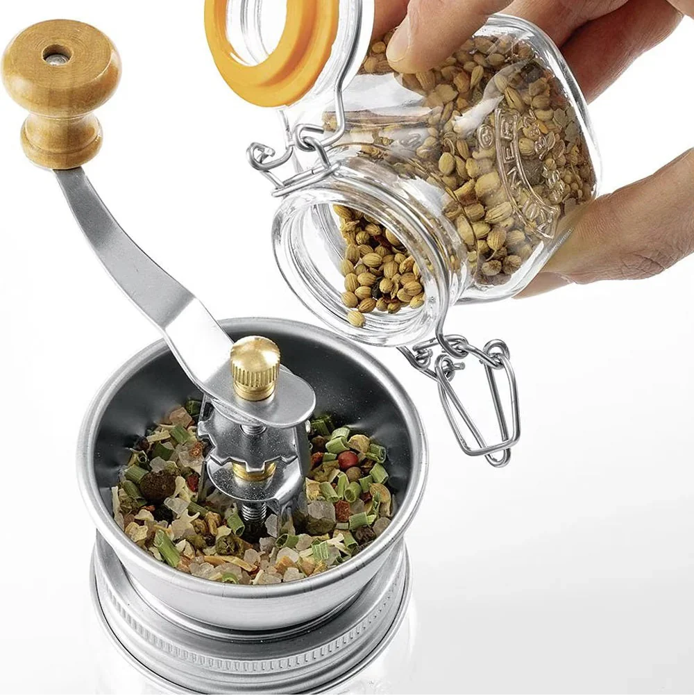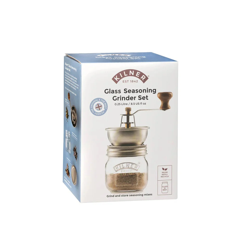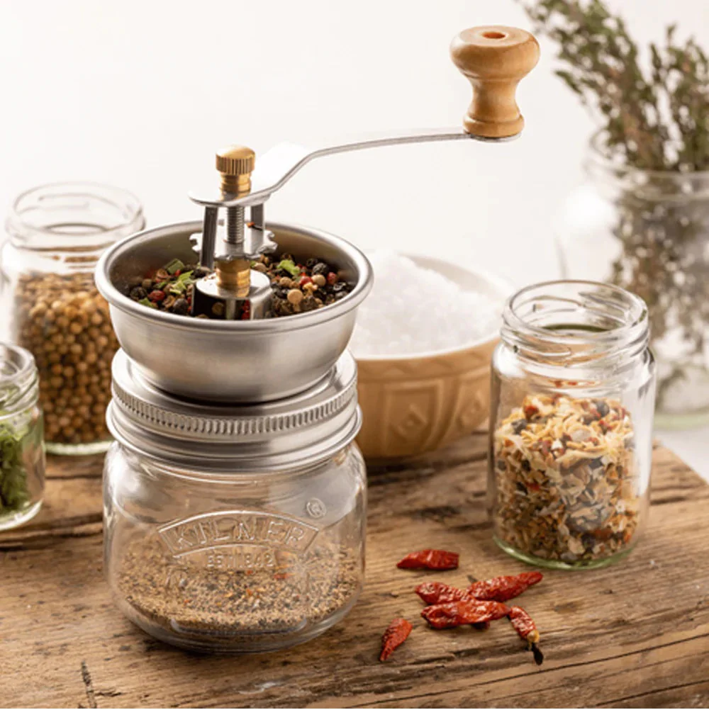 Transforma tu cocina con el Molinillo de Condimentos Kilner®. Ideal para moler y almacenar sal de roca, granos de pimienta, especias, hierbas secas y semillas, este utensilio permite crear mezclas de condimentos personalizadas. Su mecanismo de molienda manual, compuesto por acero inoxidable de alta calidad y piezas de cerámica, cuenta con medidas ajustables para controlar el grosor de la mezcla. El frasco de vidrio de 250 ml mantiene los ingredientes frescos por más tiempo, mientras que la tapa de una sola pieza asegura un cierre hermético. Compatible con frascos de conserva Kilner® de 0,5 y 1 litro, el set incluye un frasco de 0,25 litros, tapa, accesorio para molinillo, recetario y folleto de instrucciones.