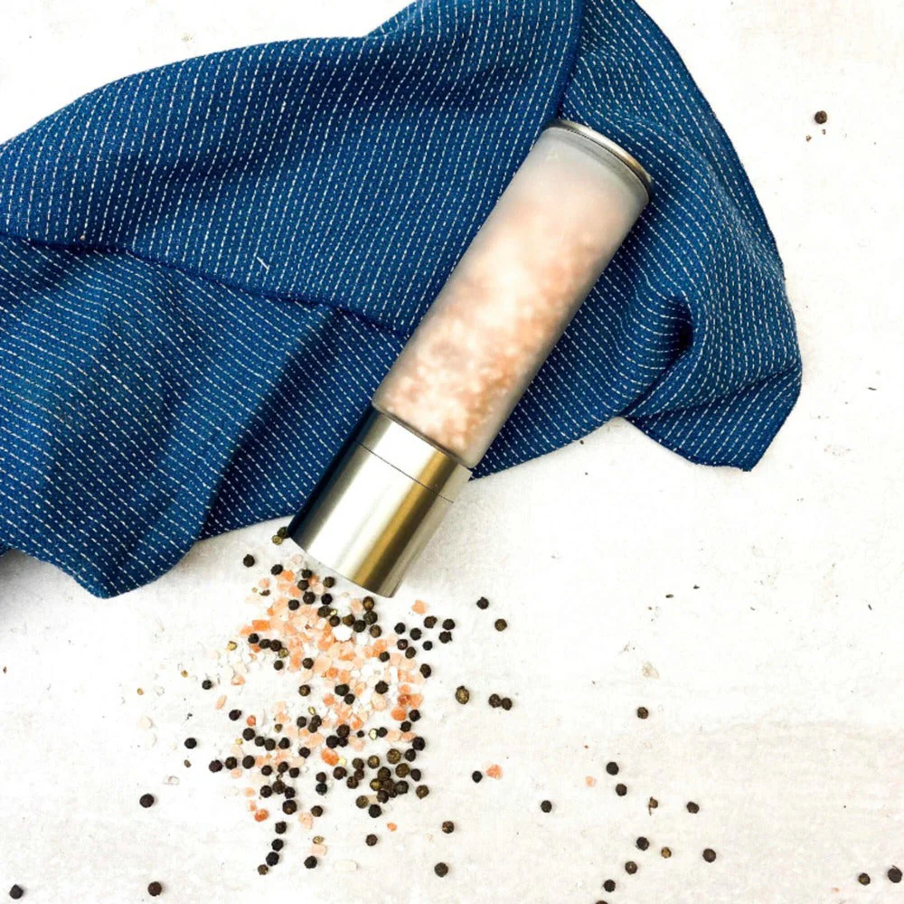 Molinillo para sal y especias con vidrio Frozen y parte inferior acero inoxidable, para que disfrutes de tus productos recién molidos. Viene en caja negra. ¡Regalo ideal para los que aman cocinar! Incluye Sal de Himalaya o Sal de Mar.