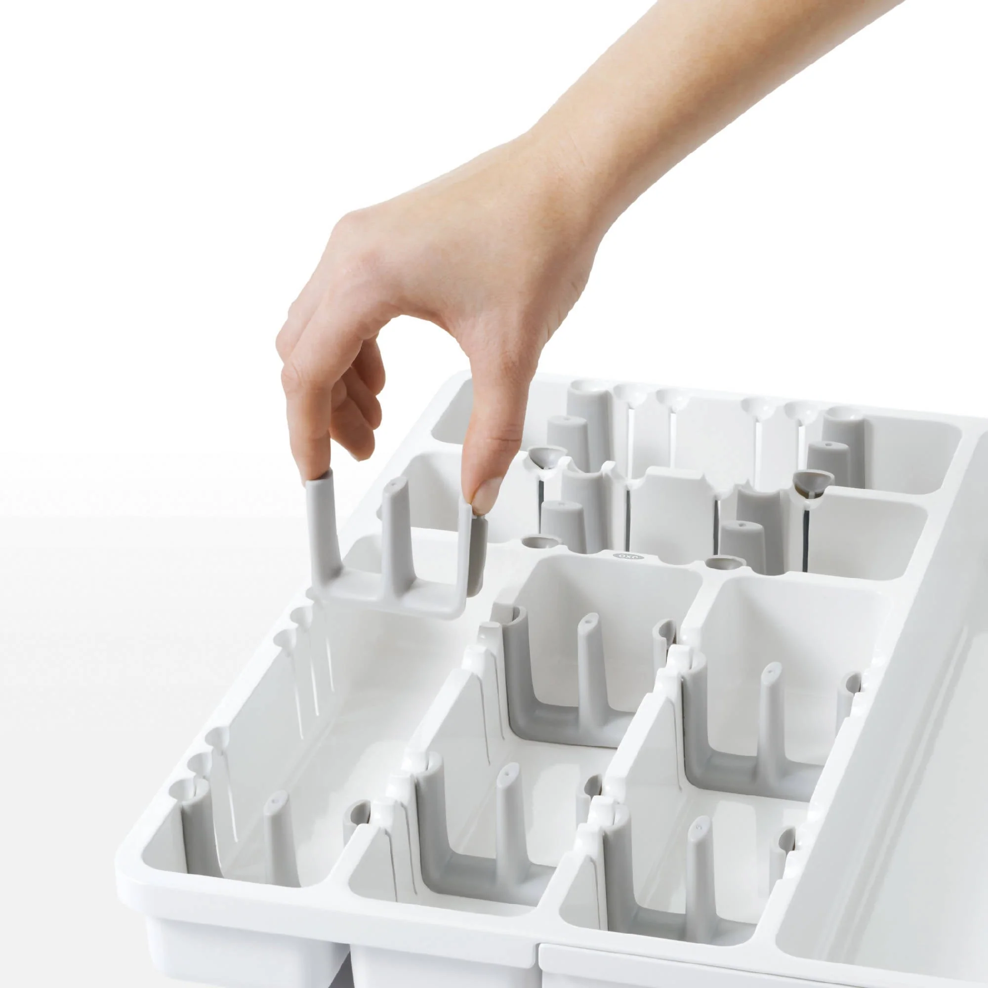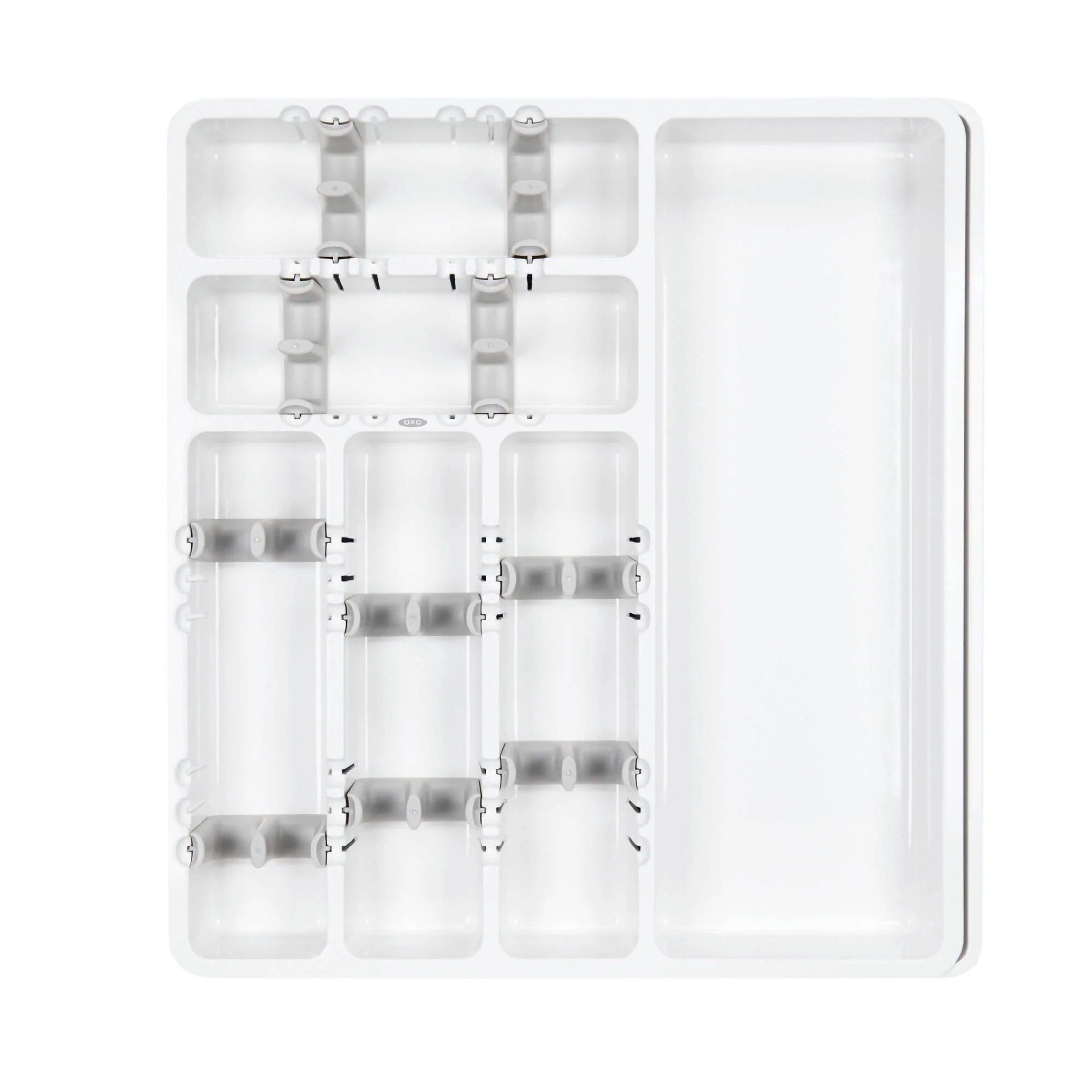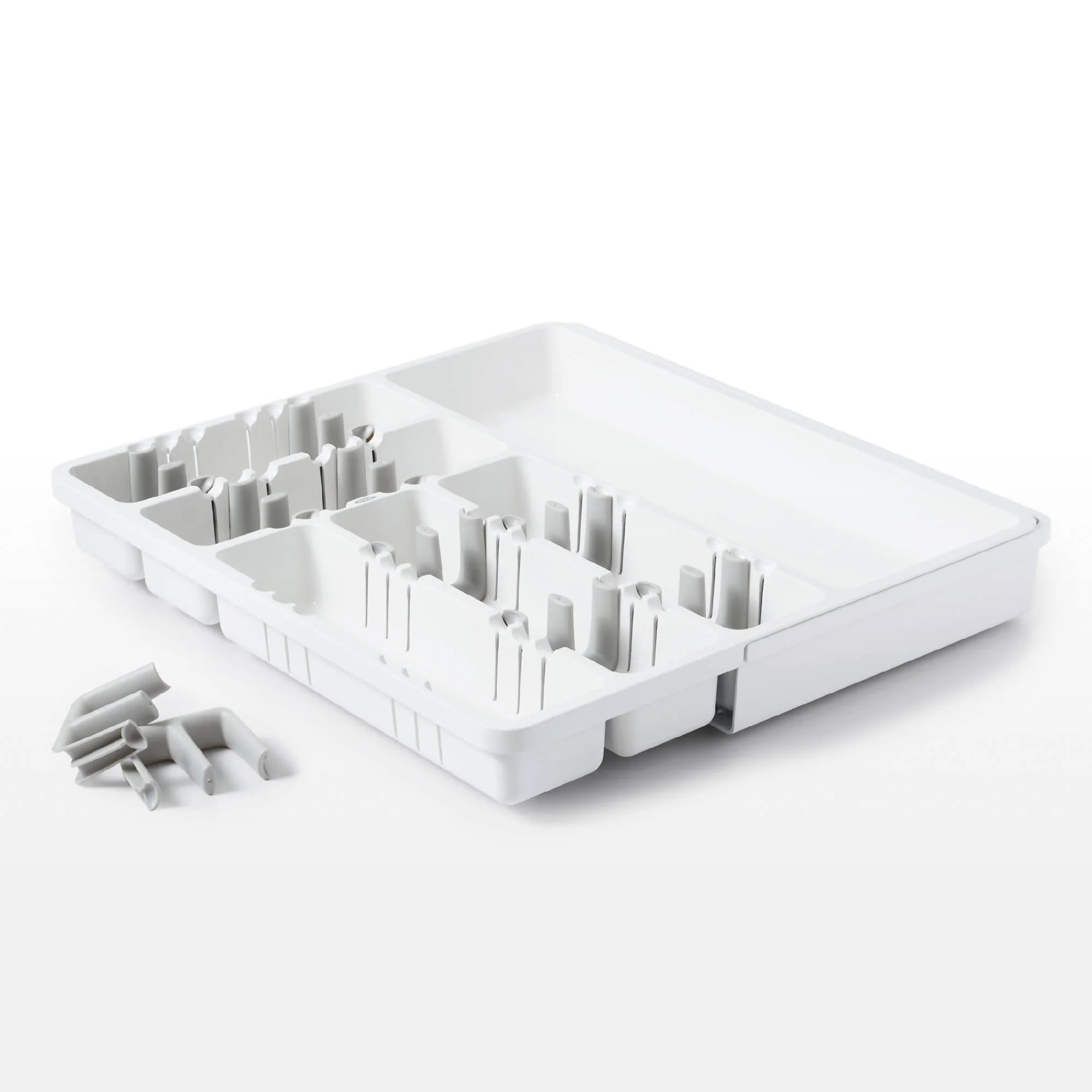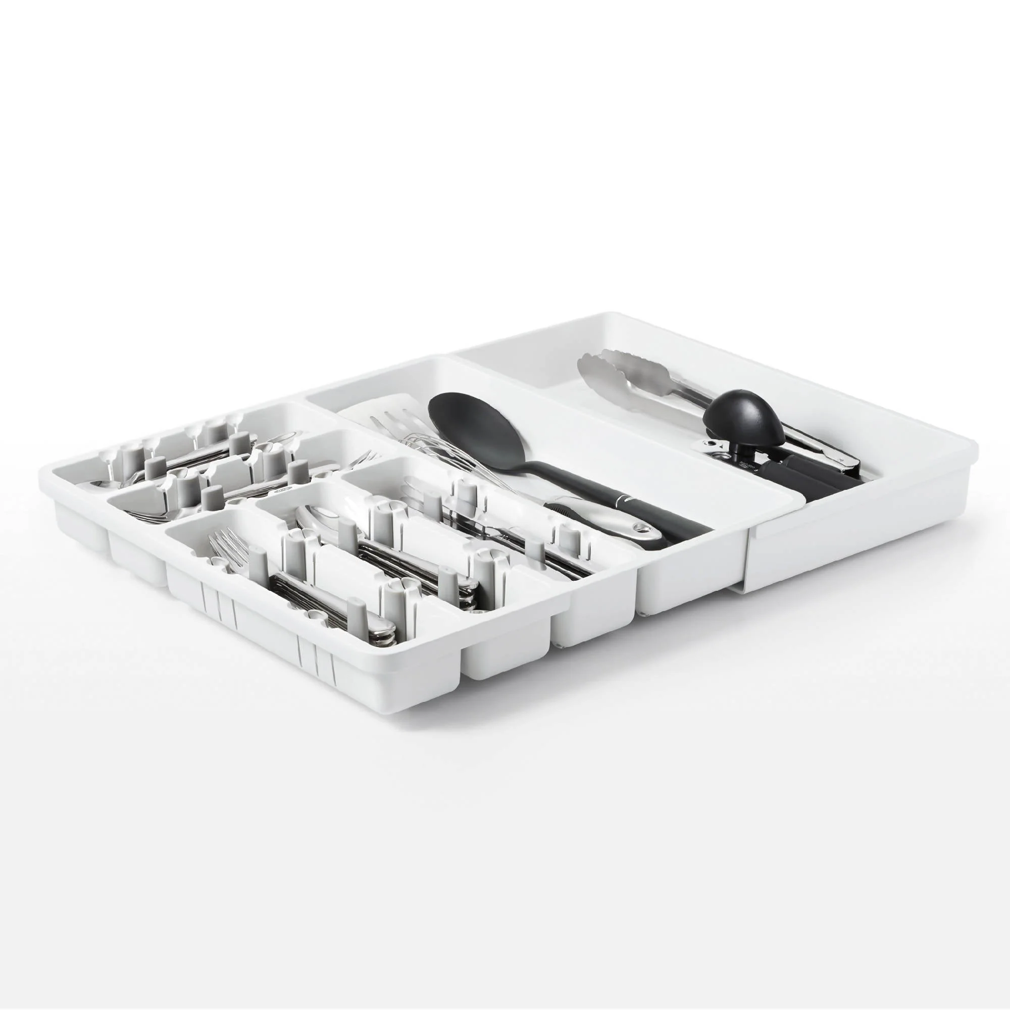 El Porta Cubiertos Extensible Blanco Oxo te permite organizar tus cajones de diferentes tamaños. Tiene divisiones ajustables que permiten apilar tus cubiertos en direcciones opuestas. Además, se extiende para poder guardar utensilios de mayor tamaño. Imagen referencial, no incluye cubiertos.