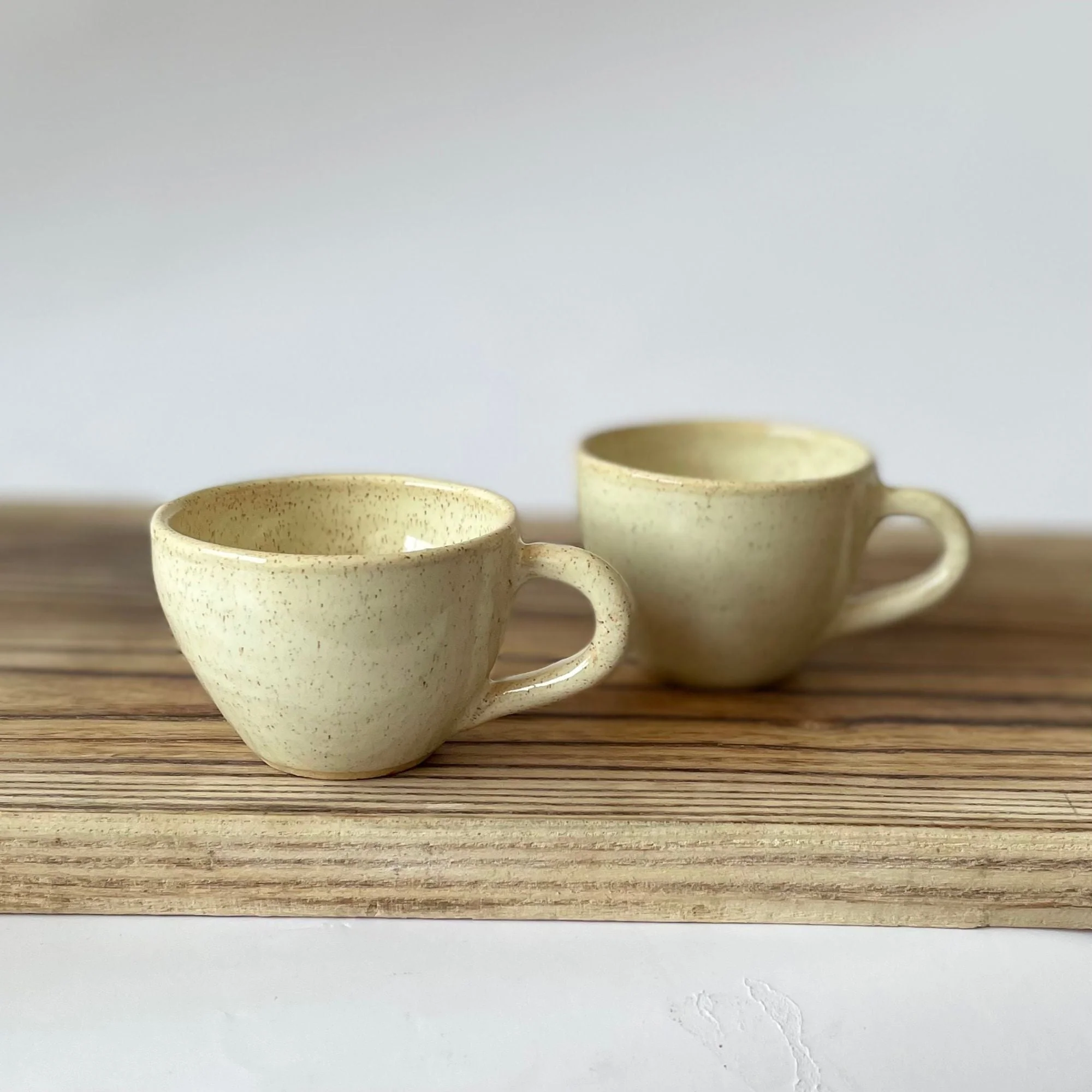 Set de 2 Tazas de café artesanal de cerámica gres, diseño minimalista y asa curva de La Maja Project. Esta tacita simple y elegante es perfecta para disfrutar tu café favorito. Cada objeto es hecho a mano uno por uno en nuestro taller, al igual que los esmaltes. Es por esto que pueden existir pequeñas variaciones entre los tamaños, formas y colores, haciéndolos únicos. Hecho en Chile por La Maja Project. Capacidad 70ml aproximadamente.