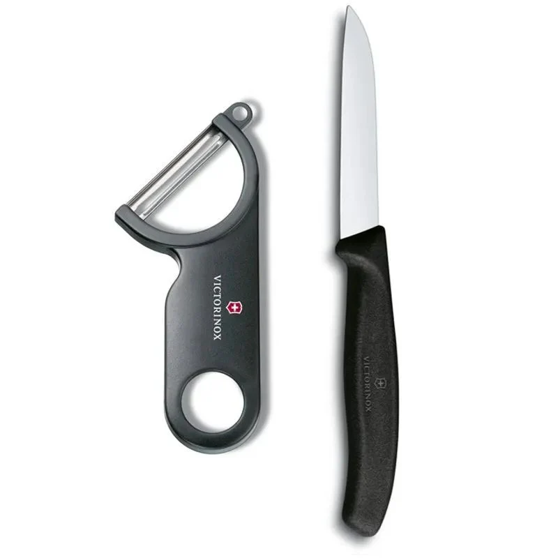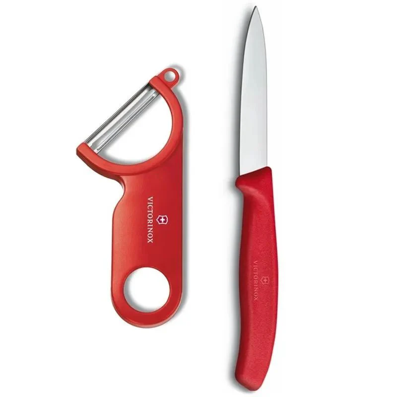 Pack Pelador y cuchillo de verdura 8 cm rojo Victorinox. Pelador de papas con quita marcas, ya sea que esté preparando papas, pepinos, manzanas o zanahorias, el pelador de papas Victorinox permite quitar fácilmente sólo la capa más fina de cáscara. Filo de acero inoxidable, mango ergonómico, junto a la hoja tiene un pequeño orificio para quitar las partes no deseadas. Hecho en Suiza. Cuchillo para verduras, la herramienta más útil del chef para trabajos de precisión en la cocina, de borde afilado y punta centrada. Hoja de 8 cm hecha de acero inoxidable. Hecho en Suiza, filo recto, súper afilado y mango ergonómico.