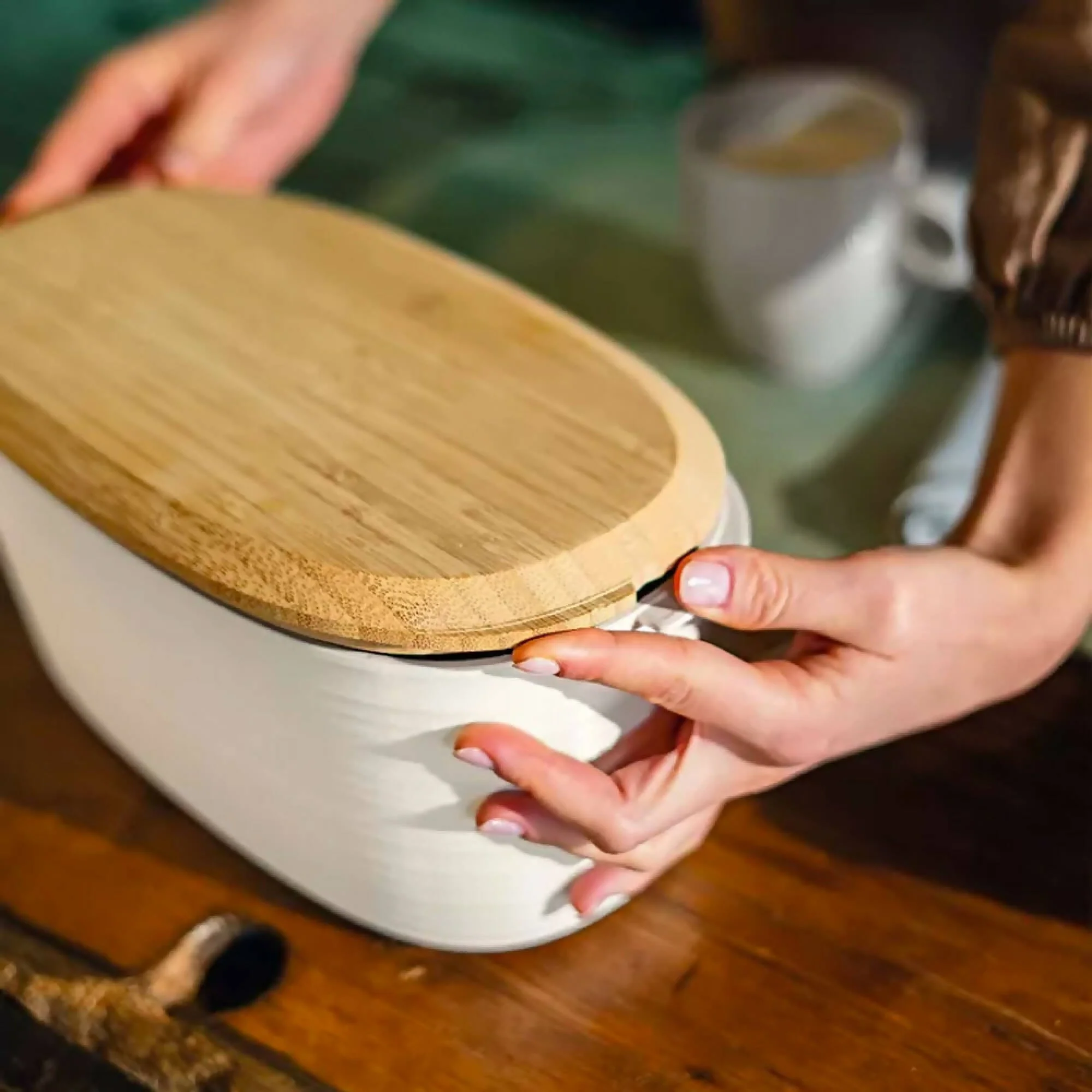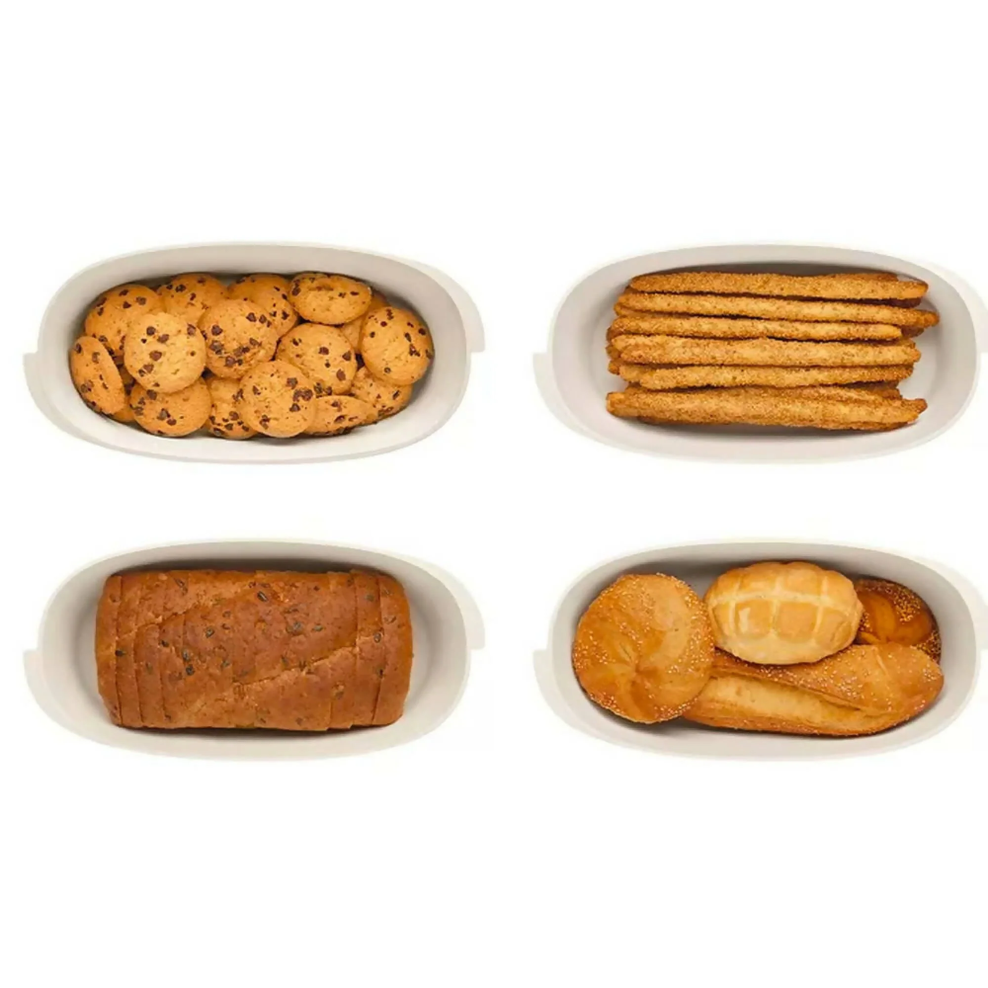 Esta panera además de panera puede ser usada como contenedor para productos de panadería: pan fresco, galletas, palitos de pan, bizcochos, rebanadas de pan para tostar, etc. La panera, que pertenece a la colección Tierra, está fabricado en plástico 100% reciclado post consumo, como todos los artículos de esta colección, y presenta una tapa de madera de bambú con sello stay-fresh y dos prácticas pestañas para facilitar su apertura.