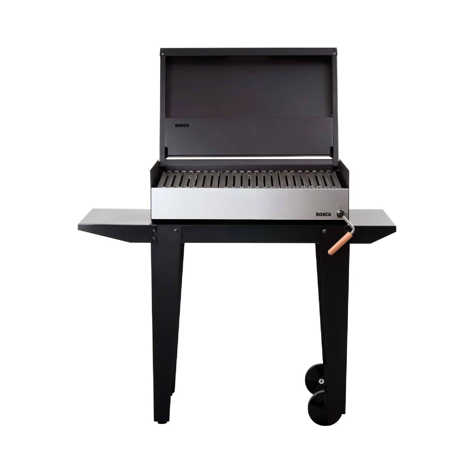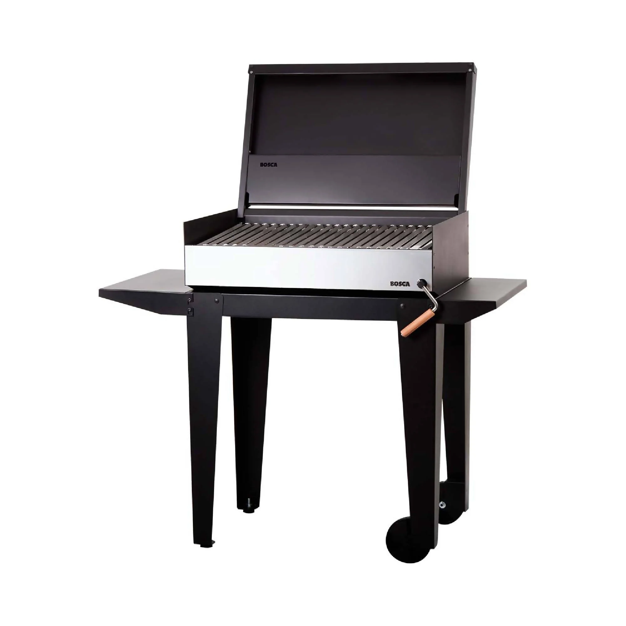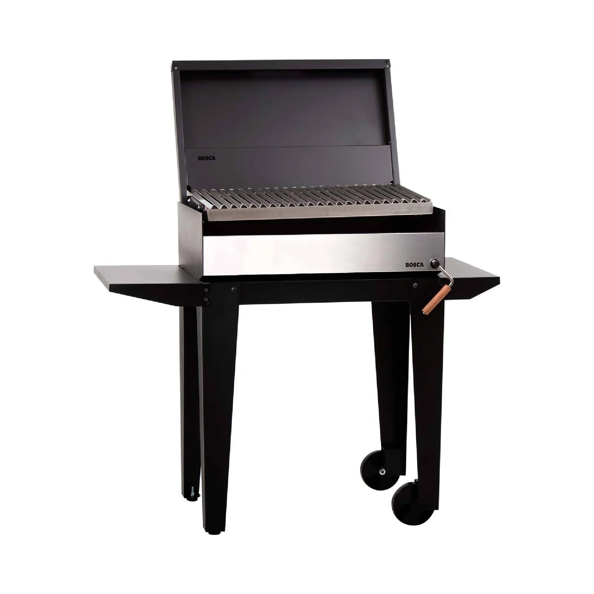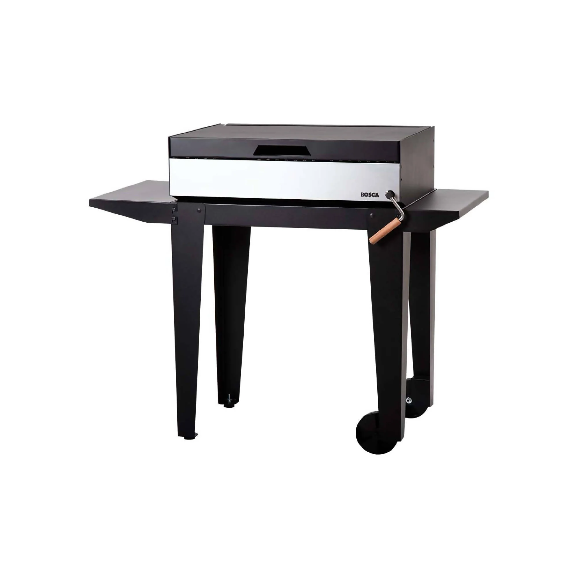Diseño elegante, frontis de inbox A+. Base de ladrillos refractarios. Rejilla en V de acero inoxidable con canal de jugos. Tapa de cierre. Carro de acero con bandejas abatibles. Alzador premium regulable