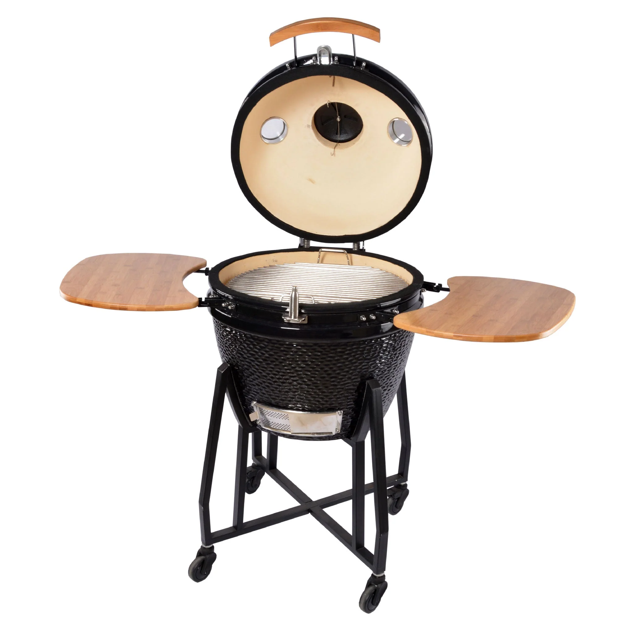 Transforma tus asados la Parrilla Kamado Tokio Ahumador 22″(55,9 cm) 3 en 1. Funciona como parrilla, ahumador y horno. Diseño en cerámica de alta resistencia mantiene la temperatura estable por más tiempo, permitiendo cocciones lentas y jugosas o sellados a alta temperatura. Con rango de calor de 50 °C a 430 °C, esta Parrilla Kamado Tokio es perfecta para técnicas «slow cook» y para preparaciones rápidas. La Parrilla Kamado FDV incluye bandejas plegables de bambú, mango y estructura con patas y ruedas de acero para facilitar su traslado. Además cuenta con control de temperatura, más un termómetro integrado. Este Kamado Kitchen Center es eficiente, elegante y fácil de limpiar. Ideal para quienes disfrutan cocinar al aire libre con estilo y resultados superiores.