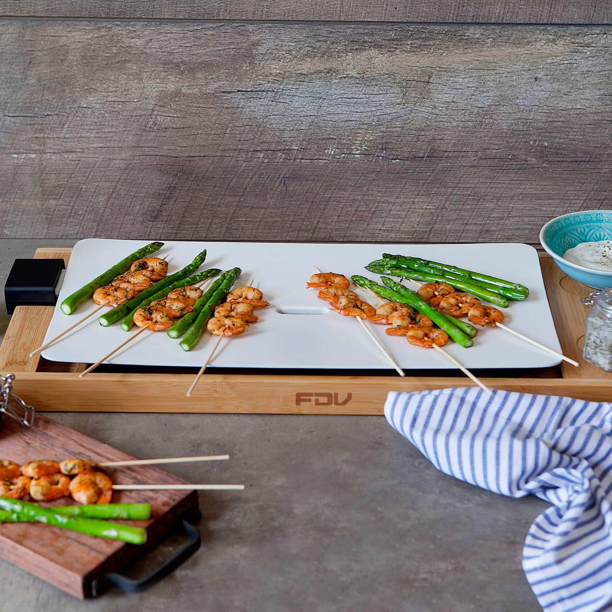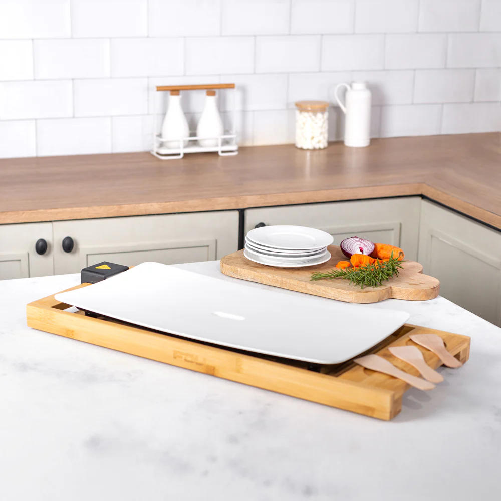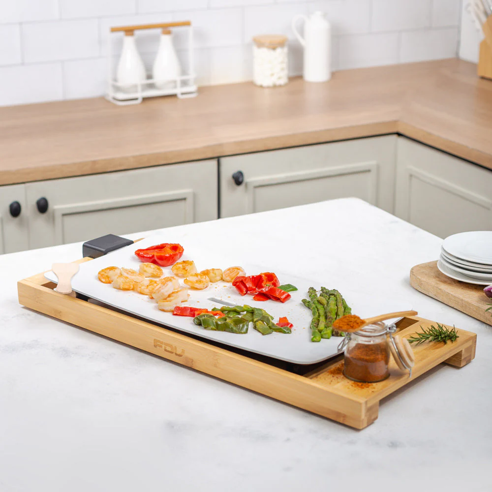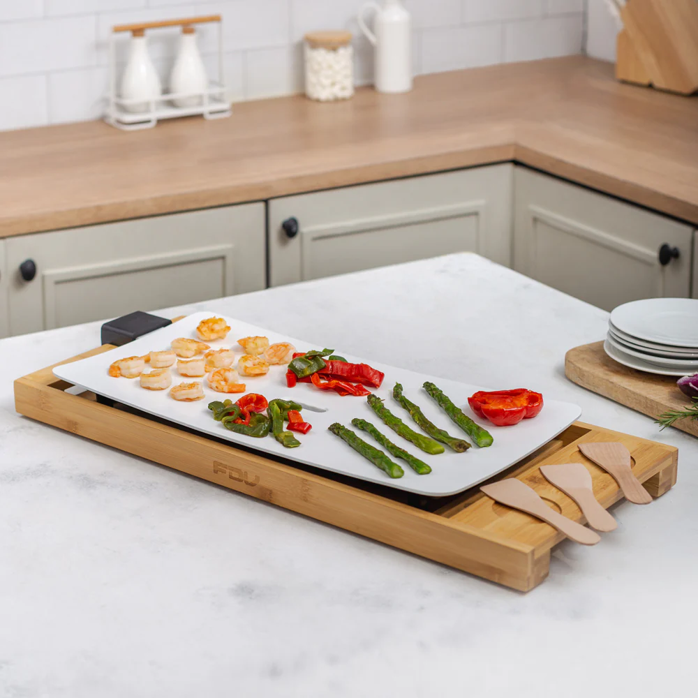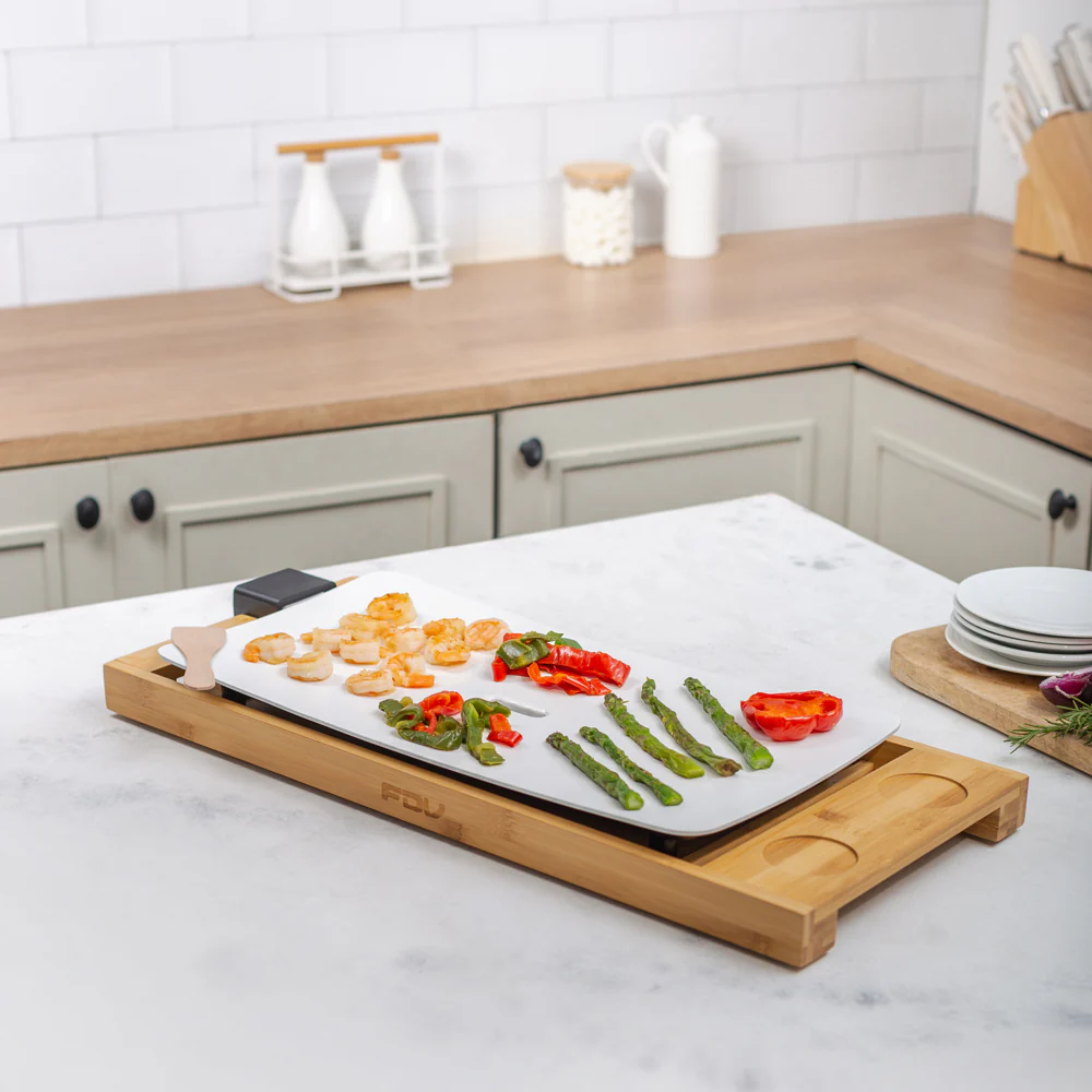 Te presentamos nuestra plancha Teppanwood de FDV, con una preciosa base de madera de bambú, una amplia superficie de ceramica y calor hasta los 210°C. Cocina verduras, carnes de manera saludable en su plancha completamente antiadherente que además cuenta con un deposito de grasa en el centro. Las piezas de la Tepanwood son desmontables por lo que también será un agrado lavarla.
