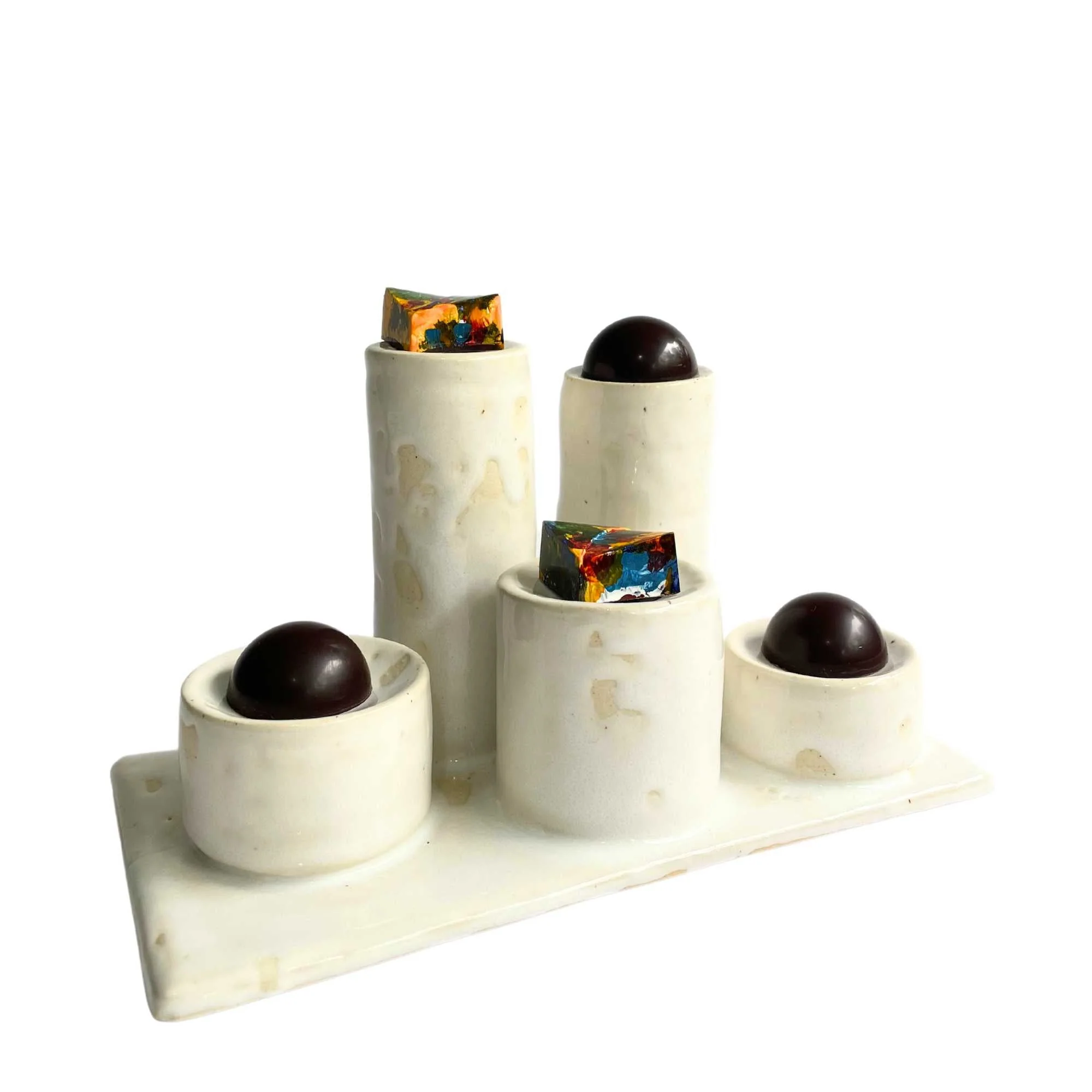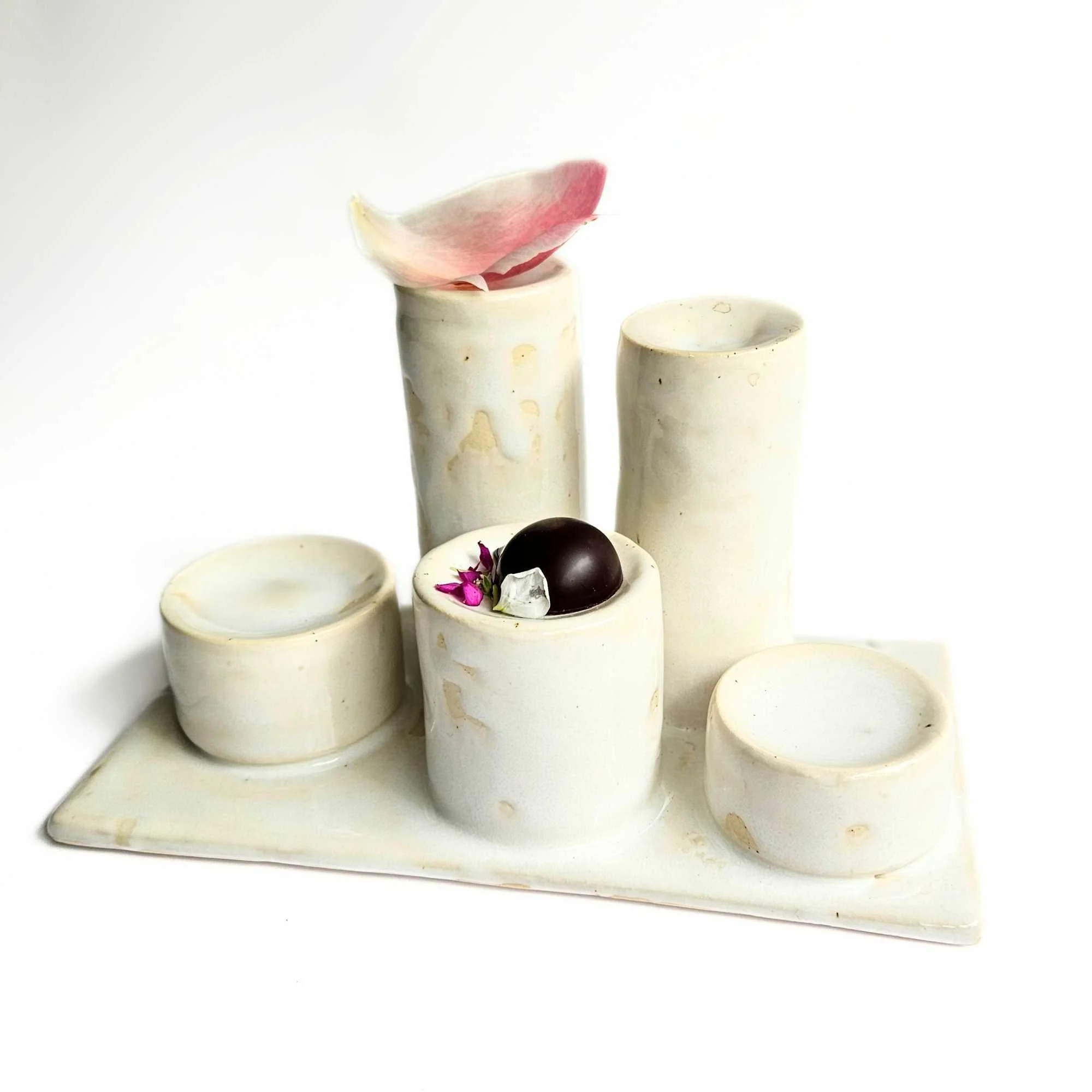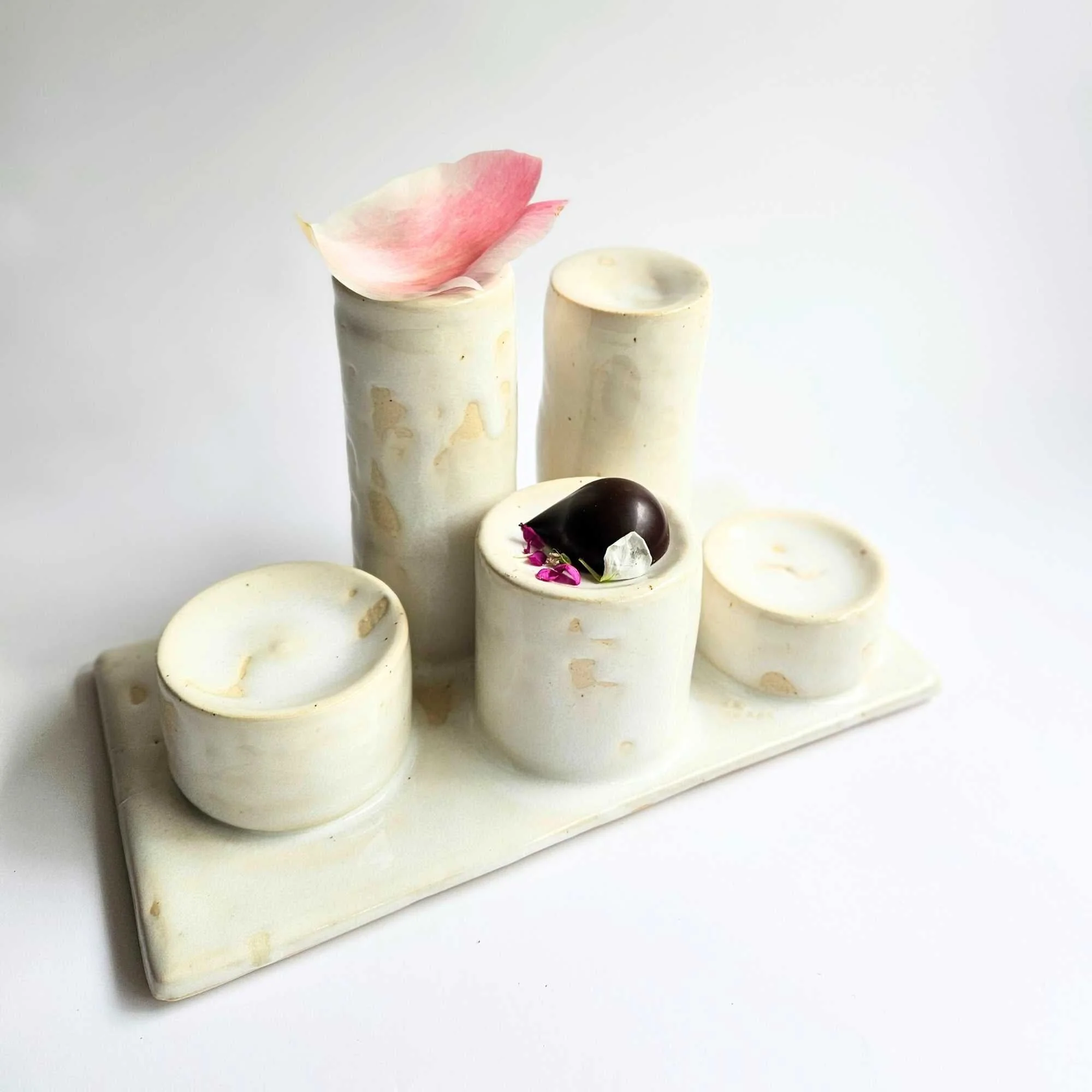 «Ritual» es una línea exclusiva de piezas y platos en cerámica de gres, elaborados de forma artesanal, con inspiración en objetos litúrgicos y ceremoniales. Esta interpretación del ritual llevado a la mesa, se convierte en lienzo ideal para servir una amplia variedad de platos, desde entradas y ensaladas hasta platos principales y postres. Cada objeto es hecho a mano uno por uno en nuestro taller, al igual que los esmaltes. Es por esto que pueden existir pequeñas variaciones entre los tamaños, formas y colores.