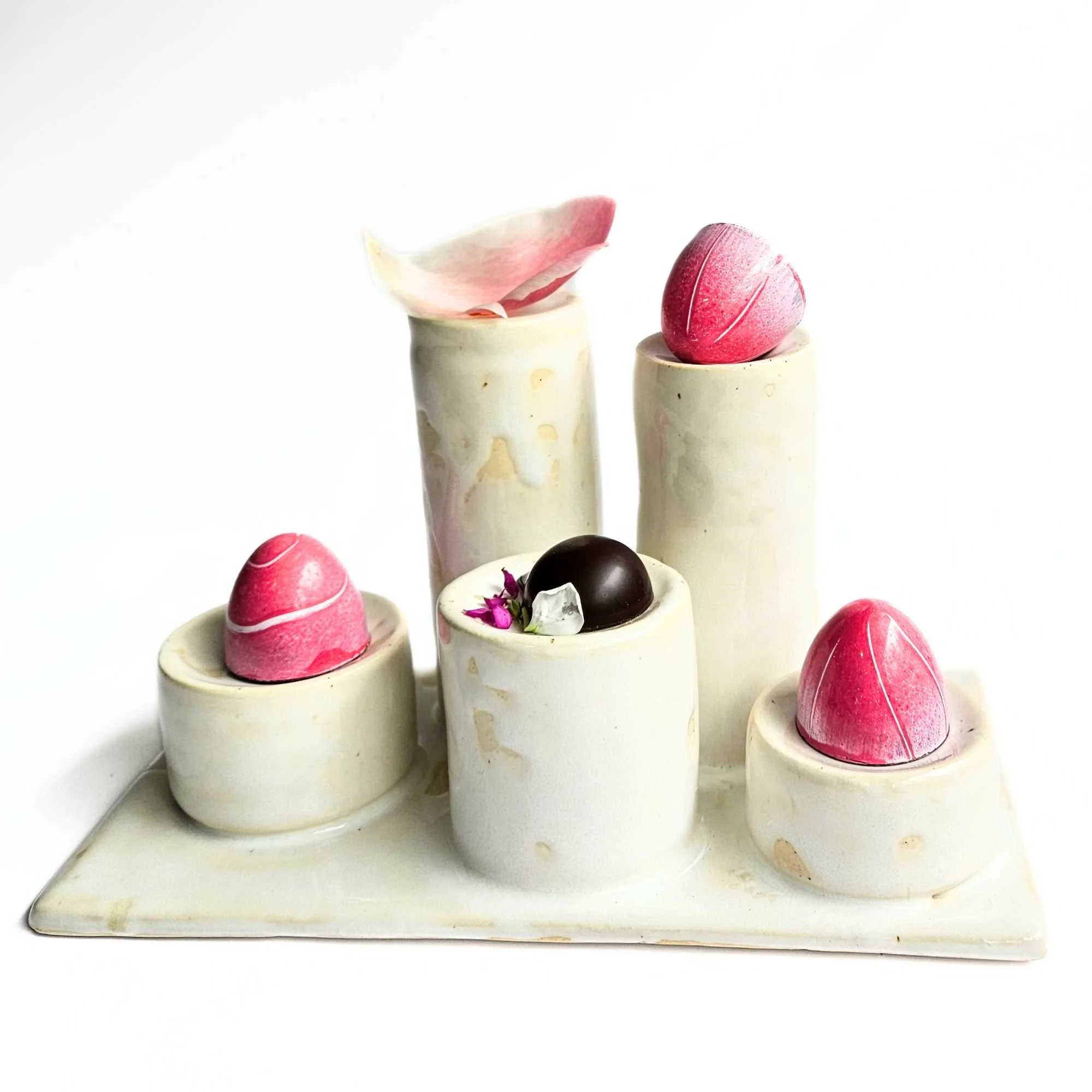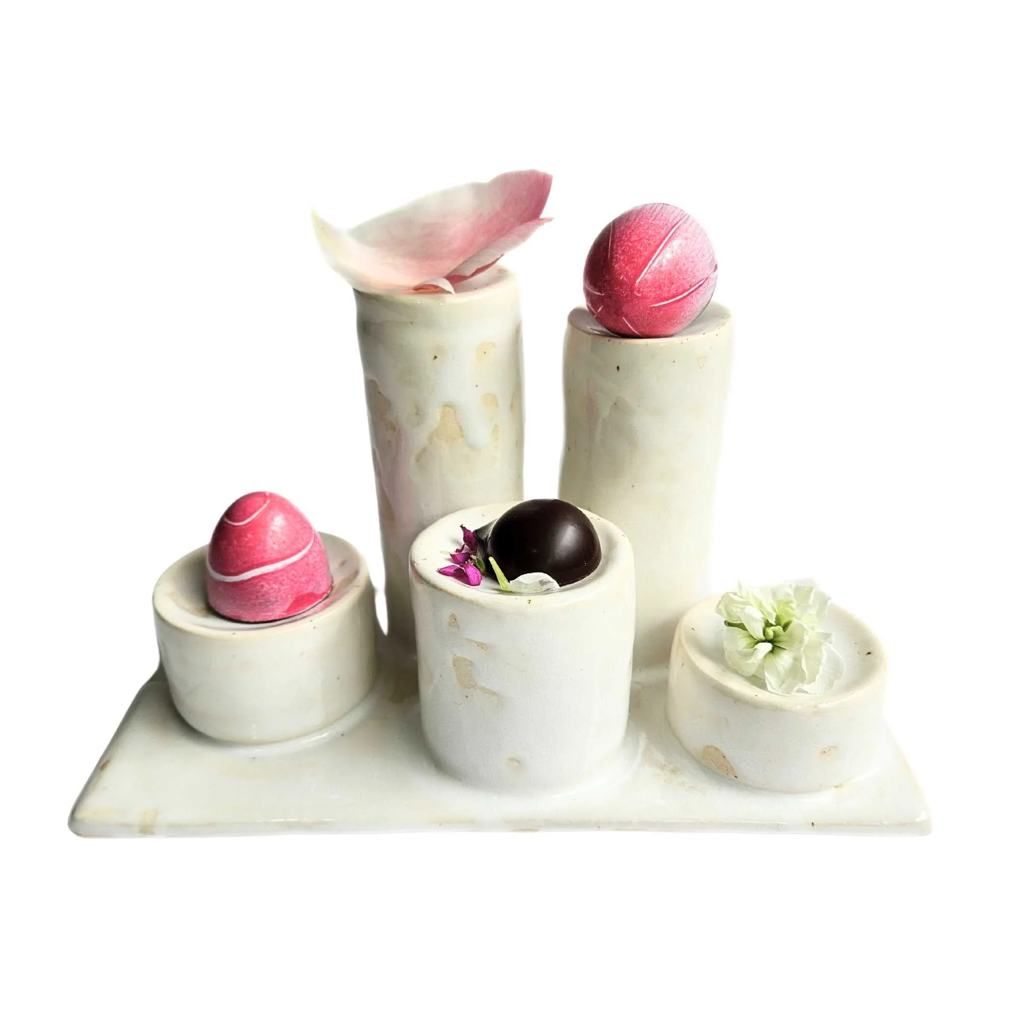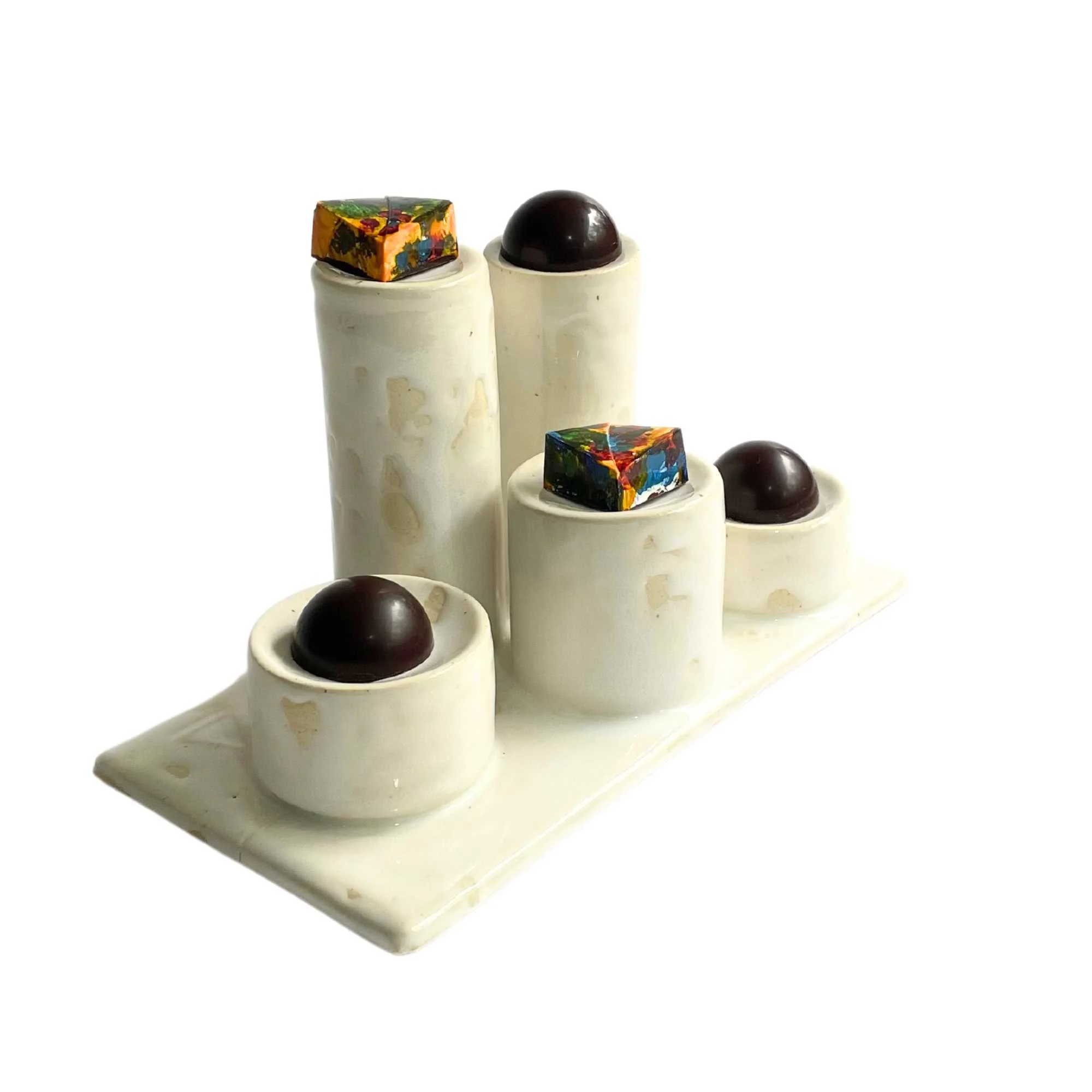 «Ritual» es una línea exclusiva de piezas y platos en cerámica de gres, elaborados de forma artesanal, con inspiración en objetos litúrgicos y ceremoniales. Esta interpretación del ritual llevado a la mesa, se convierte en lienzo ideal para servir una amplia variedad de platos, desde entradas y ensaladas hasta platos principales y postres. Cada objeto es hecho a mano uno por uno en nuestro taller, al igual que los esmaltes. Es por esto que pueden existir pequeñas variaciones entre los tamaños, formas y colores.